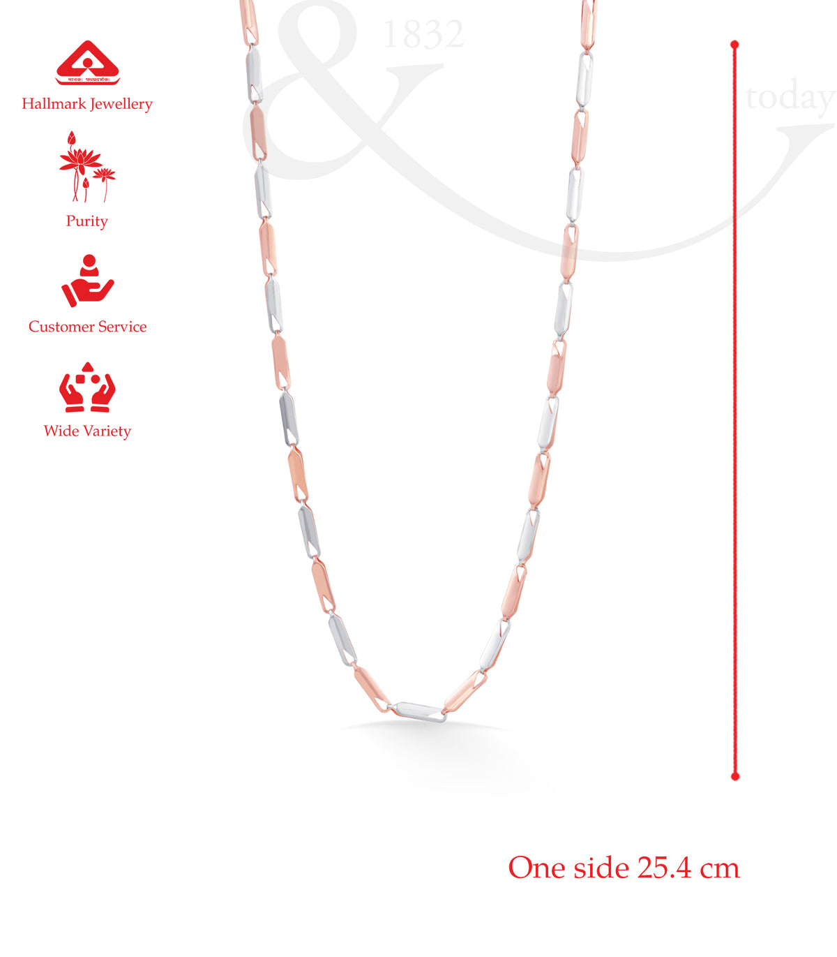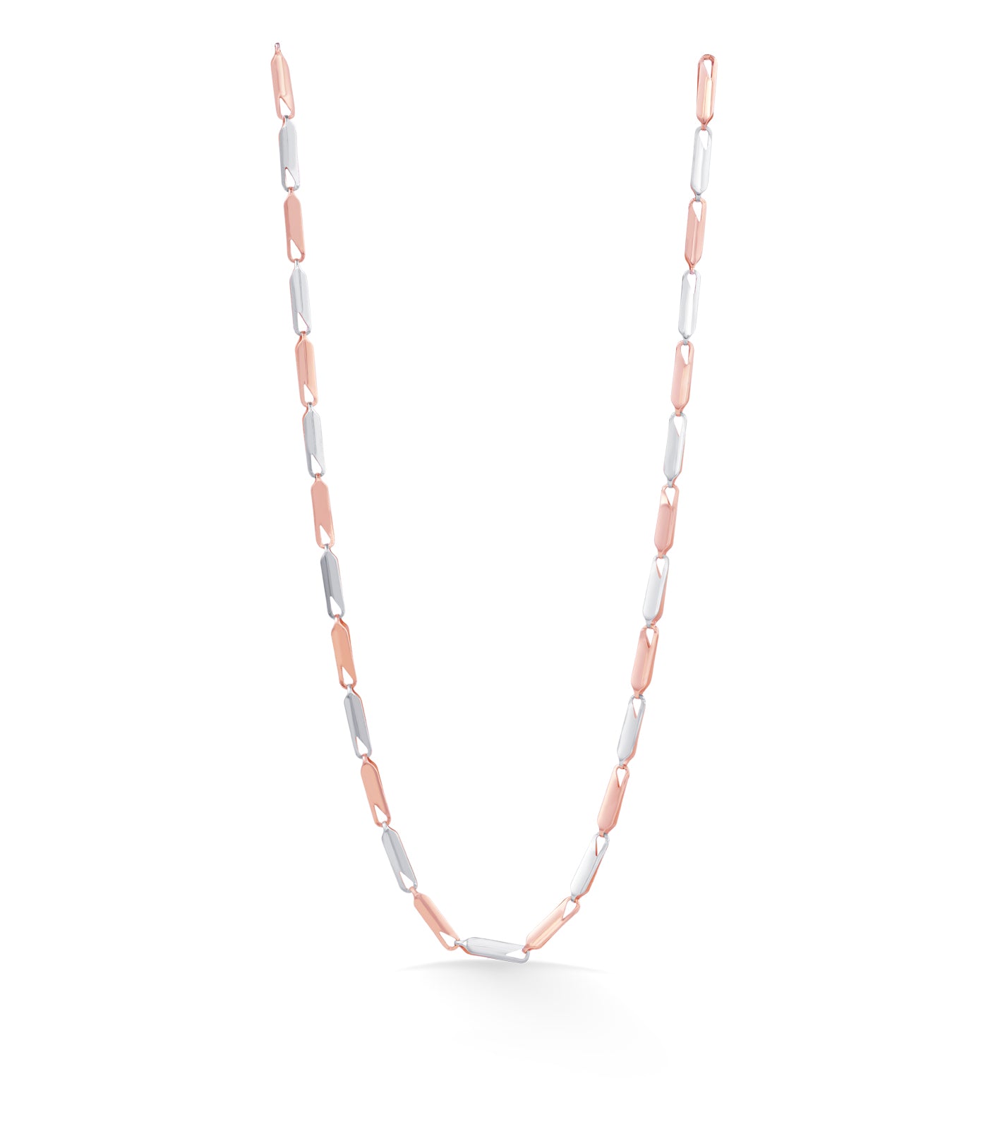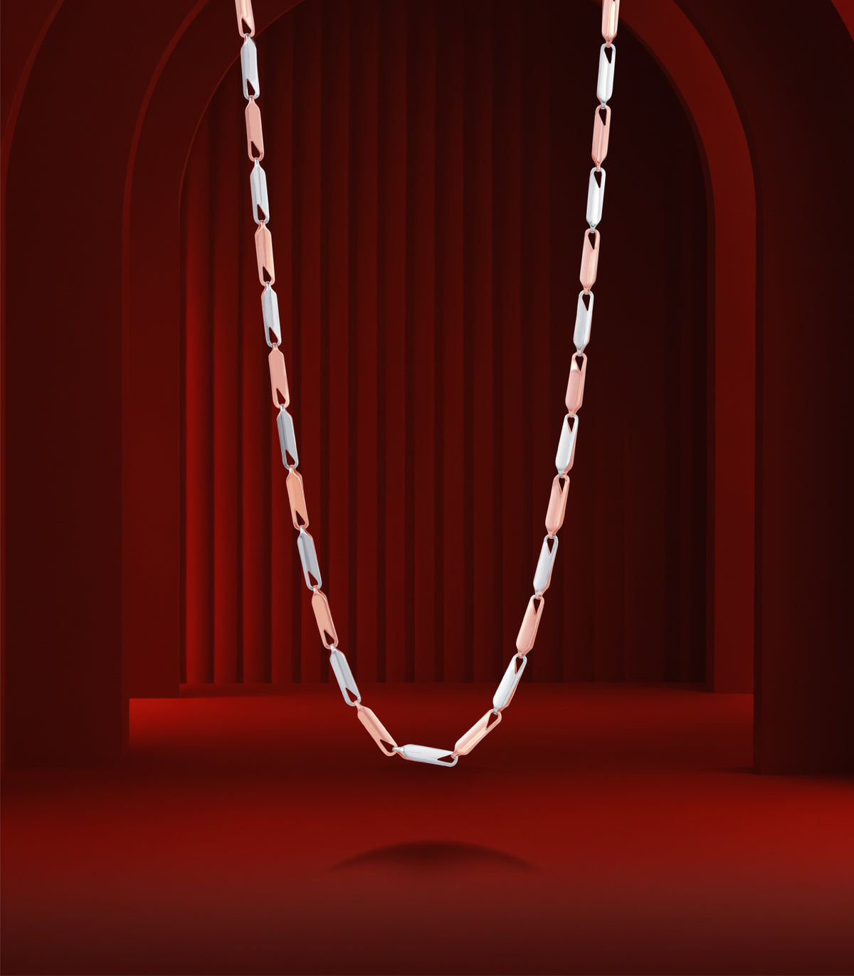 The Dual Edge Rose Gold Chain blends modern masculinity with refined design. Crafted in alternating tones of rose and white gold, each angular link reflects strength and sophistication. It’s more than a chain — it’s a statement of balance, boldness, and understated luxury.