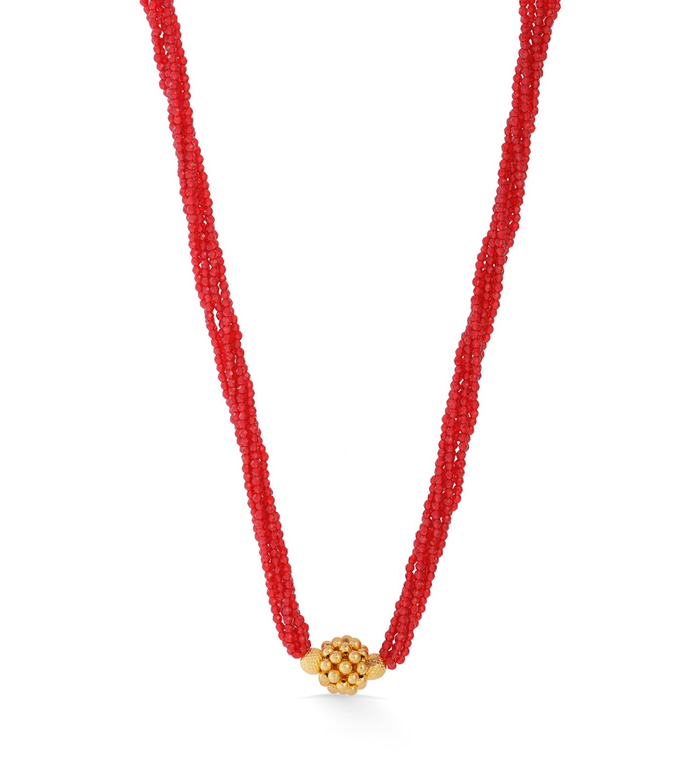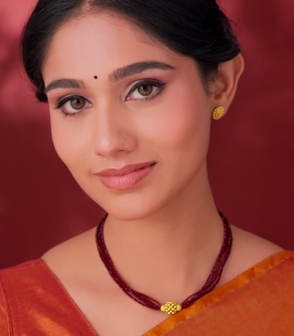 Design: The striking contrast of rich maroon beads against the luminous gold pendant creates a statement necklace that blends tradition with refined elegance.