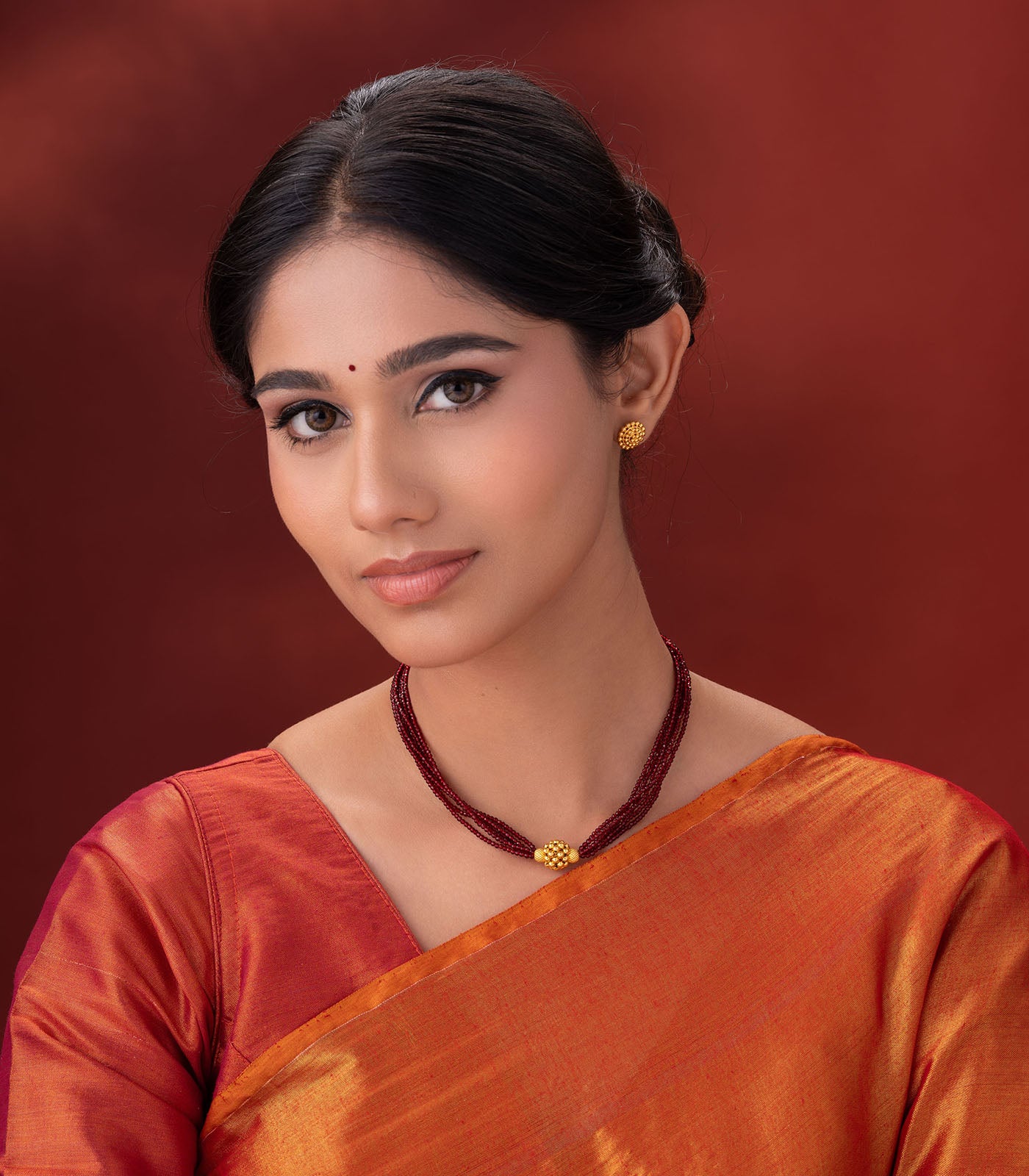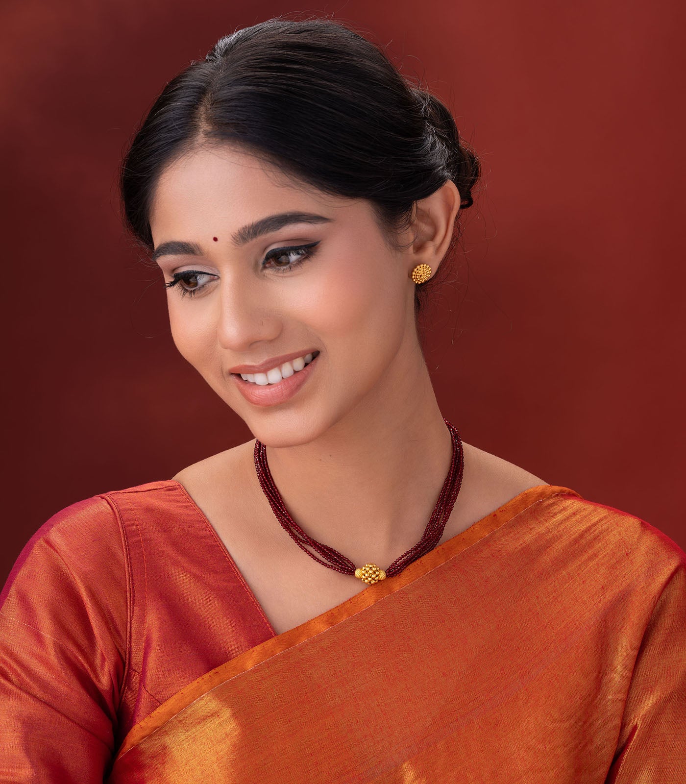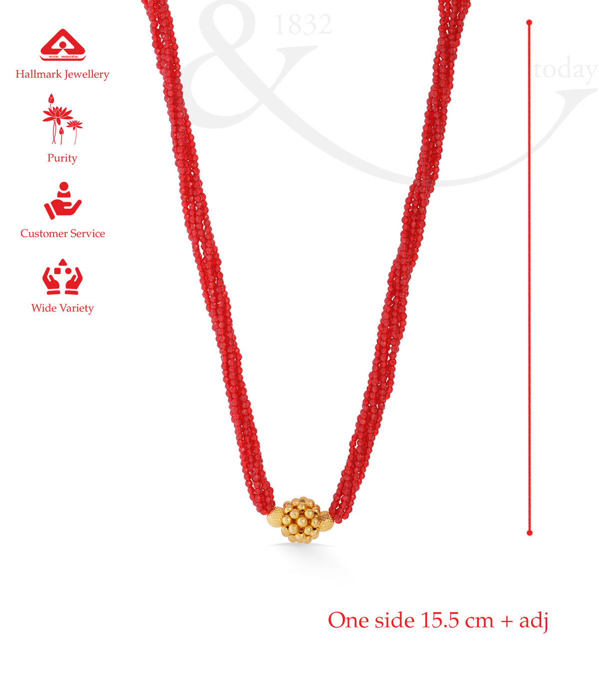 Material: Crafted in pure 22K hallmarked gold, featuring deep maroon beads delicately strung together with a radiant gold pendant centerpiece.