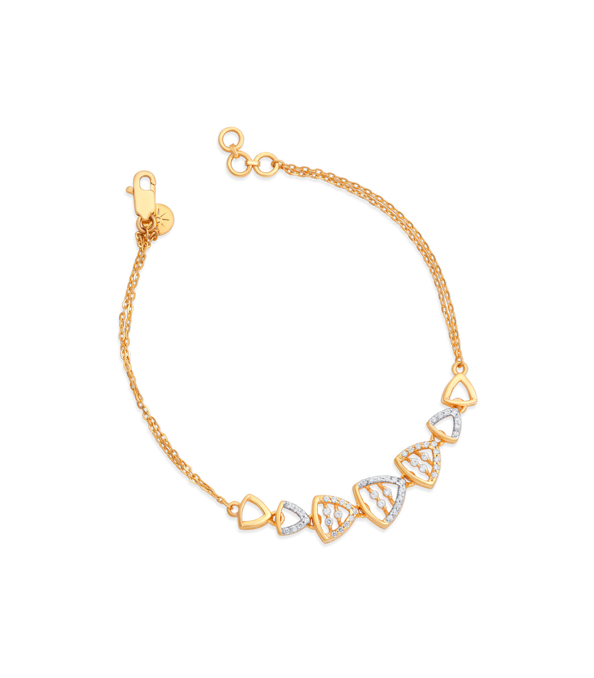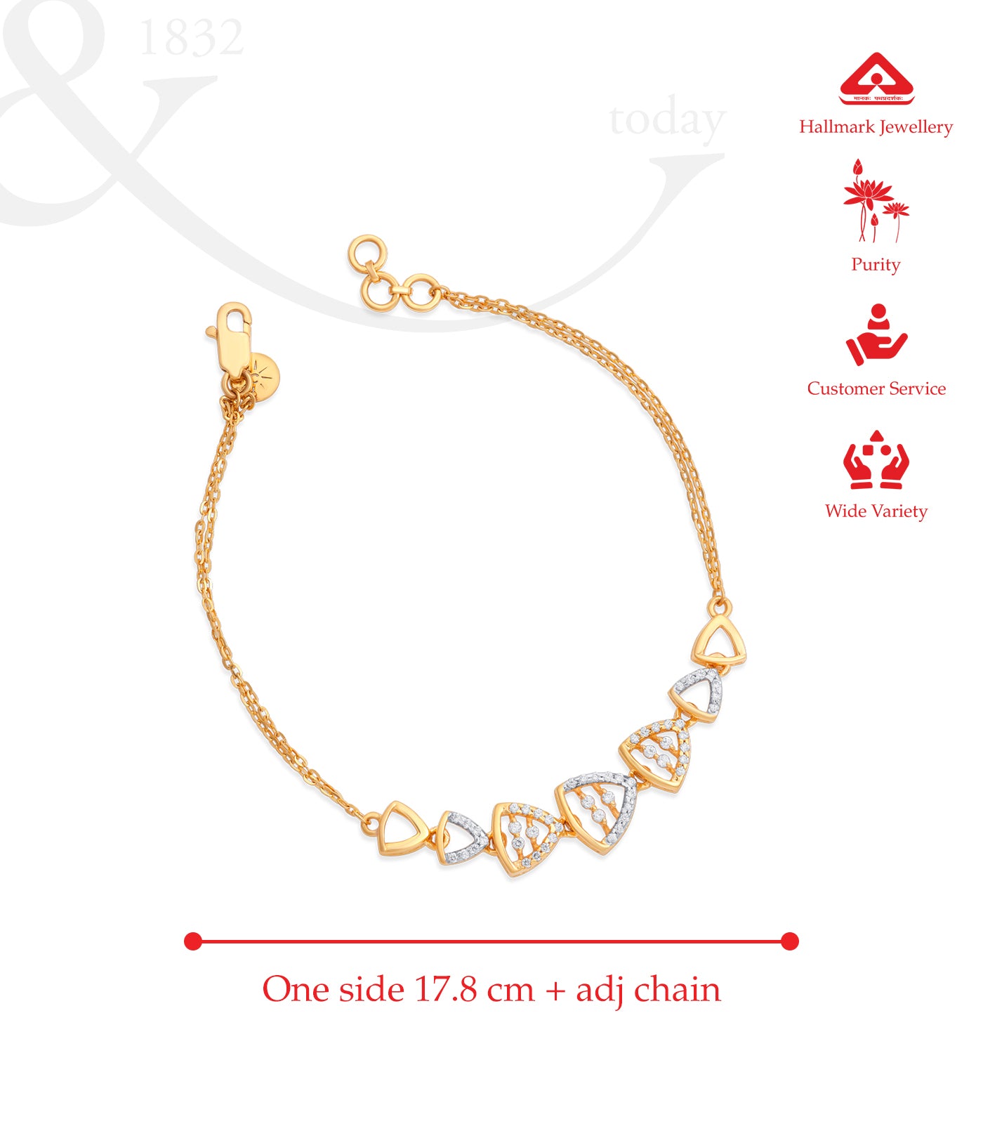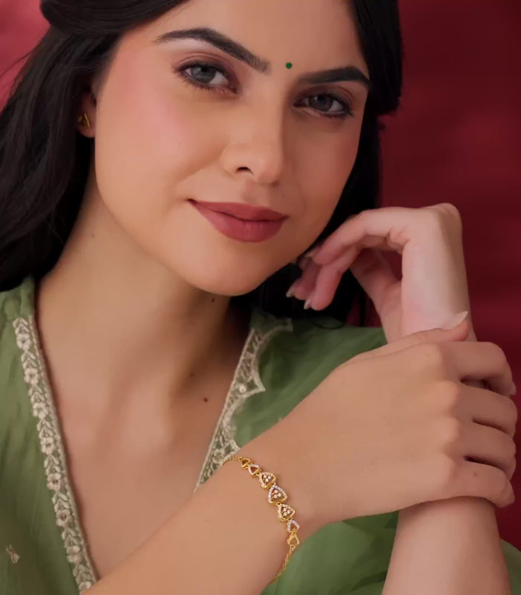 Celebrate love and elegance with the Golden Prism Bracelet by P.N. Gadgil & Sons. Featuring a series of beautifully designed heart motifs embellished with sparkling accents, this bracelet exudes charm and sophistication. Its delicate craftsmanship and radiant gold-tone finish make it an ideal choice for everyday wear, festive occasions, or as a thoughtful gift for someone special.