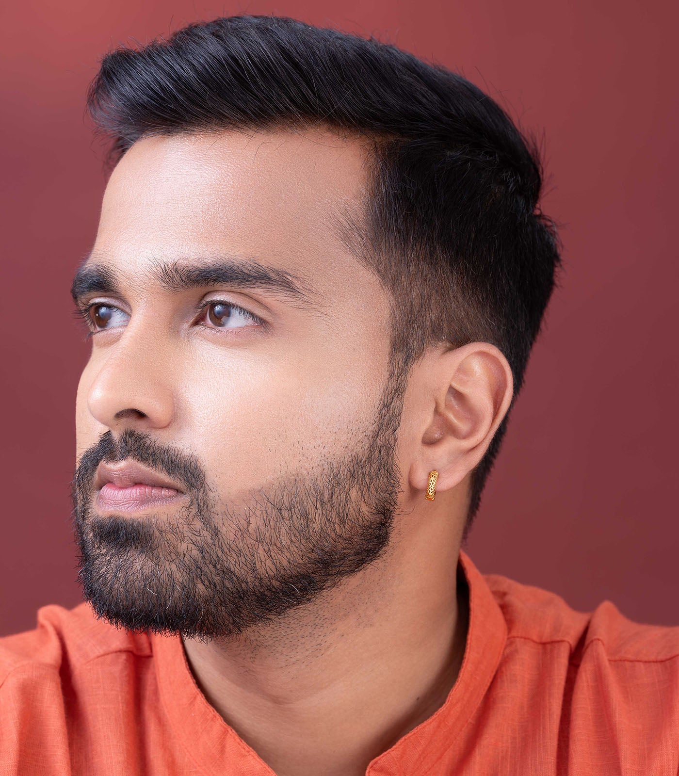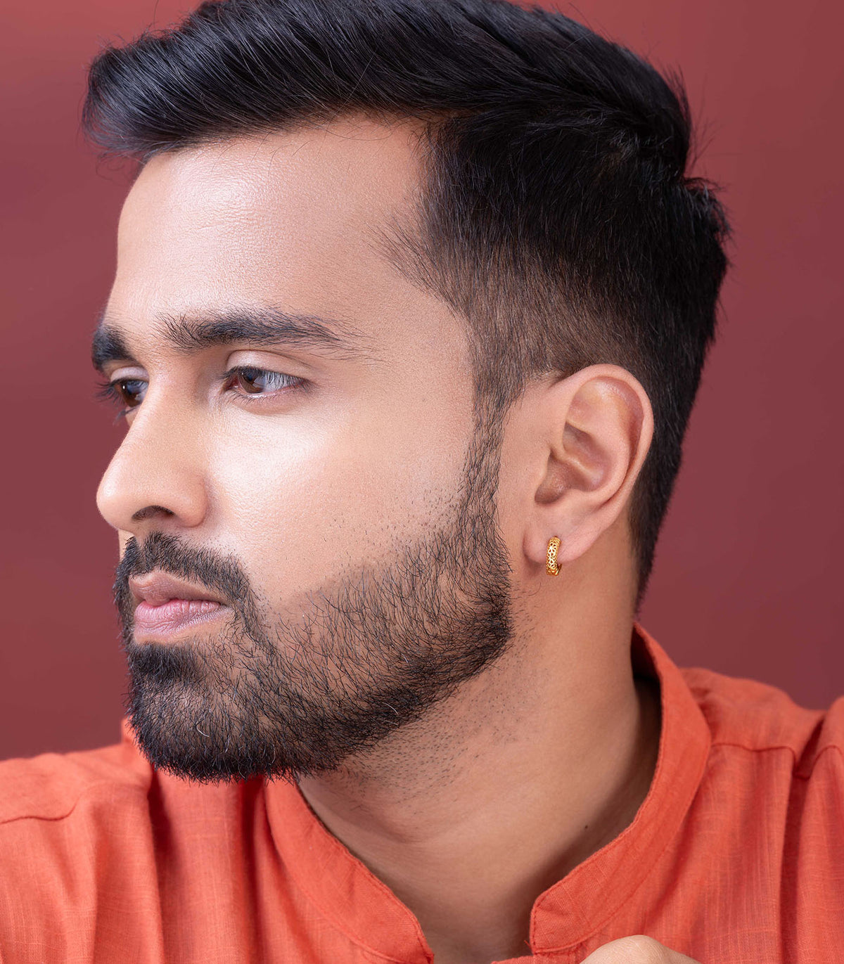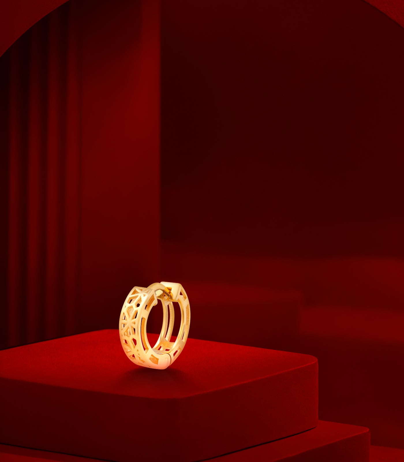 The Geometric Cutwork Gold Bali by P.N. Gadgil & Sons is a modern interpretation of timeless elegance. Crafted in 22KT yellow gold, this hoop showcases intricate cutwork patterns that create a striking play of light and form. Its bold yet refined design makes it perfect for women who value both tradition and contemporary flair.