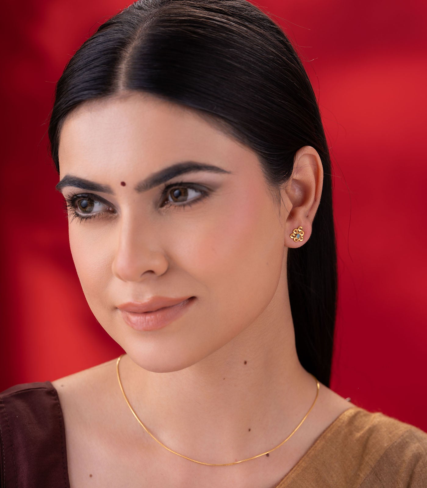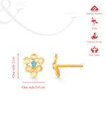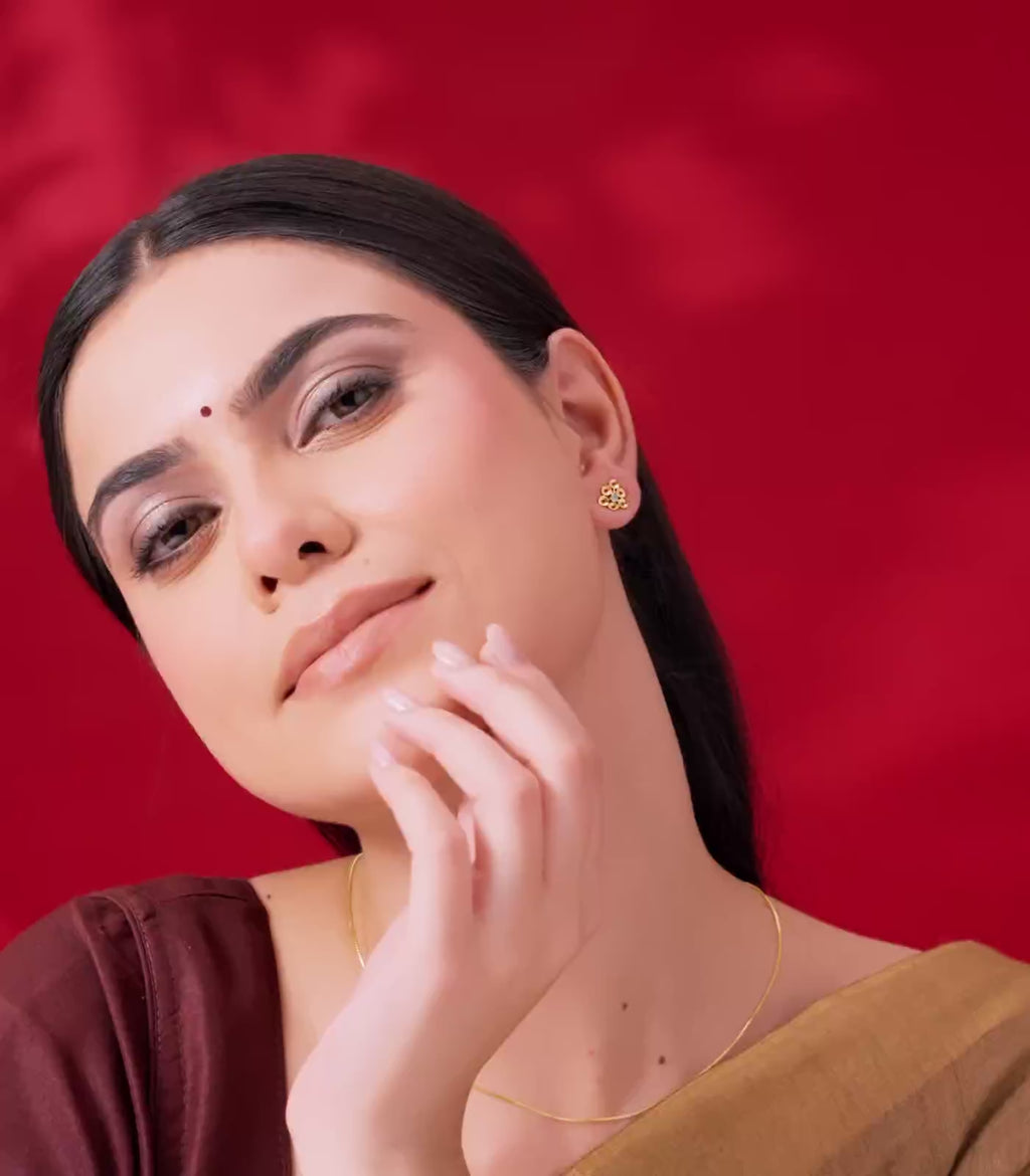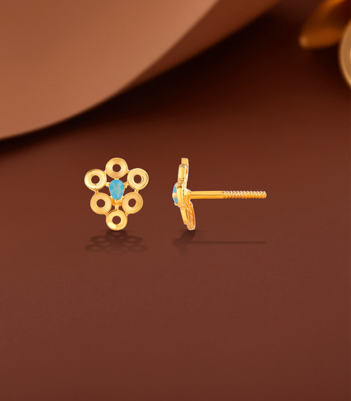 The Azure Bloom Tops blend artistic geometry with a touch of color. Featuring a striking pear-shaped blue stone at the center, these tops radiate charm through their unique circular floral pattern and modern matte-gold finish.