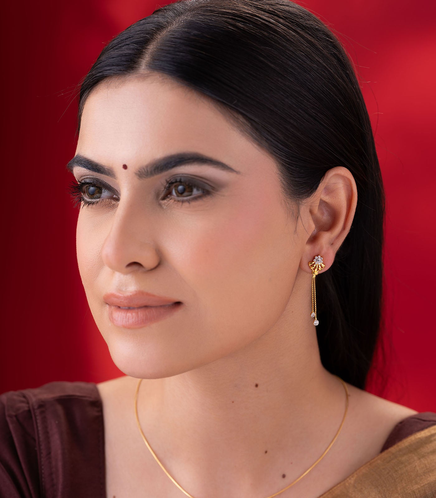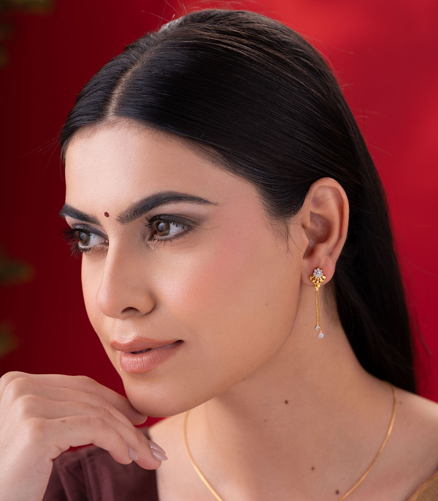 The Dazzling Cascade Tops redefine elegance with their graceful drop-chain design. The floral sparkle at the top blooms into a sleek double-chain accent, finished with radiant stones — creating a dance of light and movement.