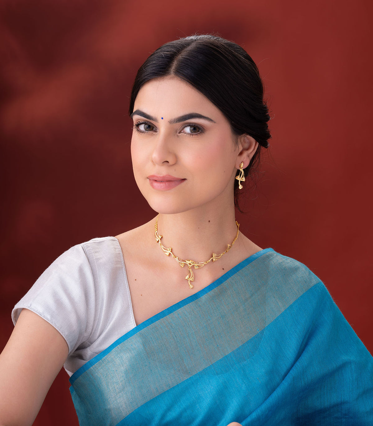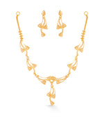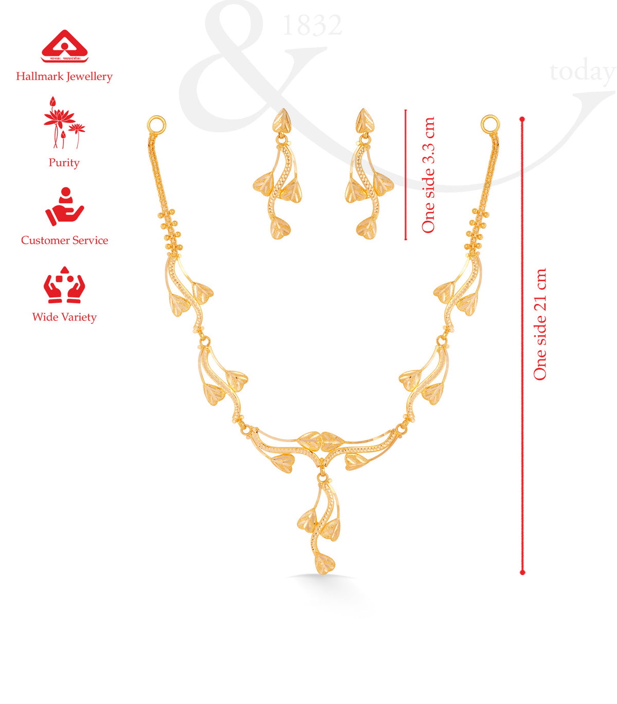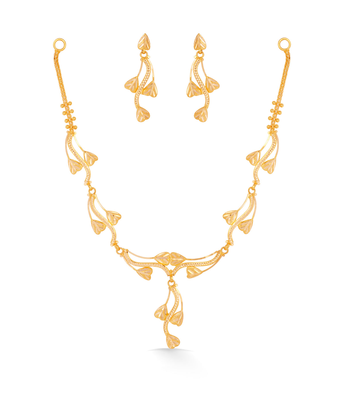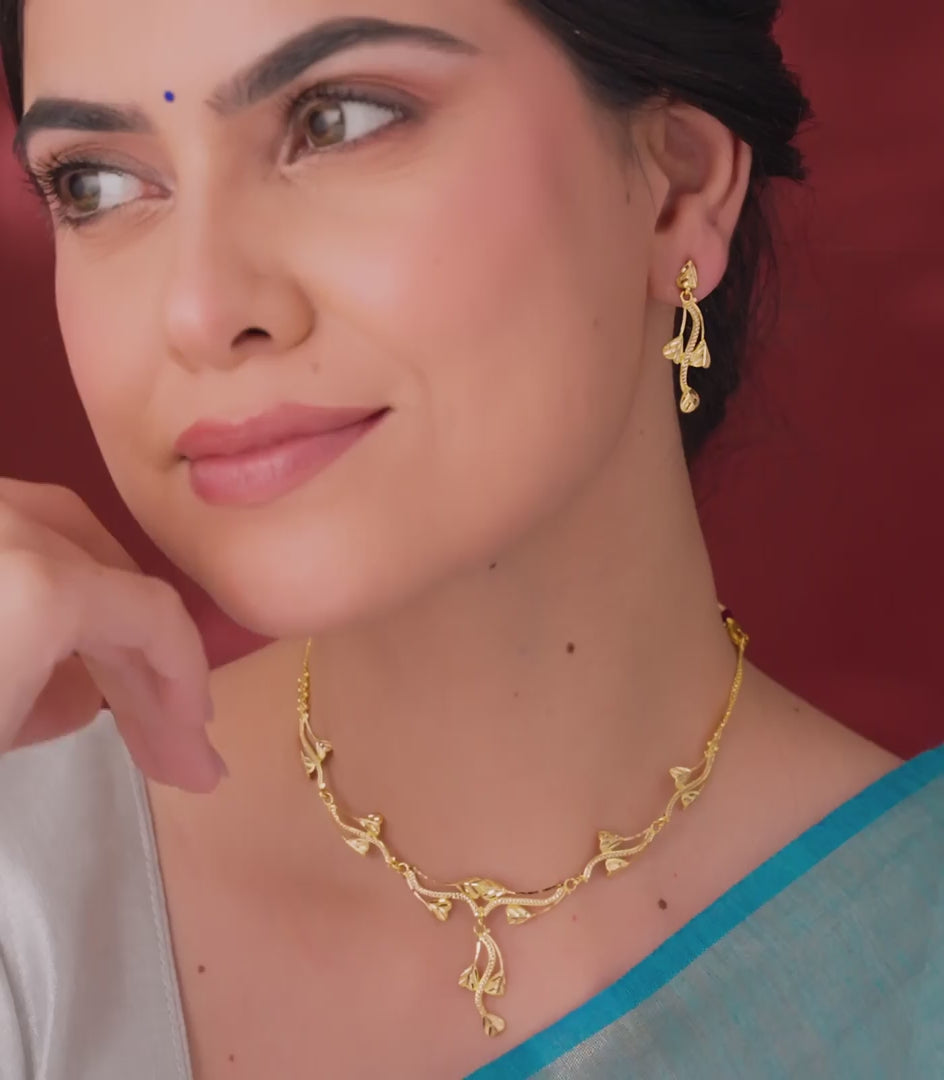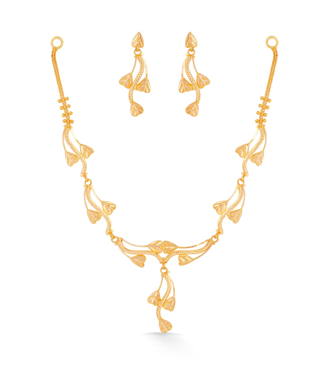 Grace your neckline with the timeless charm of our Golden Petal Cascade Necklace Set, a design that embodies nature’s elegance. Crafted in 22KT gold, the necklace features cascading leaf-inspired motifs, paired with matching earrings to complete the look. Perfect for weddings, festive occasions, or evening celebrations, this set beautifully blends sophistication with tradition, making it a must-have in every jewellery collection.