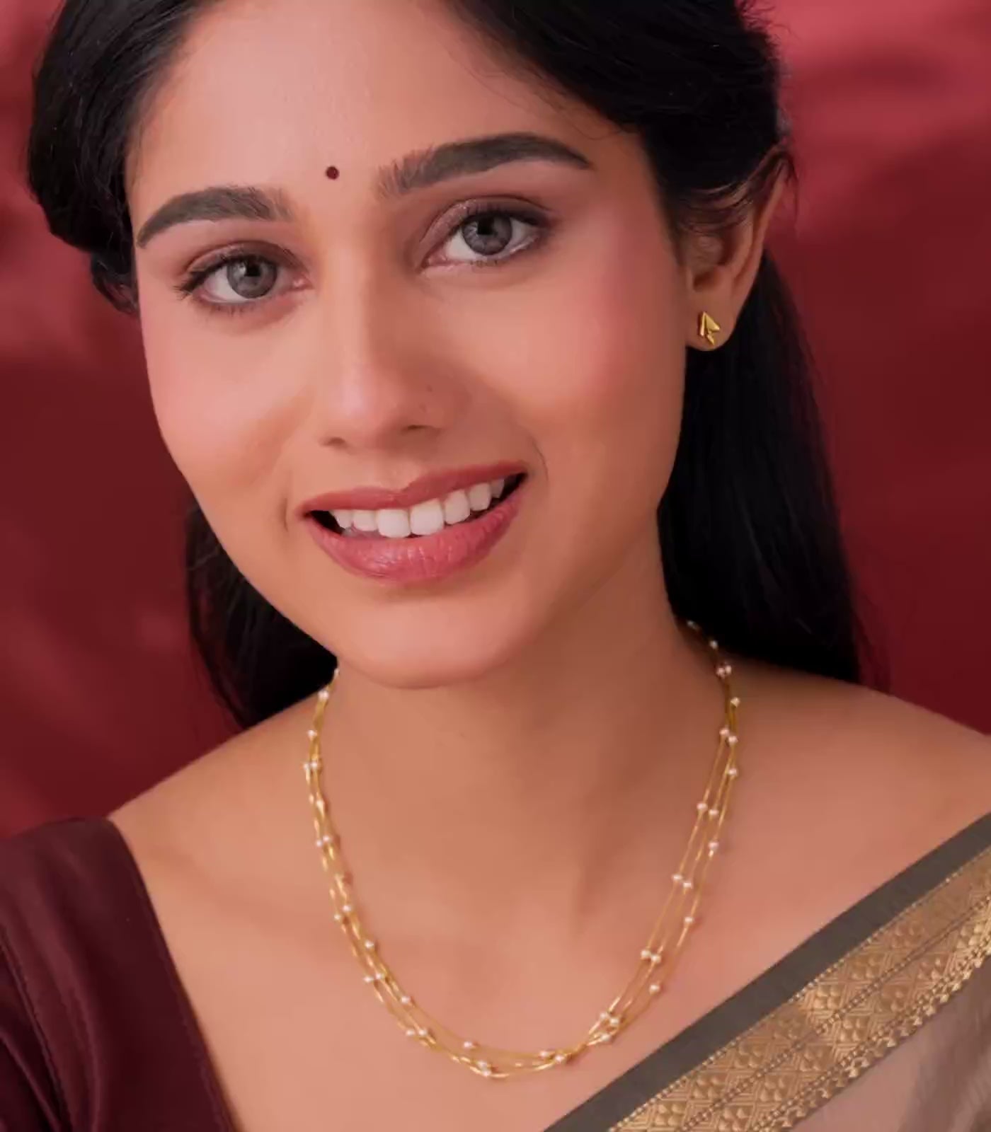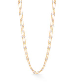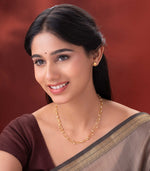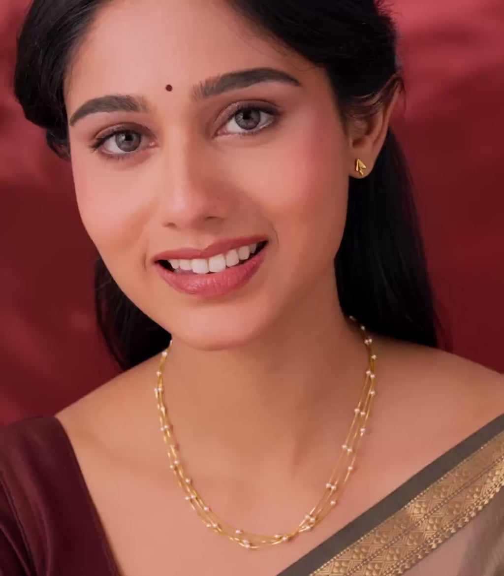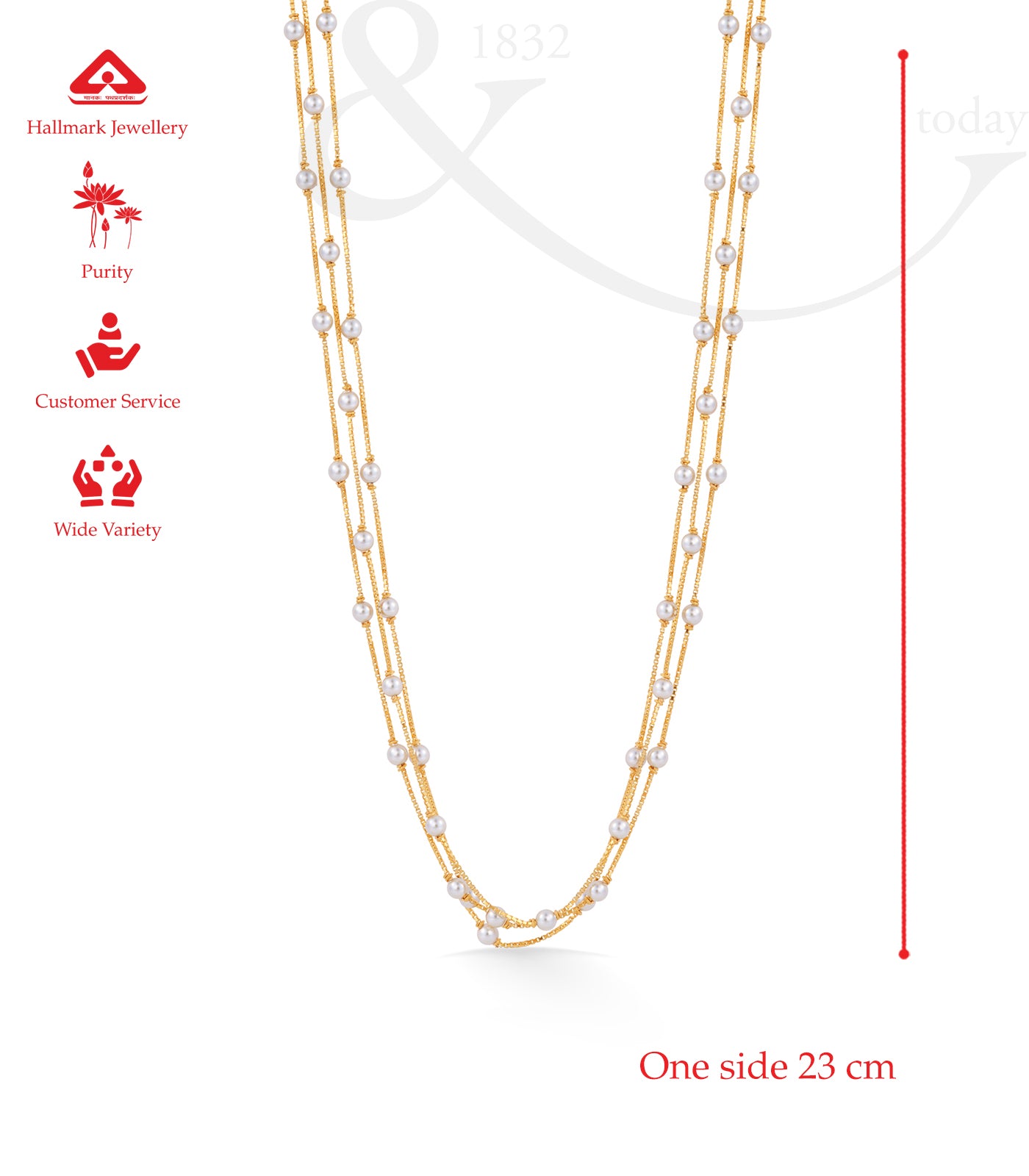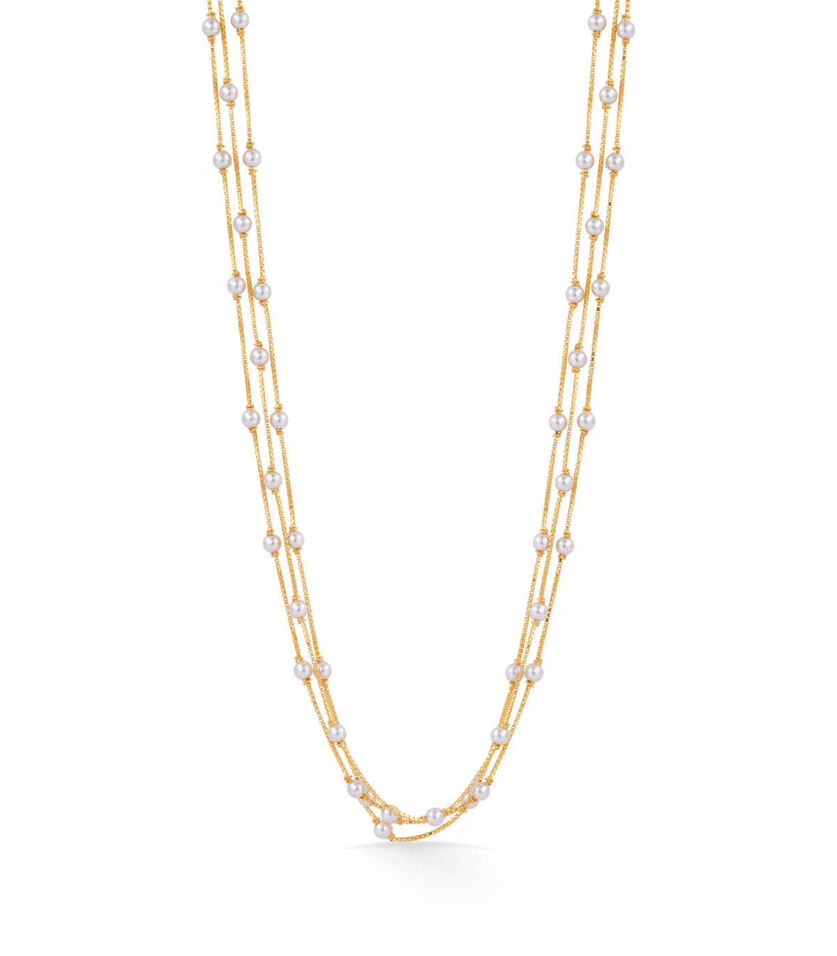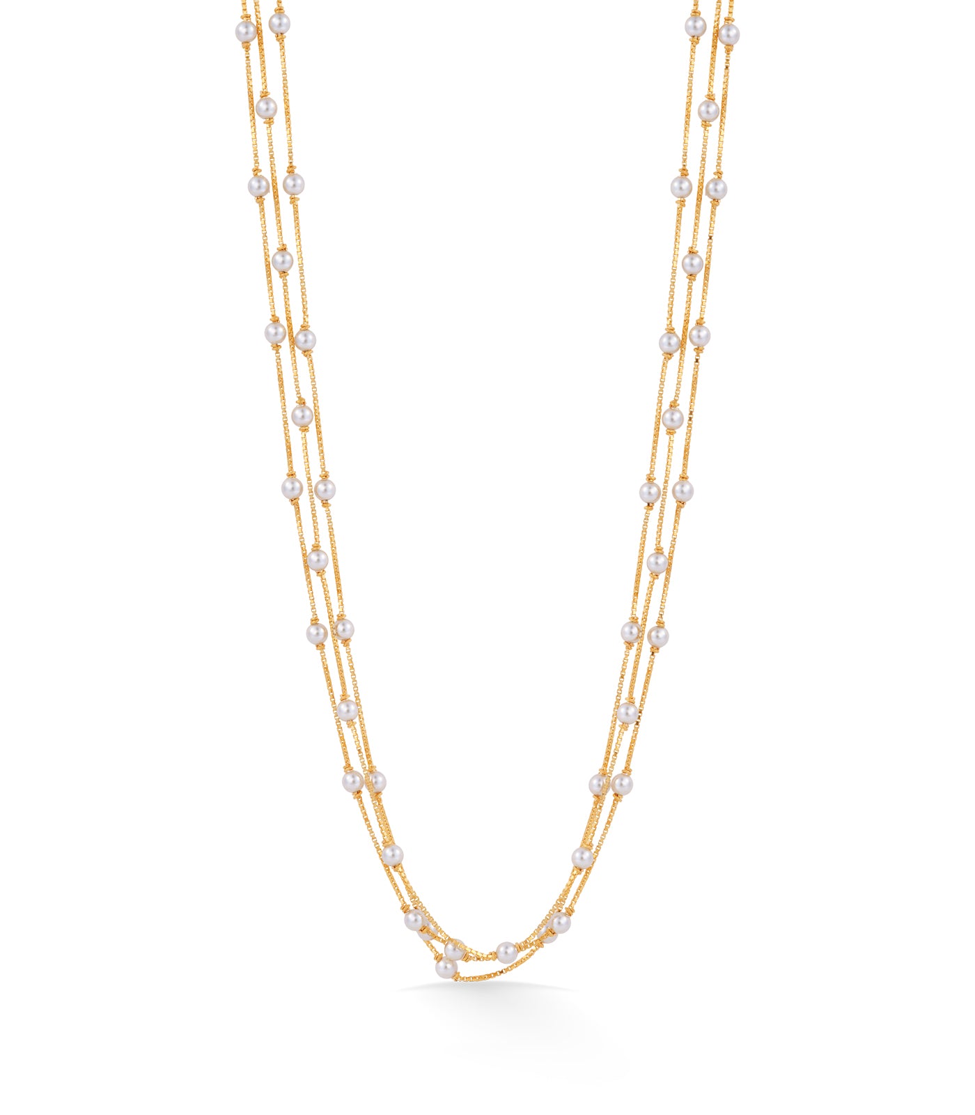 This elegant triple-layer goph necklace features delicate gold chains adorned with lustrous pearls, creating a soft rhythm of tradition and sophistication. Every pearl is hand-set to reflect timeless charm and effortless femininity.
