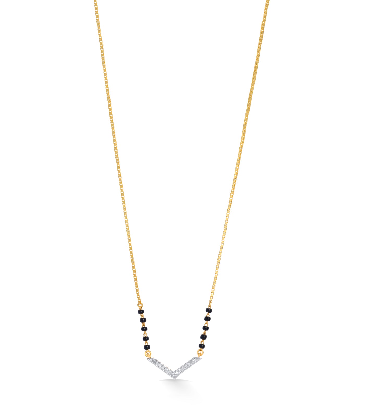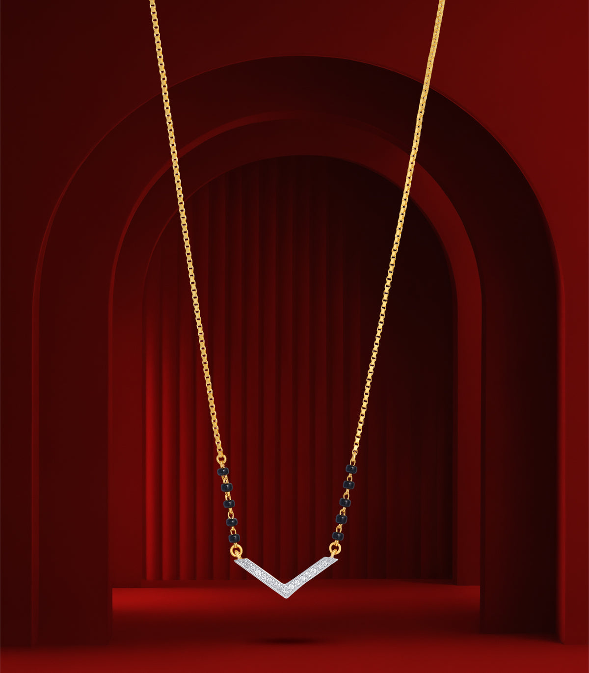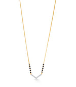 Modern and minimalistic, the Chevron Spark Gold Mangalsutra is designed with a sharp V-shaped pendant accented by shimmering stones. The geometric elegance brings a contemporary edge, while the traditional black beads keep its cultural essence alive.