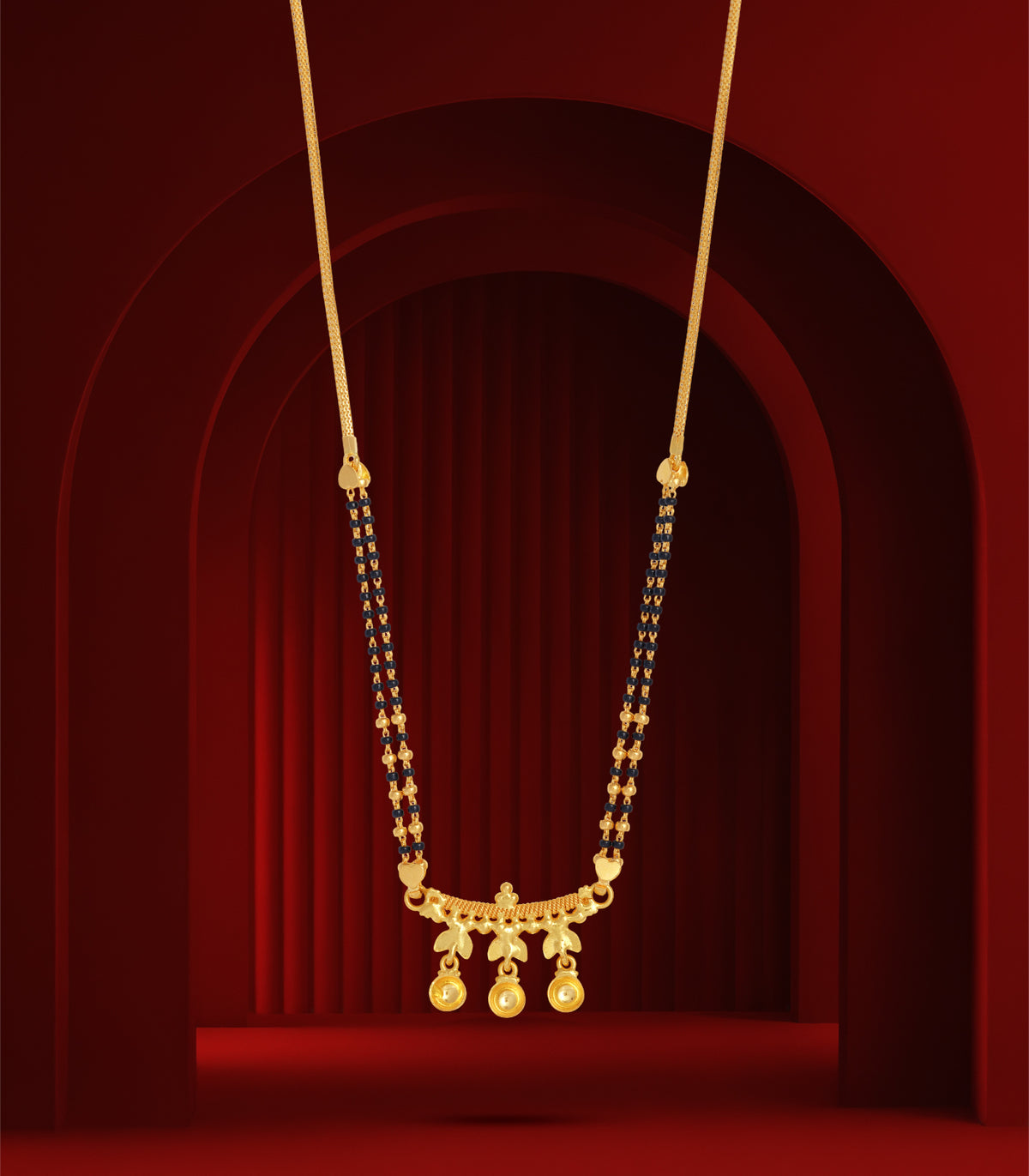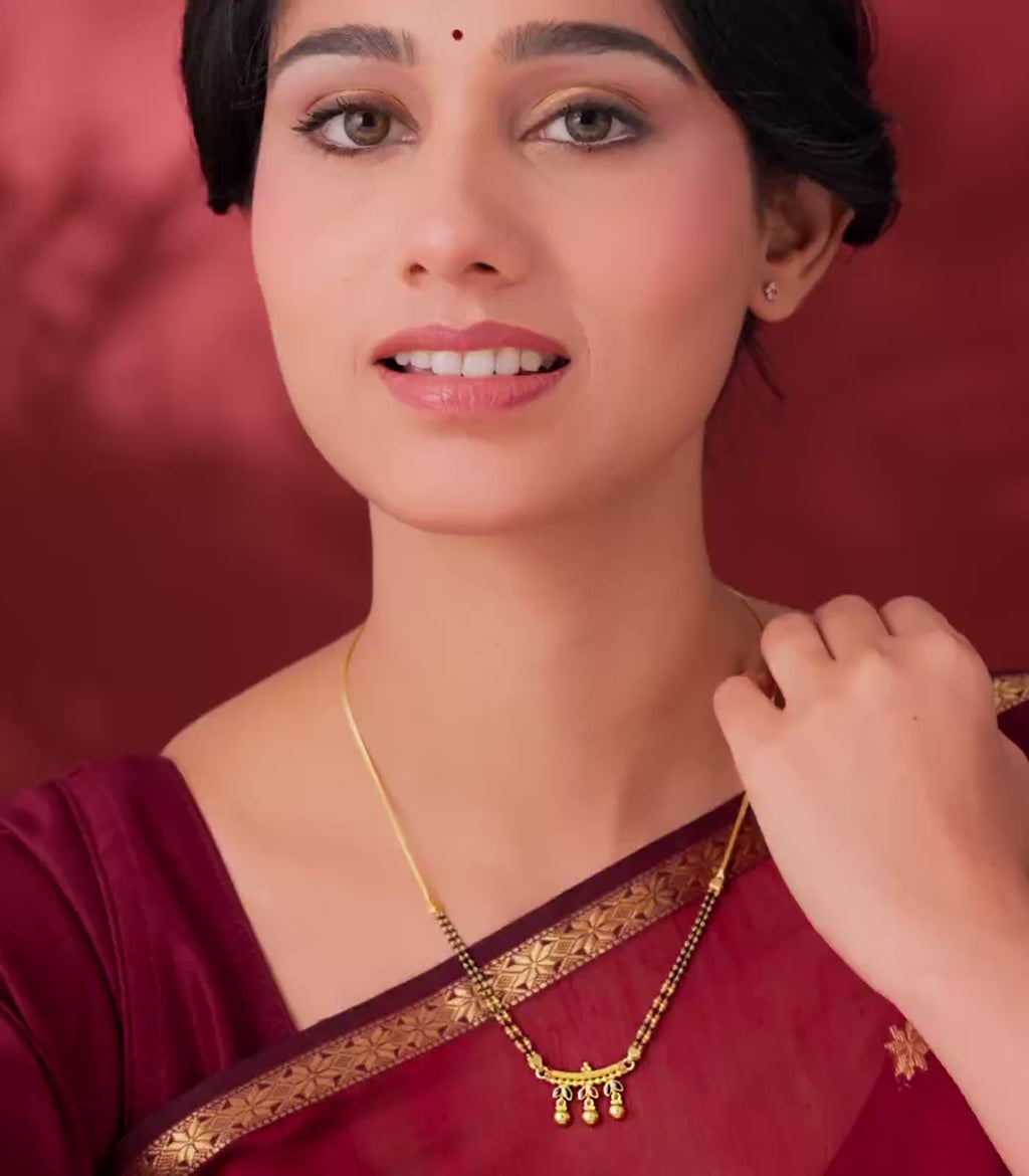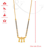 Celebrate the sacred bond of marriage with this Classic Gold Mangalsutra, designed in 22KT hallmark gold with a timeless double-beaded chain. The pendant showcases intricate detailing with three elegant gold drops, symbolizing harmony, prosperity, and togetherness.