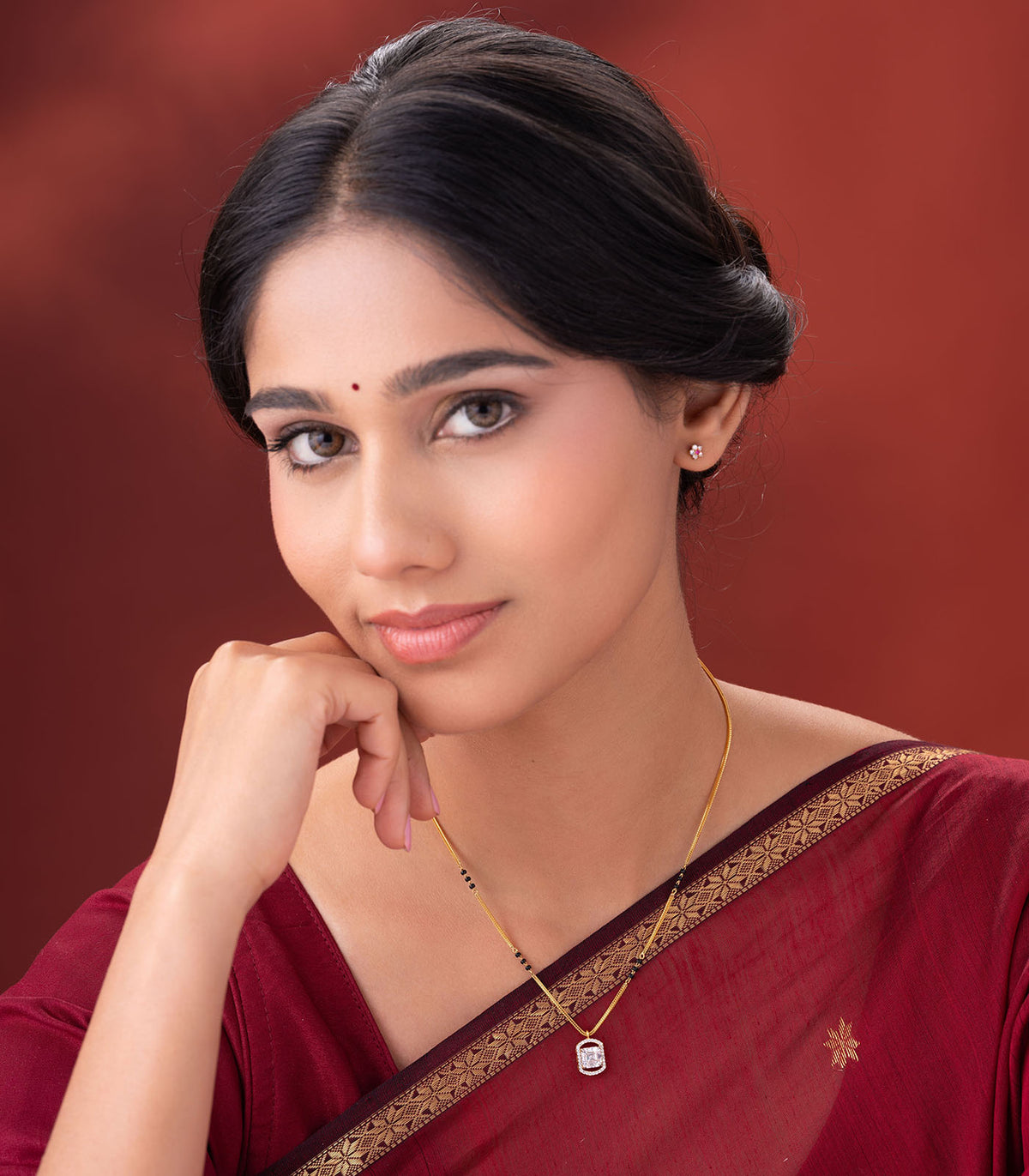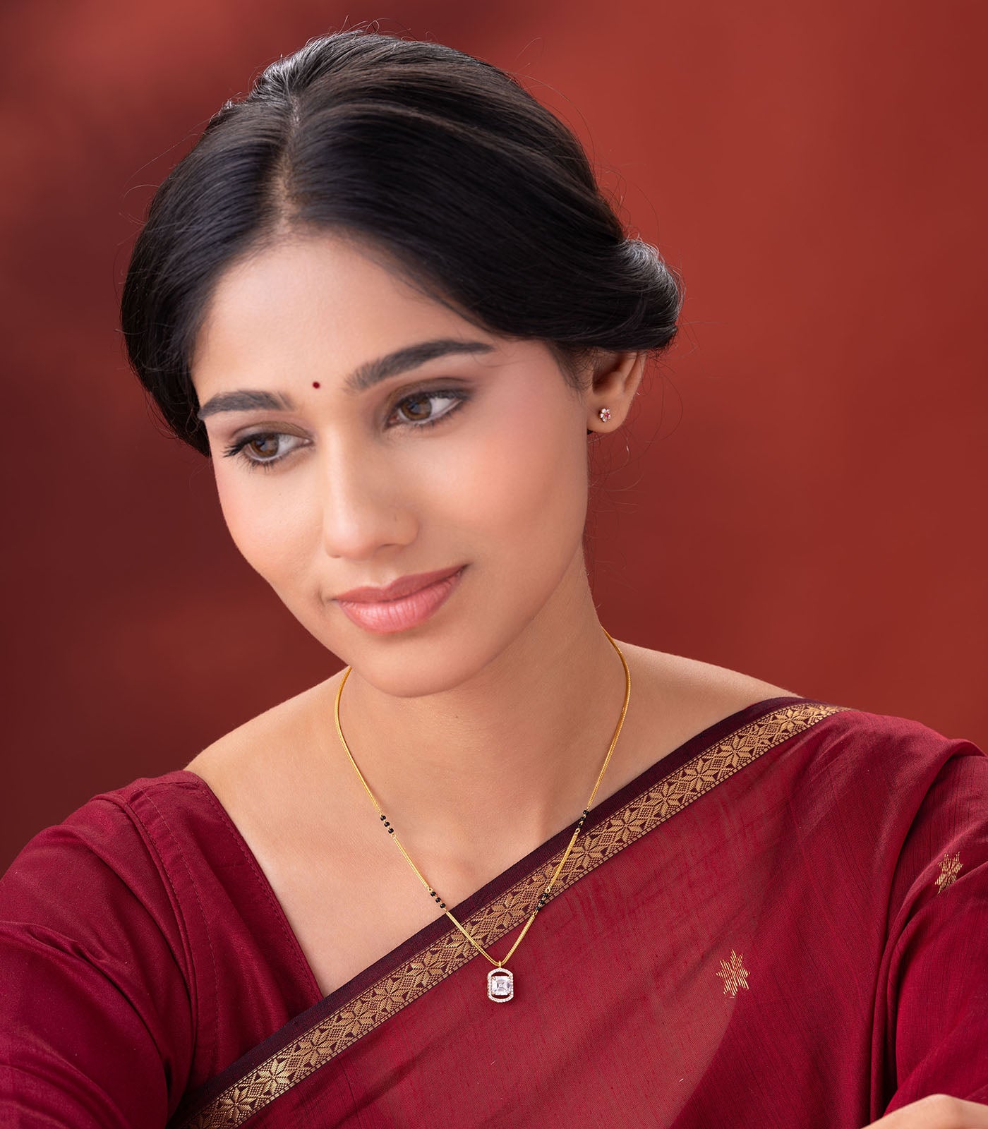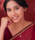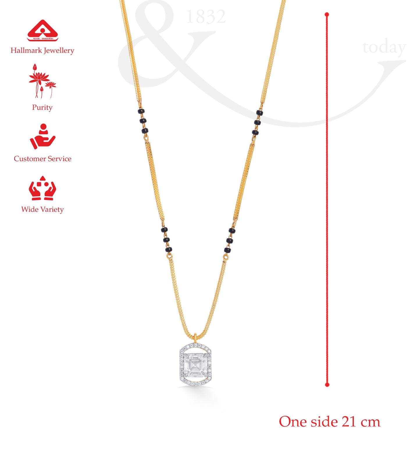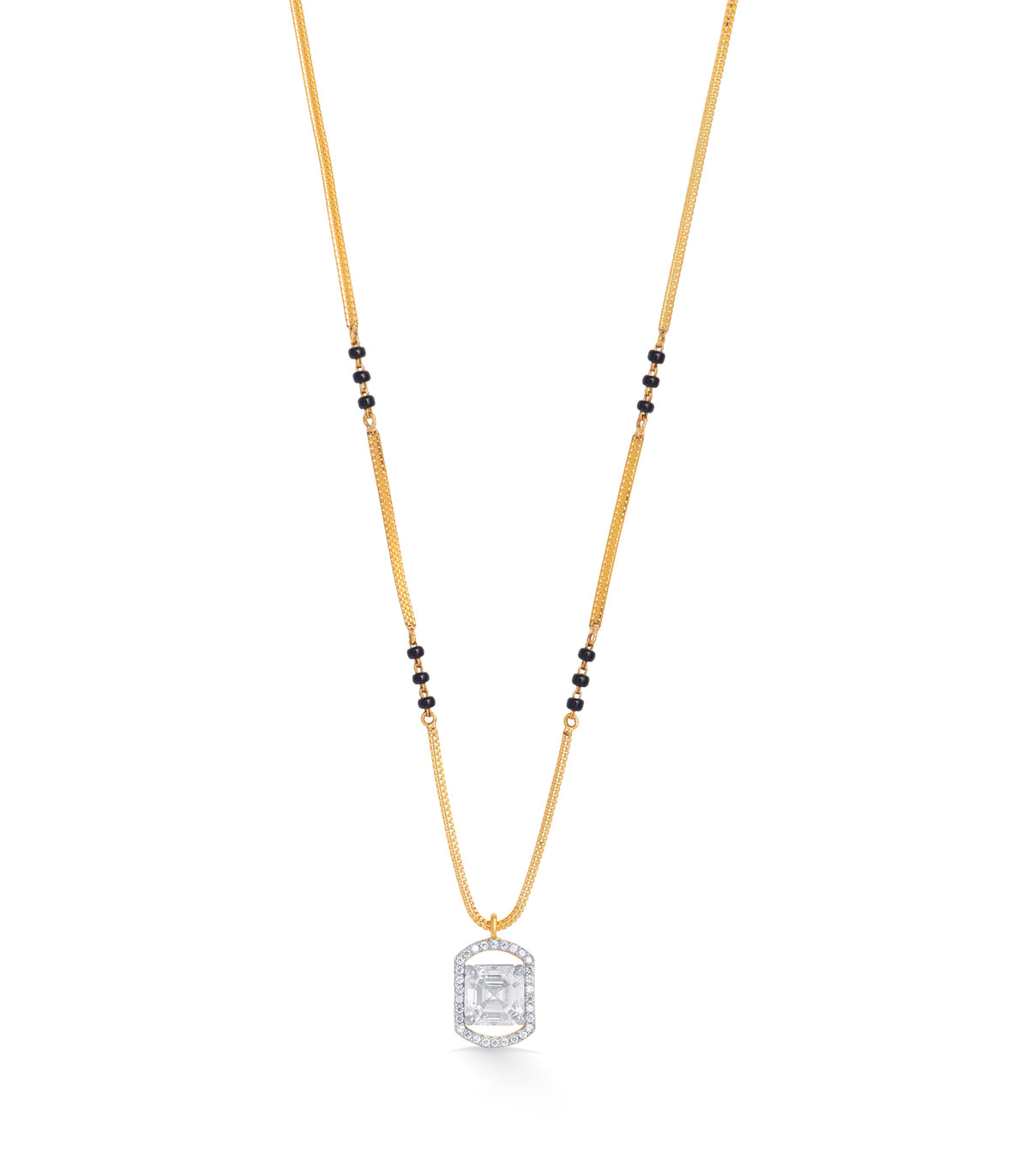 Redefining tradition with a modern sparkle, the Emerald Aura Gold Mangalsutra is crafted in 22KT hallmark gold and adorned with a striking emerald-cut inspired centerpiece surrounded by a halo of shimmering stones.