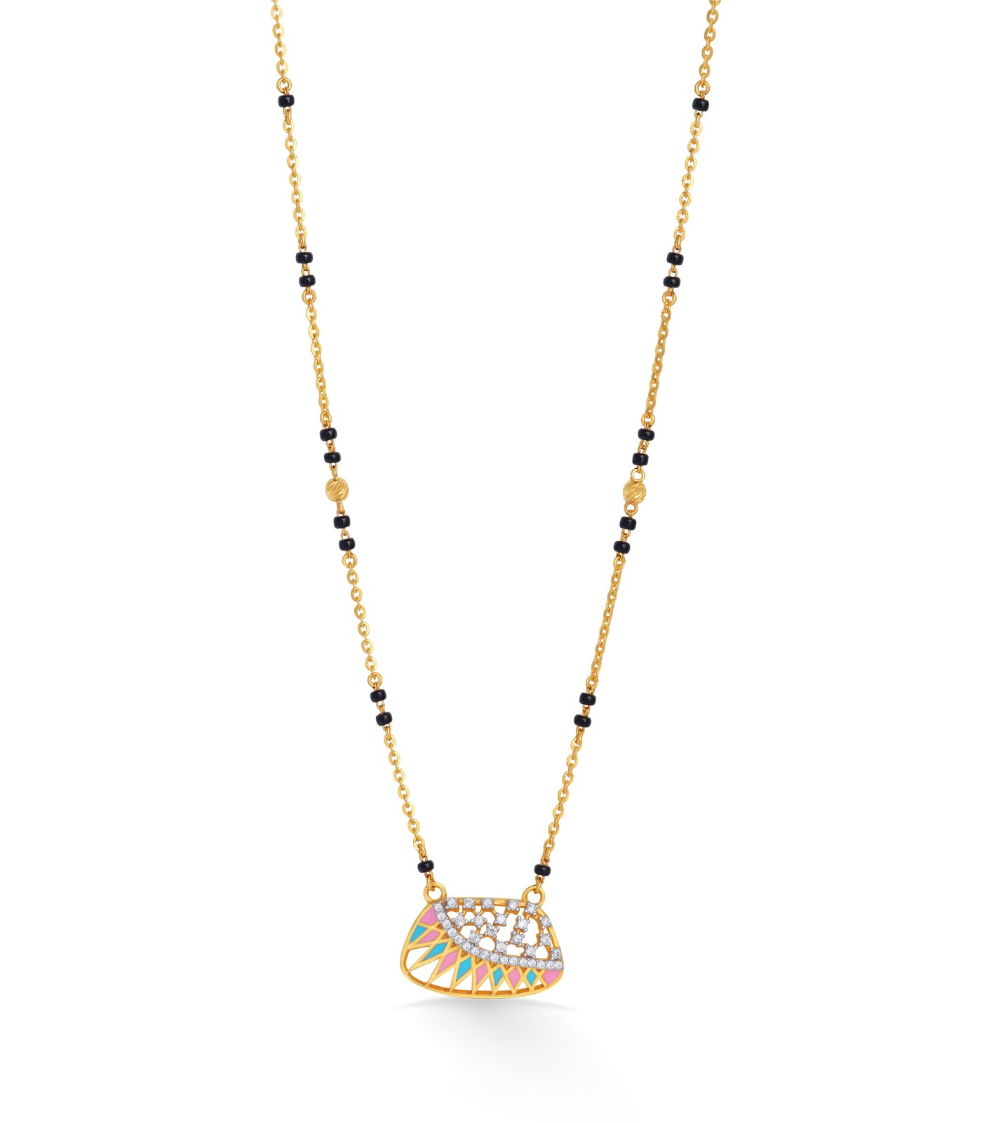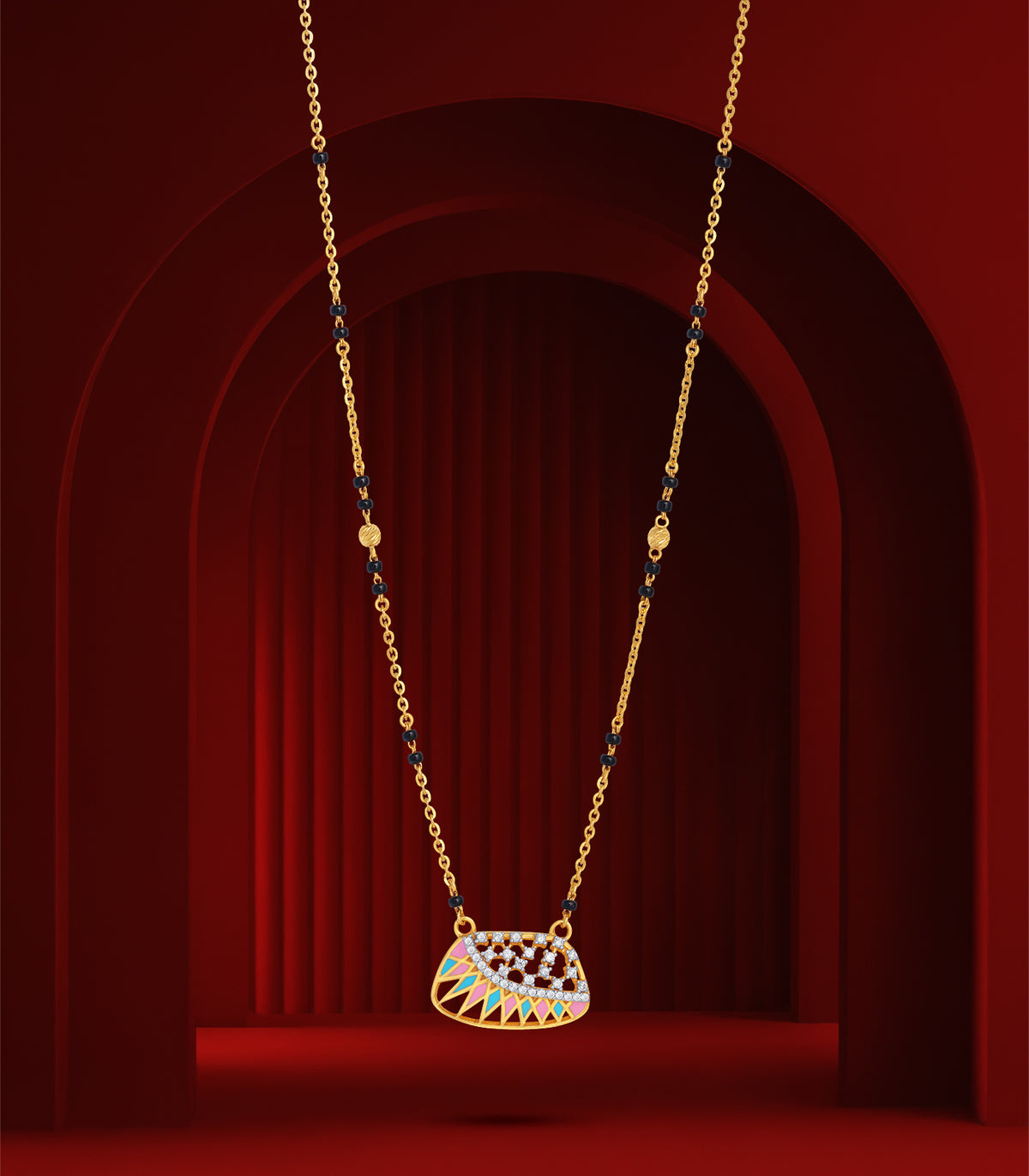 The Radiant Prism Gold Mangalsutra is a striking blend of tradition and modern artistry. Designed with a unique half-dome pendant, it features intricate latticework highlighted with multi-colored enamel accents that shimmer with vibrance.