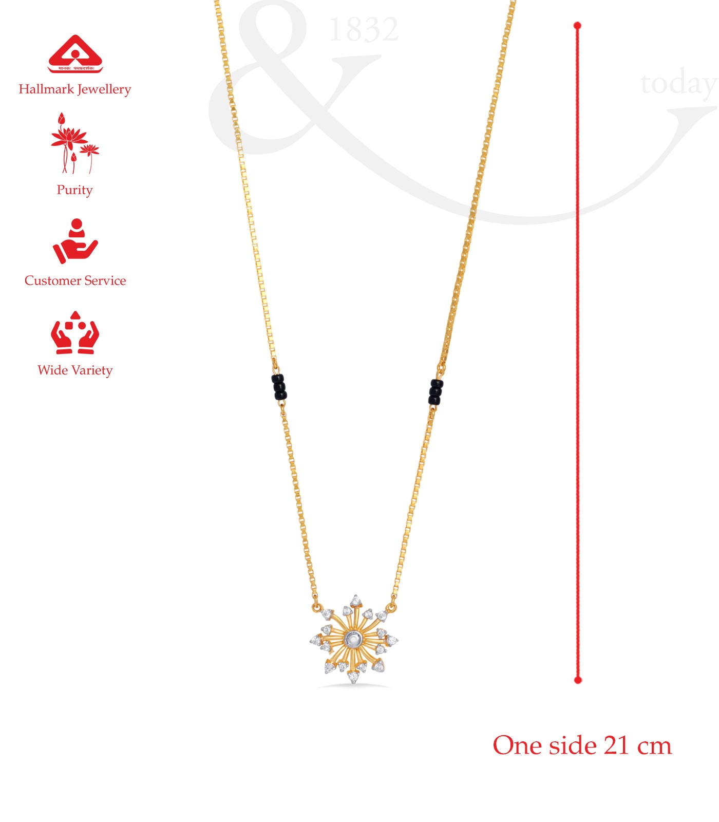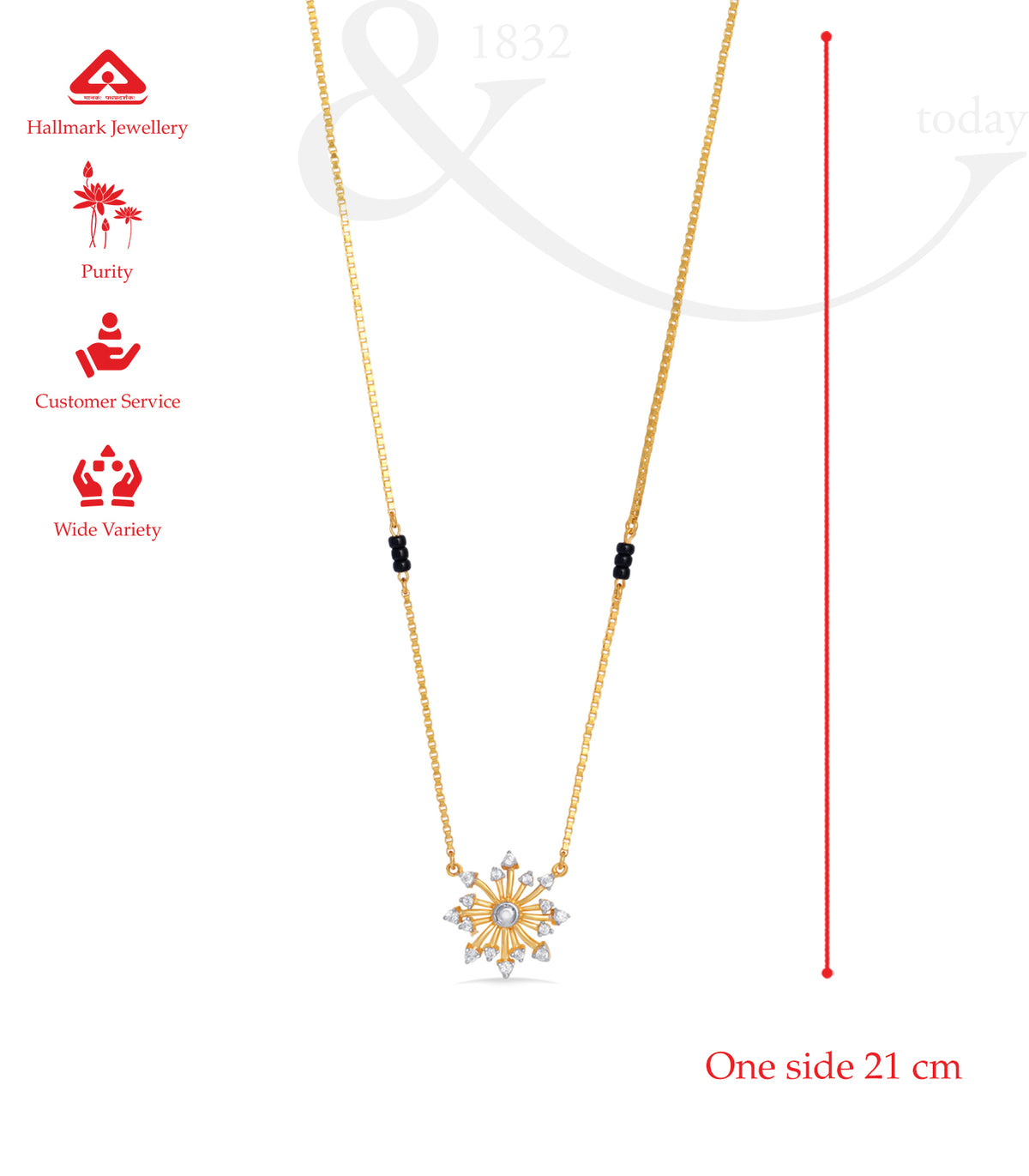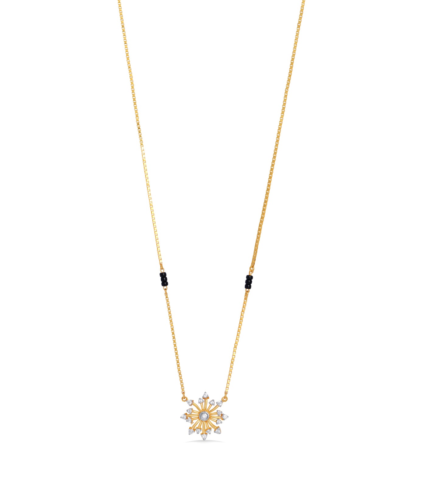 The Stellar Bloom Gold Mangalsutra captures the brilliance of a starburst with its radiant floral-inspired pendant. Crafted in gold and accented with shimmering stones, this exquisite design symbolizes new beginnings, love, and prosperity.