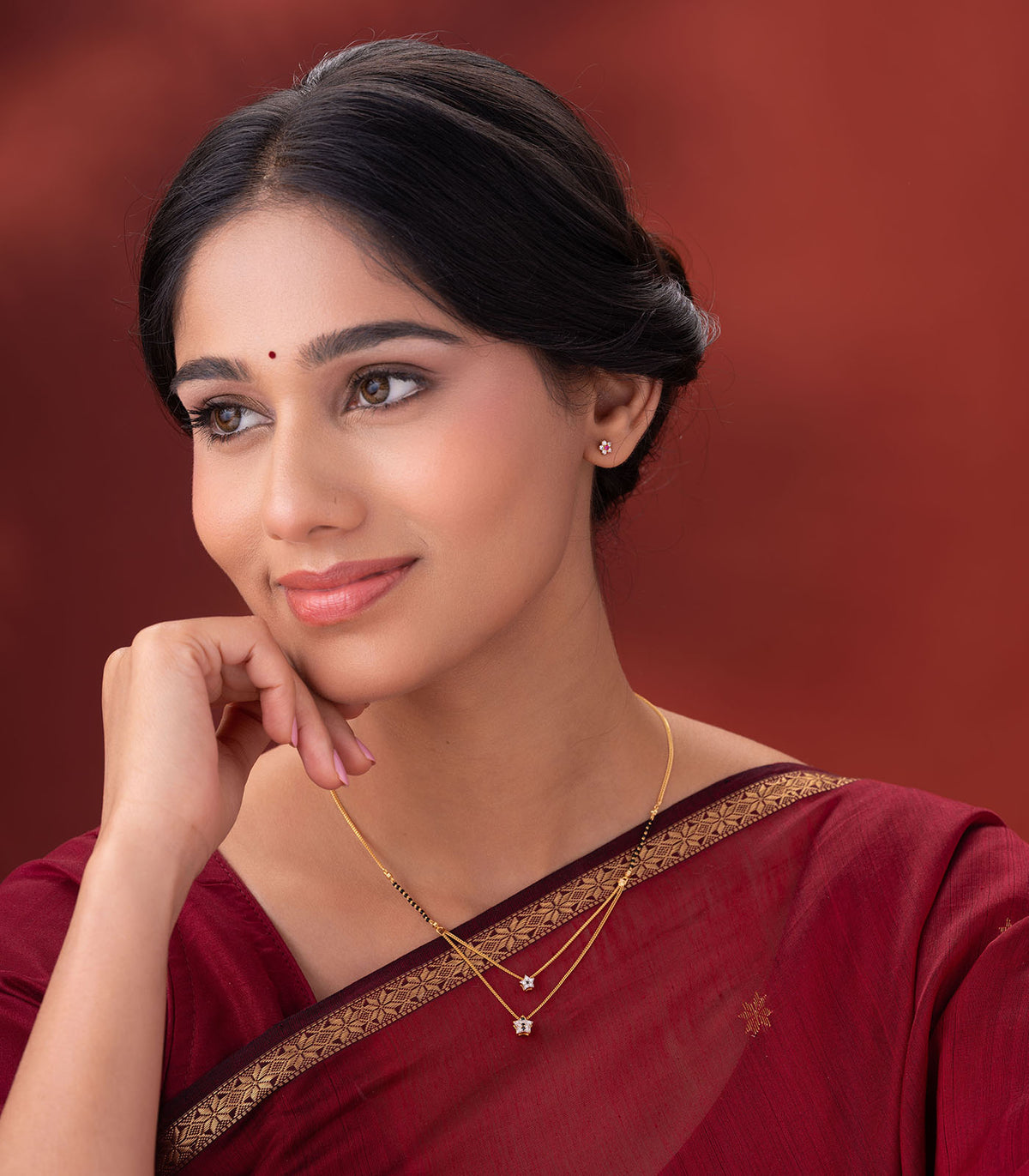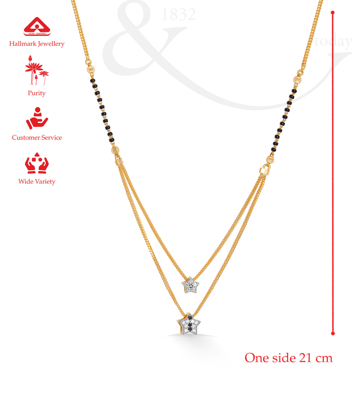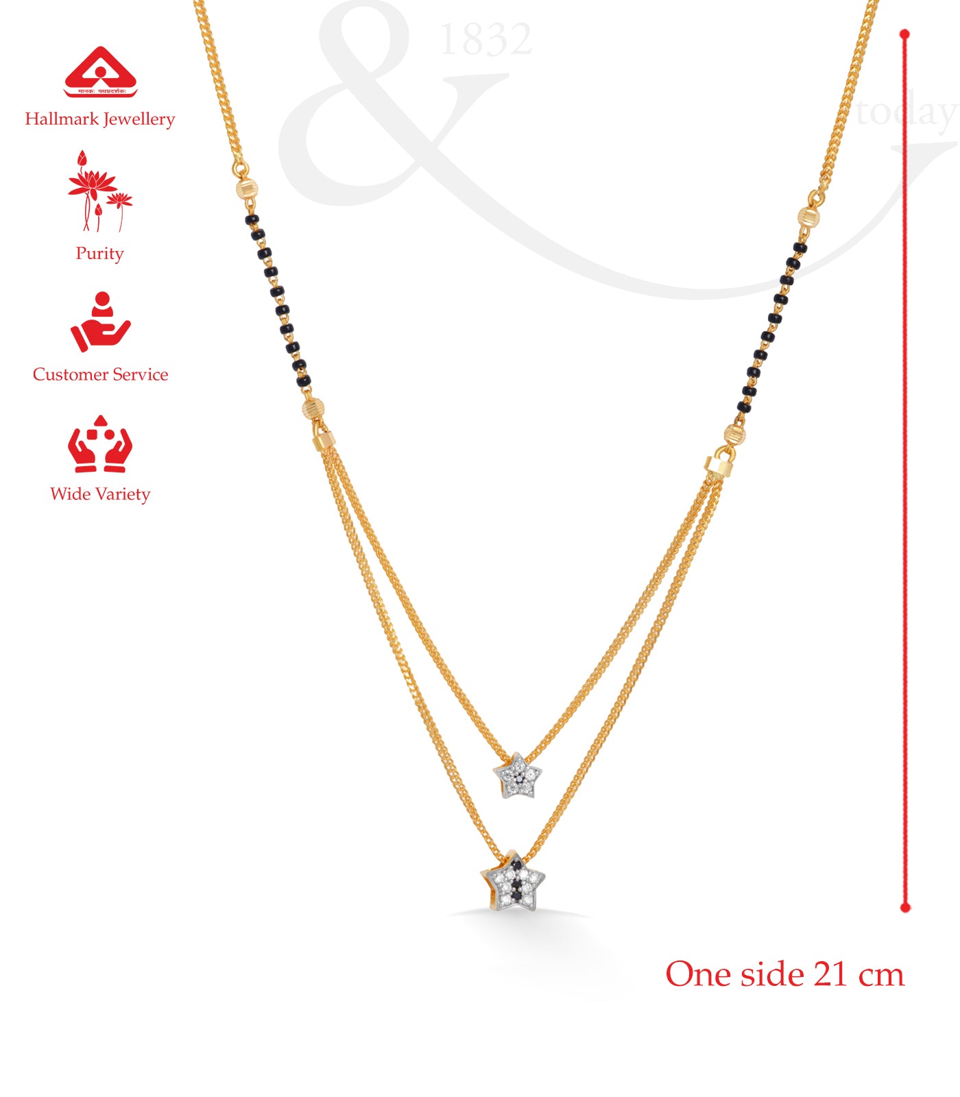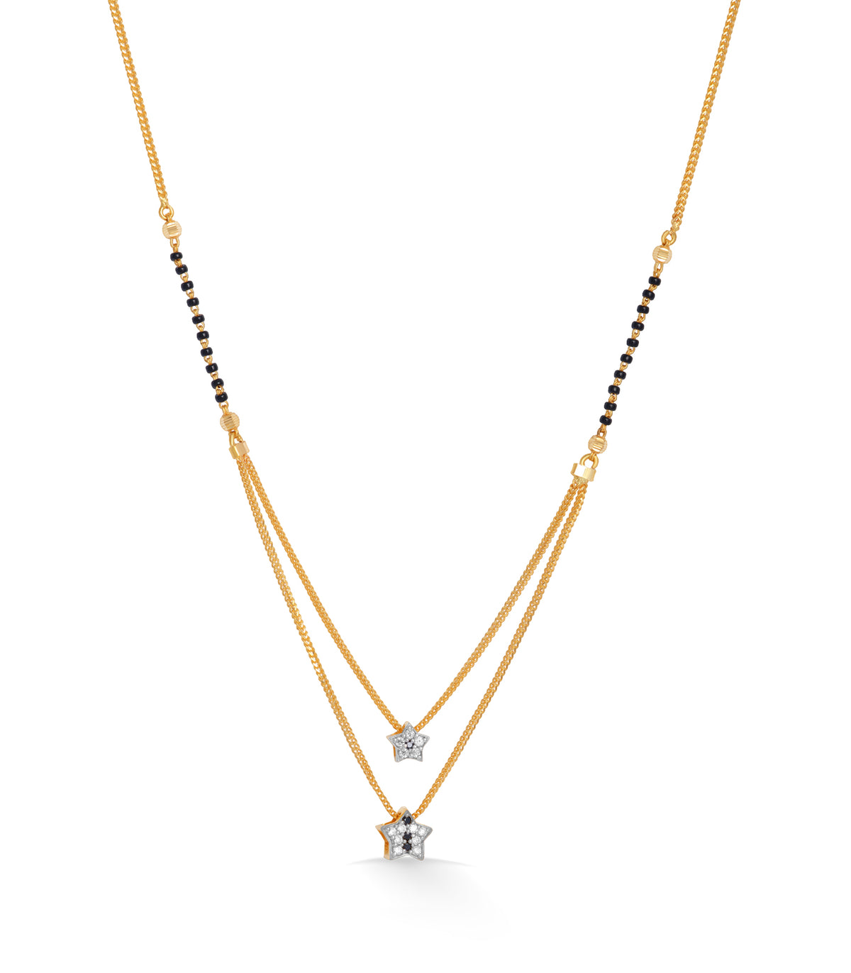 Shine bright every day with the Twilight Star Mangalsutra, a celestial-inspired design that brings together modern elegance and traditional symbolism. Featuring two delicate star-shaped pendants studded with sparkling stones, this dual-layered design mirrors the eternal glow of love and togetherness.