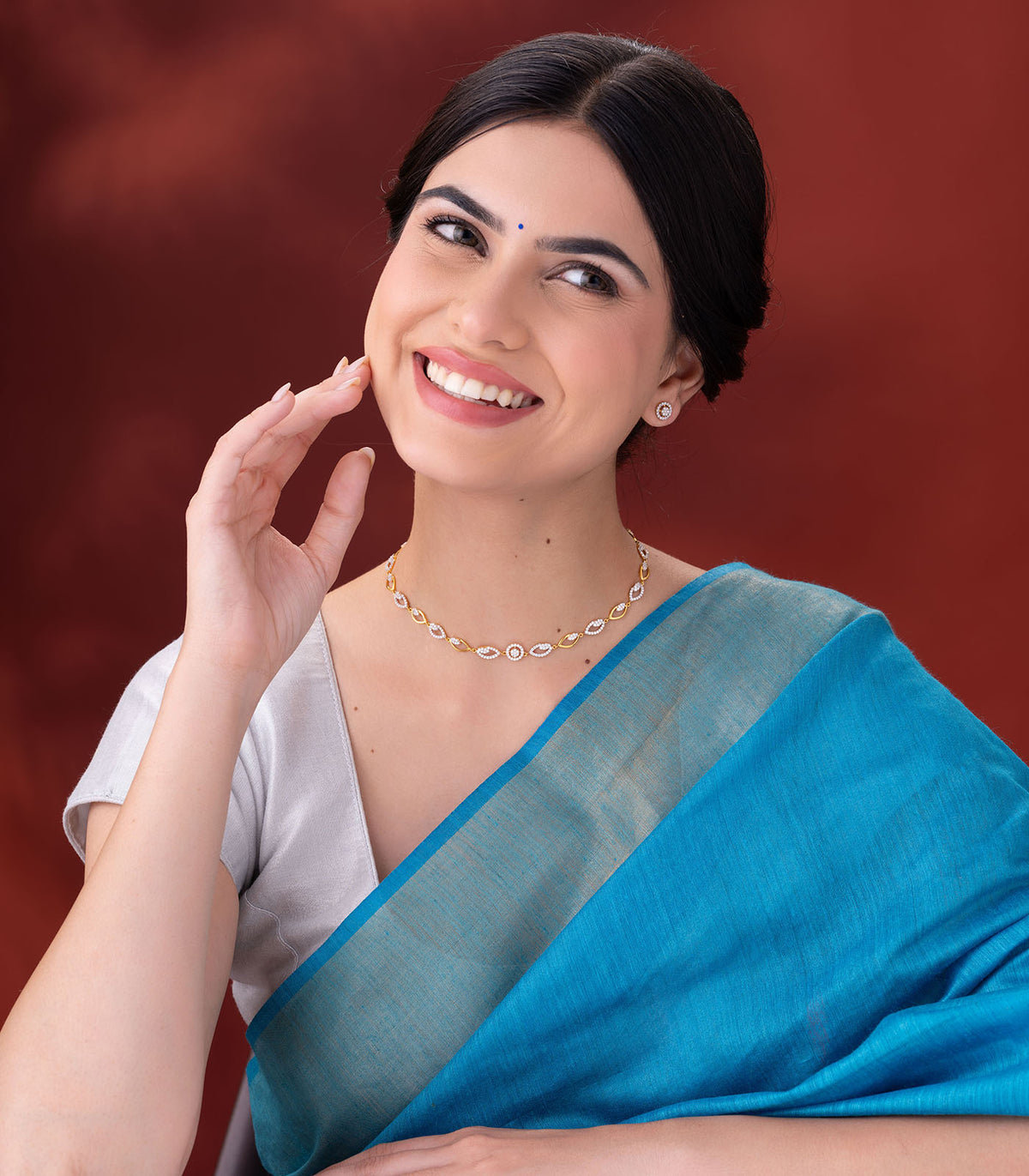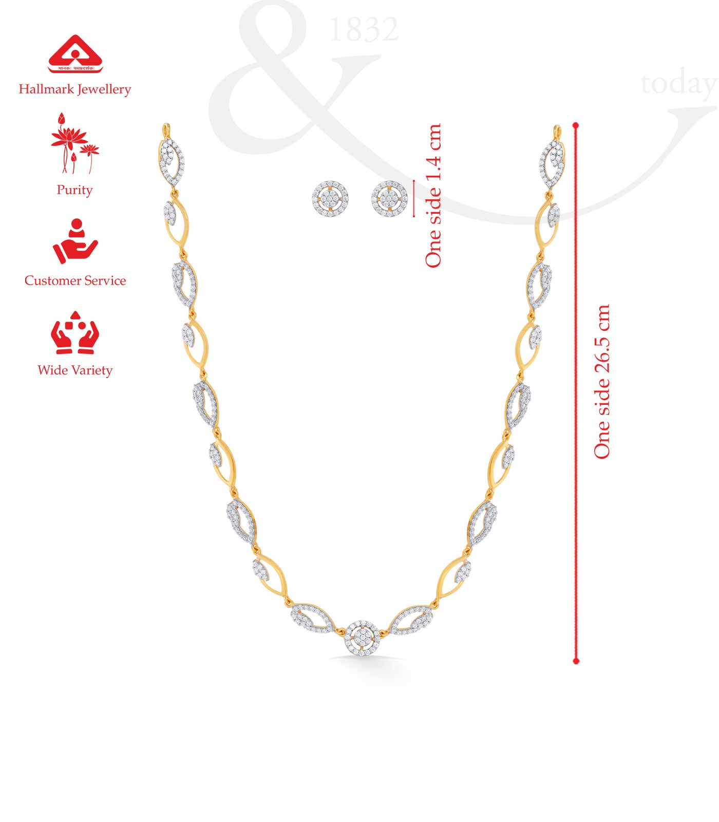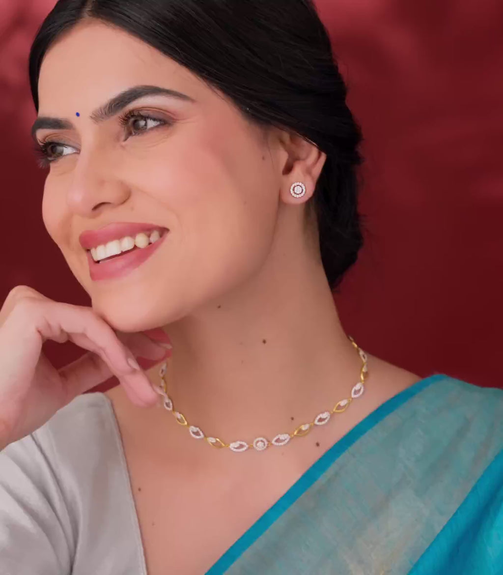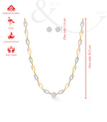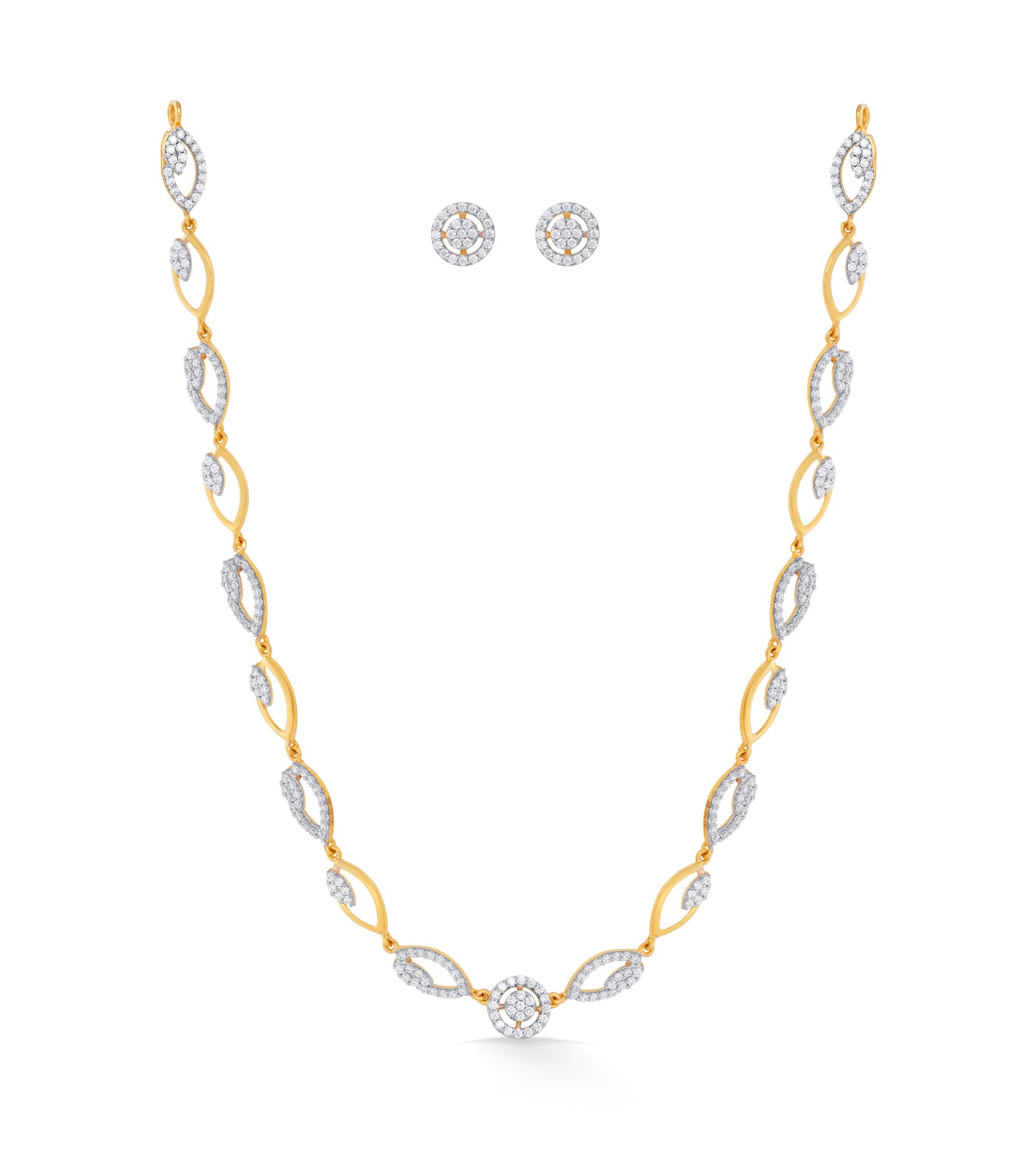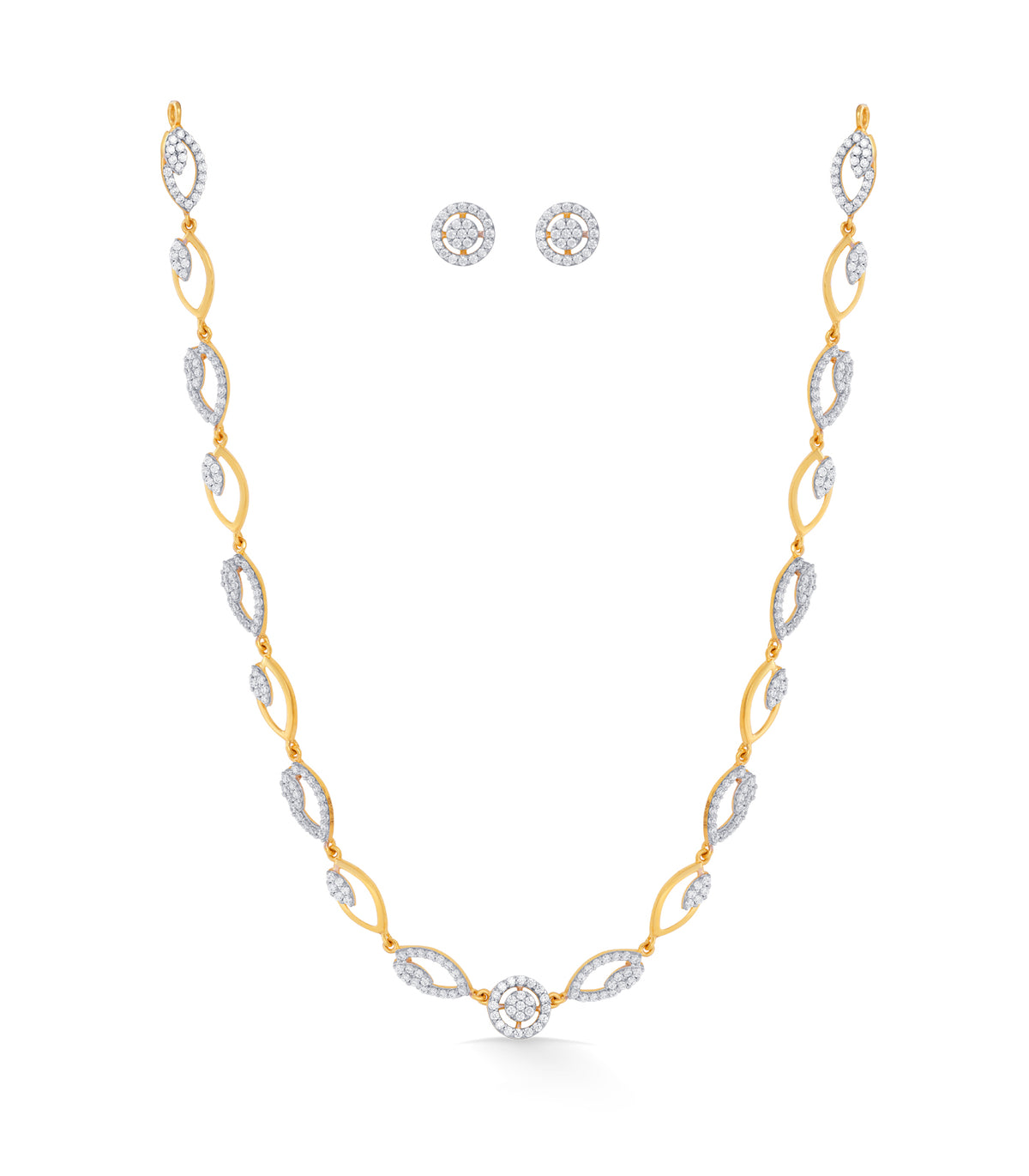 Step into refined elegance with the Eternal Grace Gold Necklace Set by P.N. Gadgil & Sons, where tradition meets modern artistry. Crafted in 22KT yellow gold and accentuated with brilliant precious stones, the design features alternating oval and circular motifs that radiate timeless sophistication.