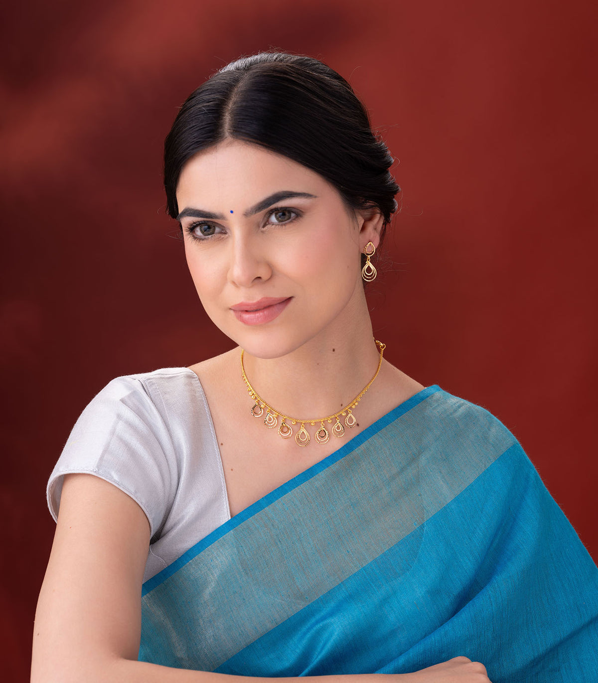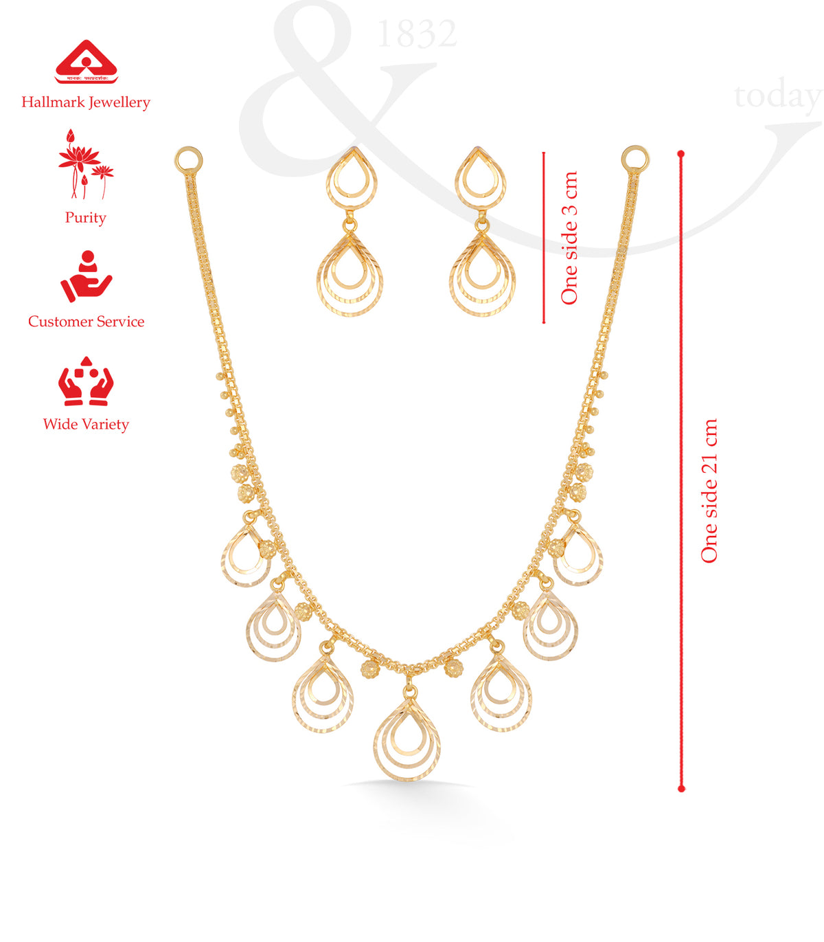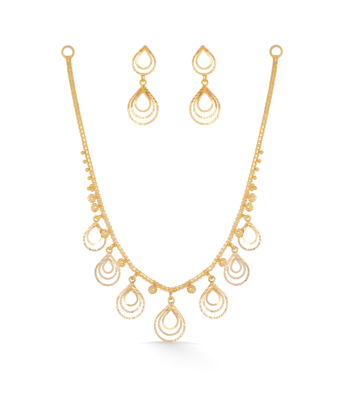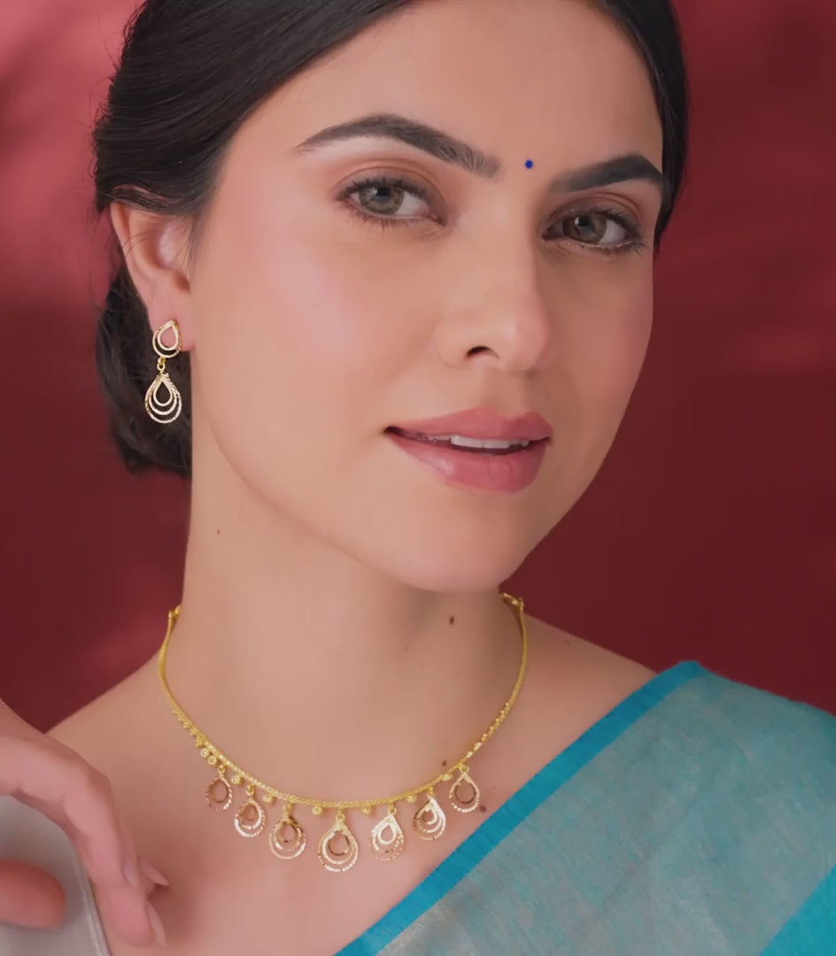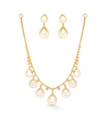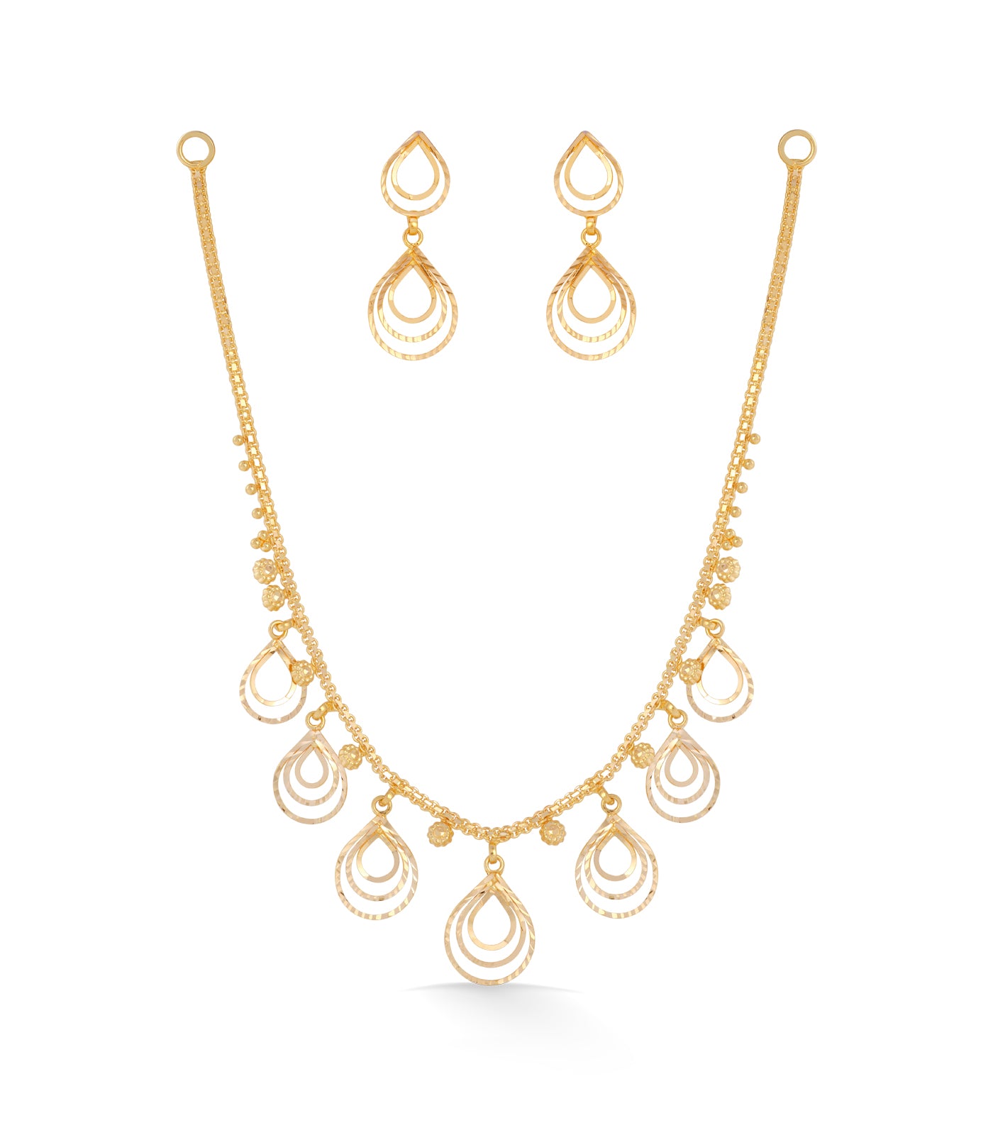 The Ornate Symphony Necklace Set is a timeless celebration of elegance and artistry. Crafted in luminous gold, this necklace features cascading teardrop motifs that flow in perfect harmony, symbolizing grace and sophistication. Paired with matching earrings, it’s an exquisite choice for weddings, festive occasions, and special celebrations. The intricate design and balanced detailing create a symphony of style, making it a must-have for the modern woman who loves classic charm with a contemporary touch