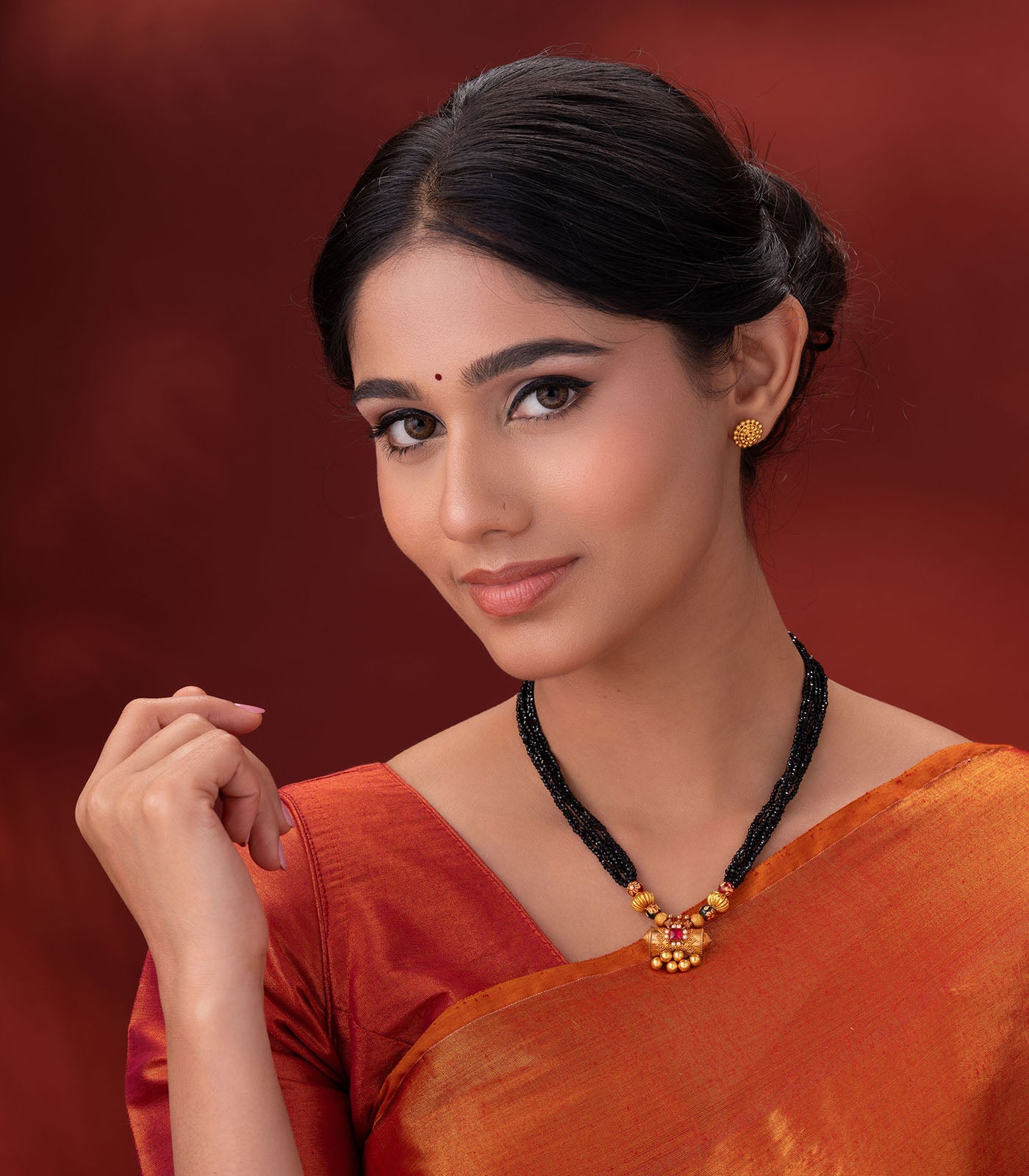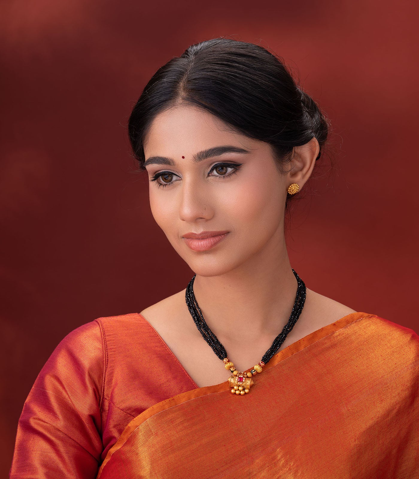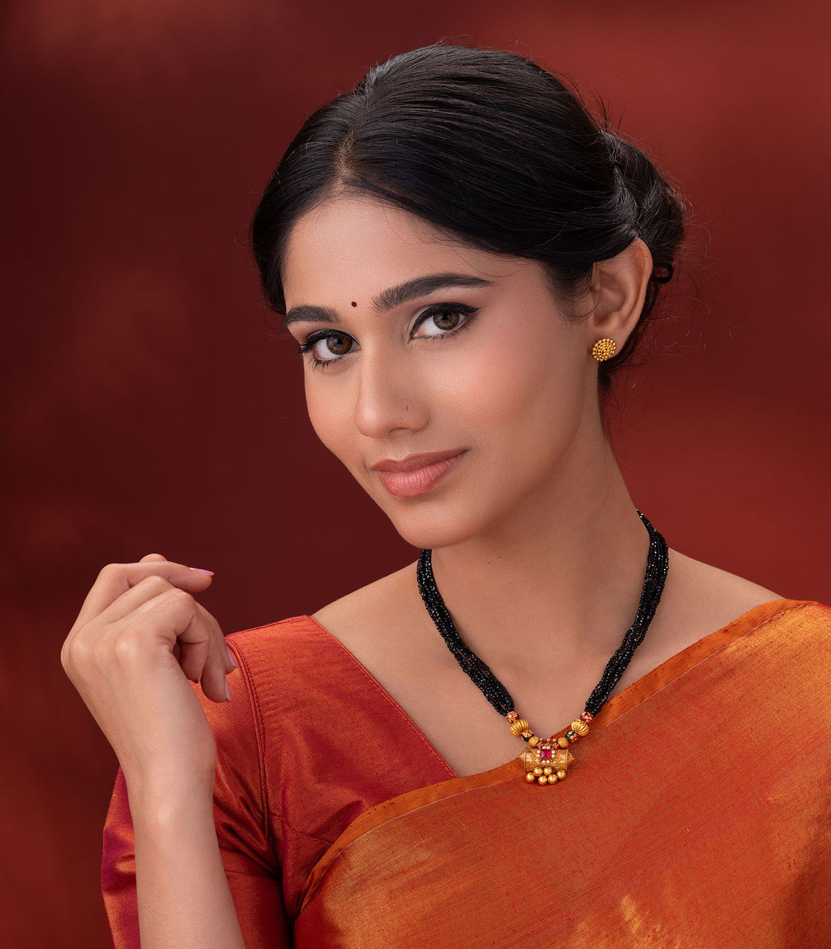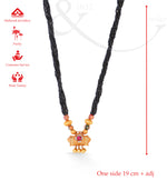 Design: The deep black beads and substantial gold pendant create a statement necklace that exudes elegance, strength, and timeless tradition.
