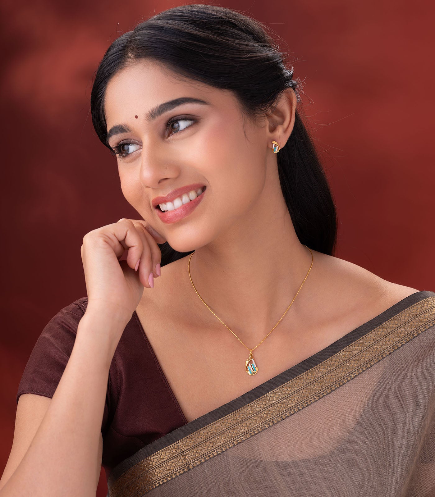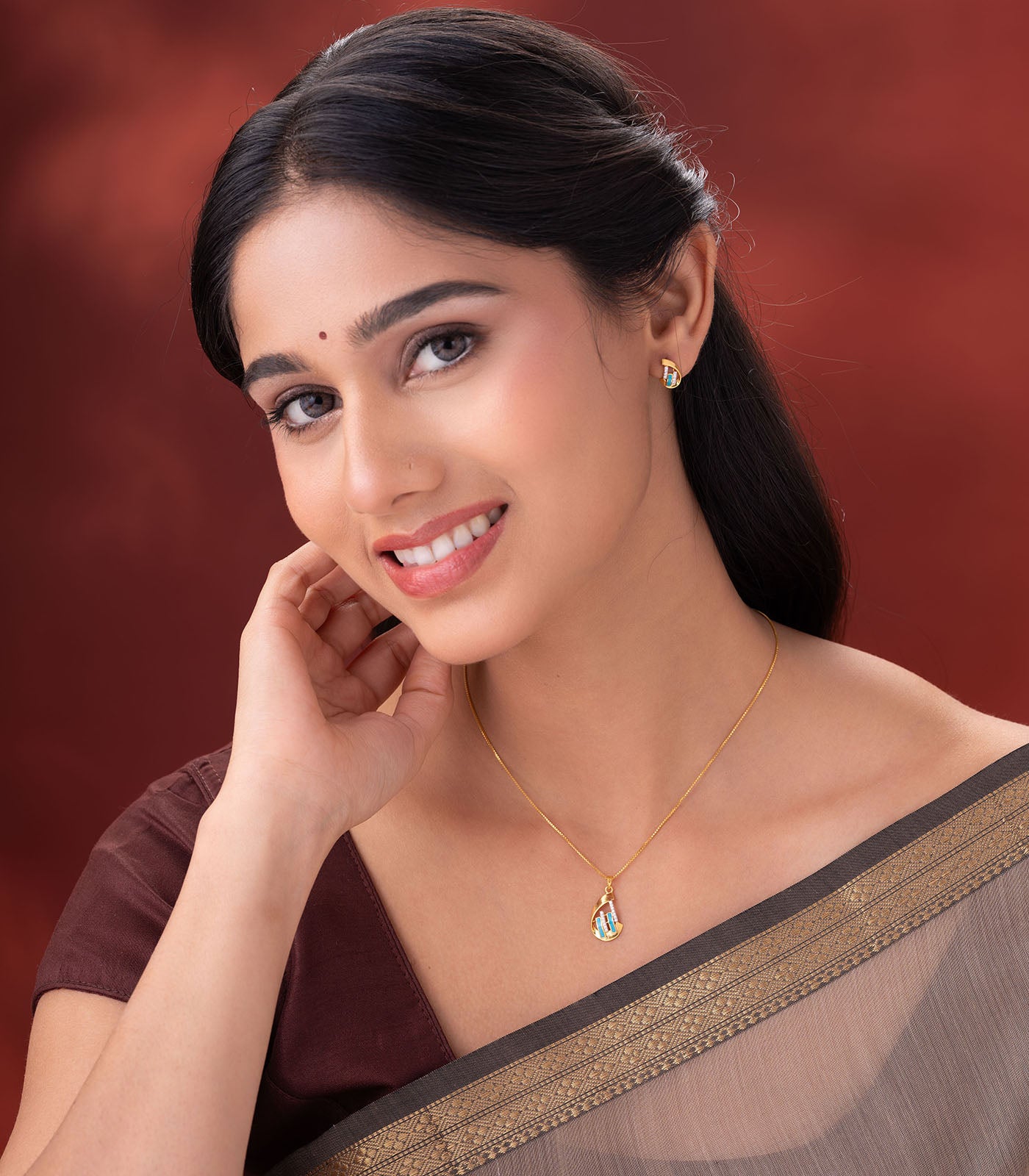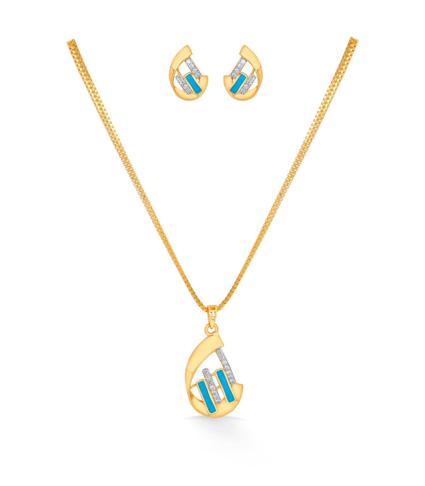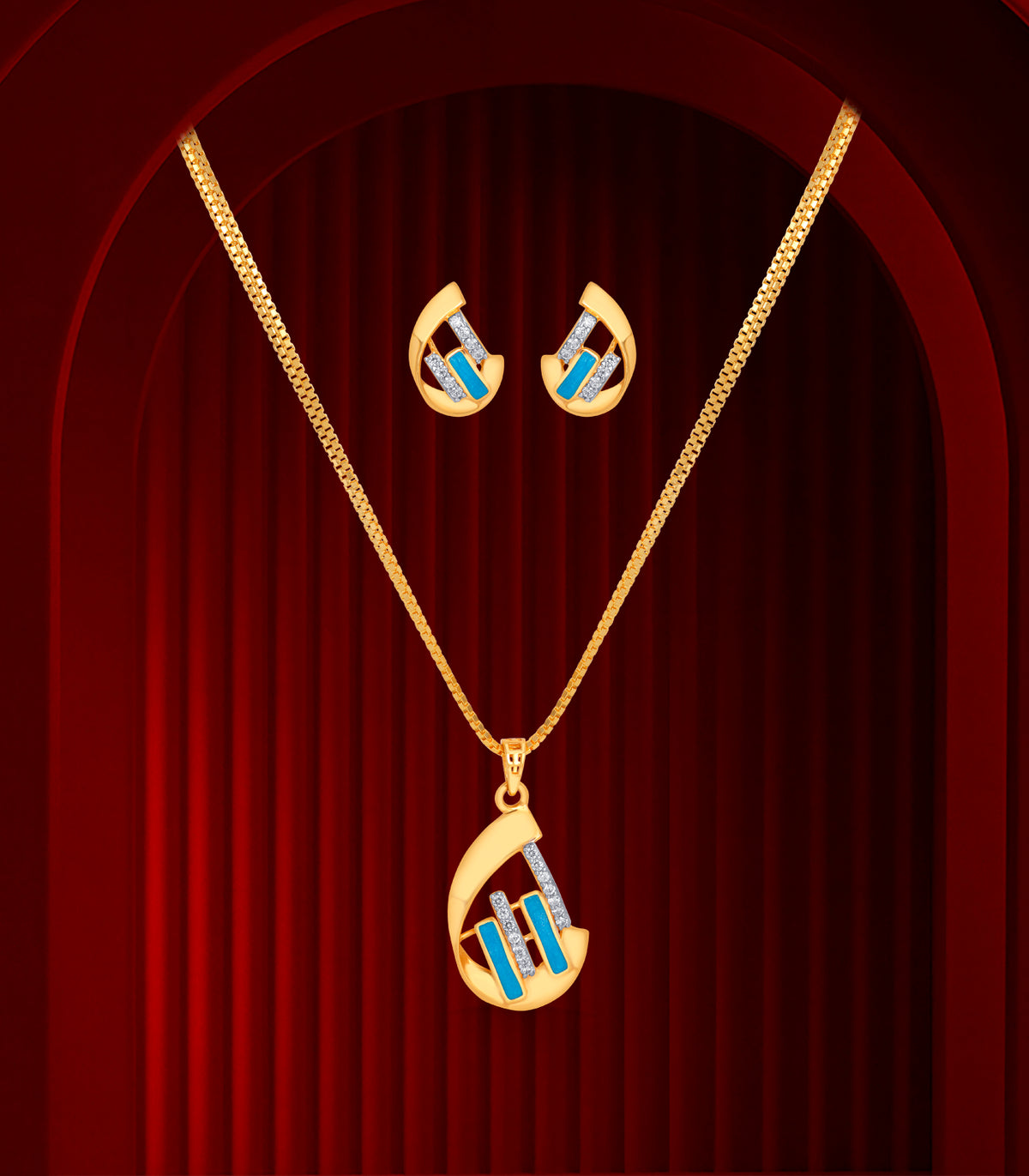 The Azure Muse Pendant Set captures the rhythm of modern artistry — a perfect harmony of gold, blue enamel, and shimmering stones.