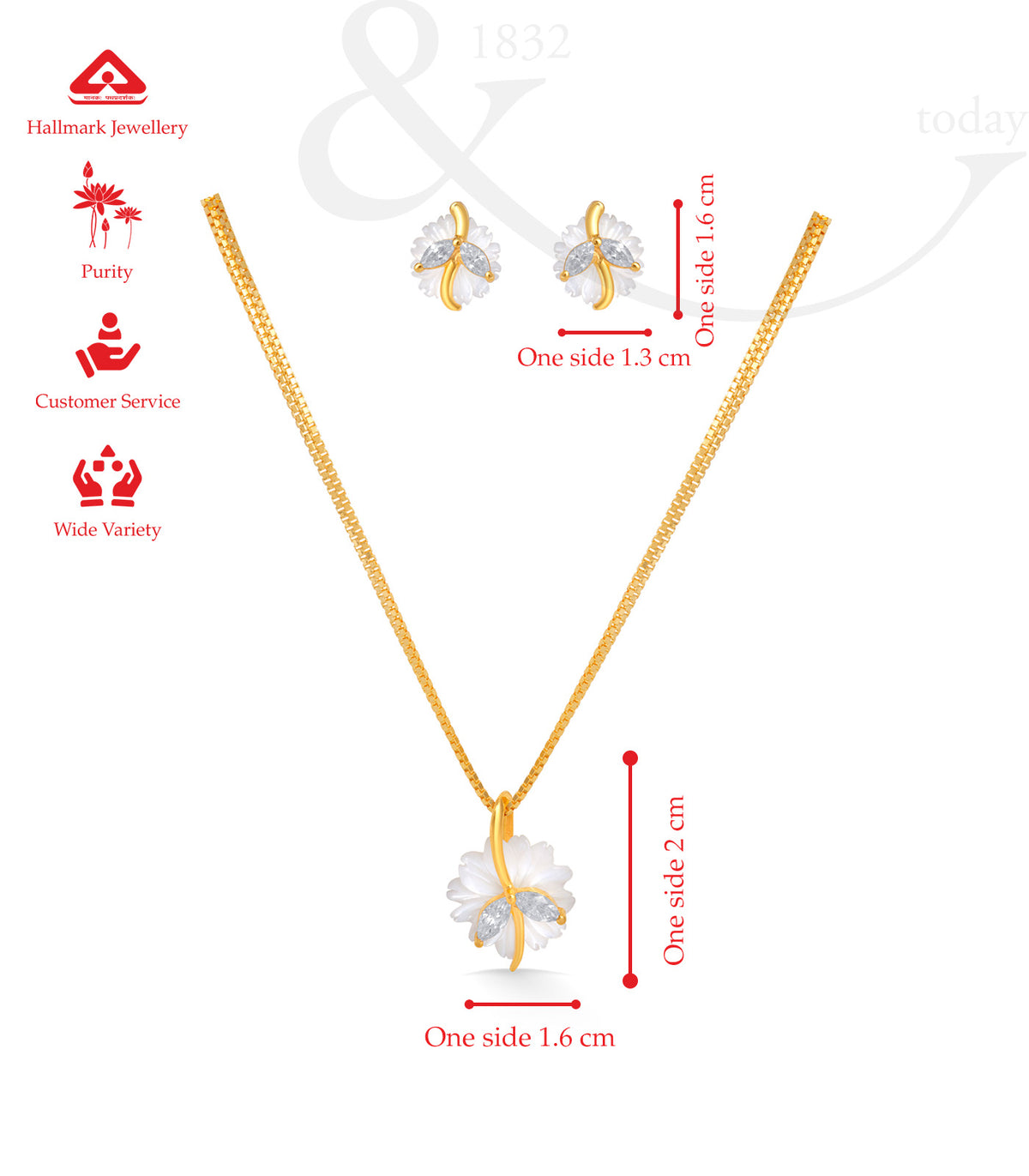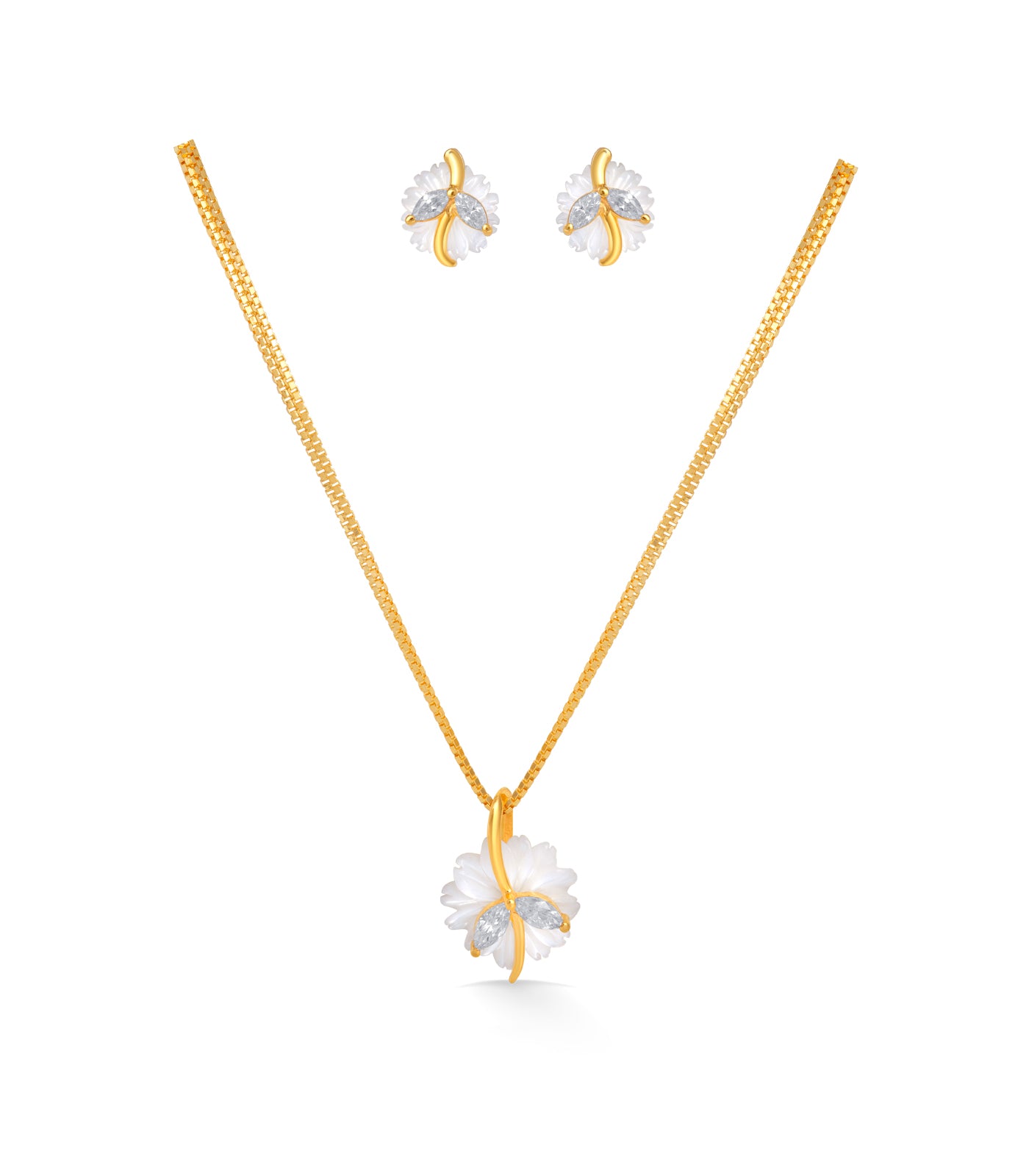 Material- Crafted in pure 22 K gold, this set features finely carved white floral elements and is embellished with high-quality cubic zirconia stones that enhance its luxurious appeal.