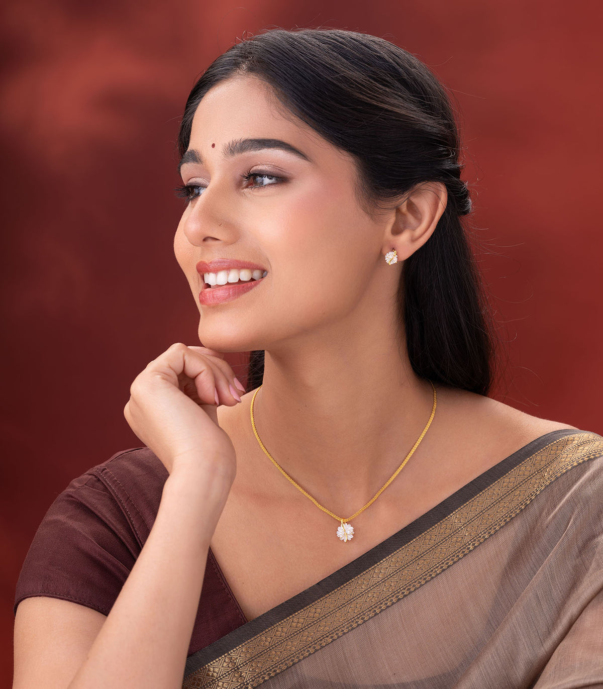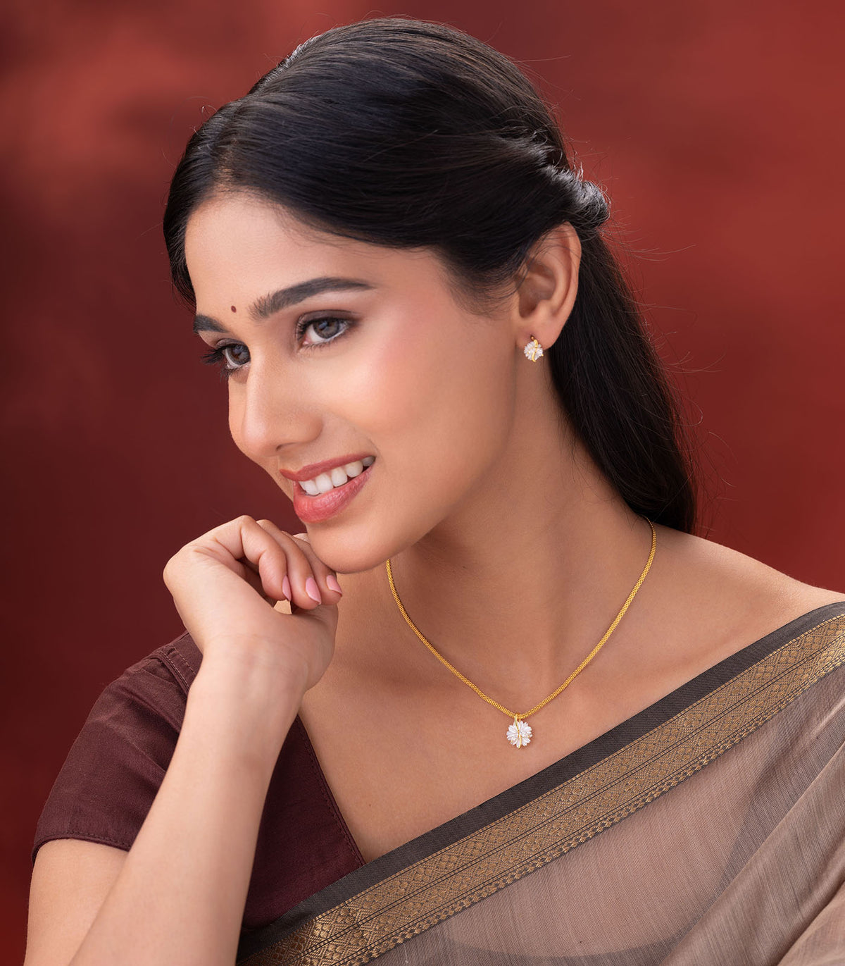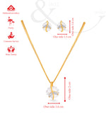Design- The design is inspired by nature, with a soft, floral motif wrapped gently in a gold curve that exudes elegance. The lightweight structure ensures comfortable wear, while the matching earrings complete the look, making it ideal for any age group.