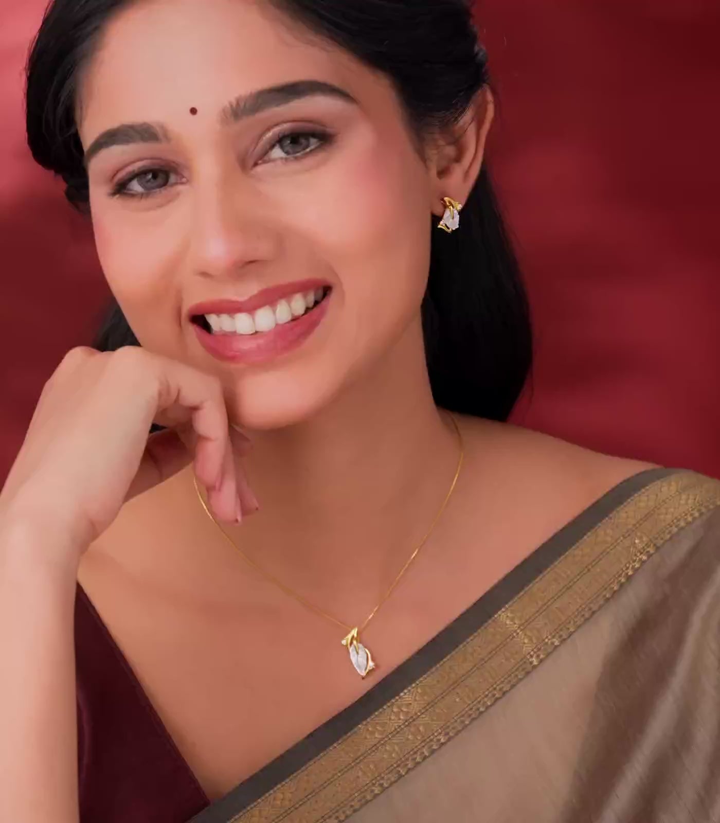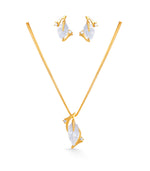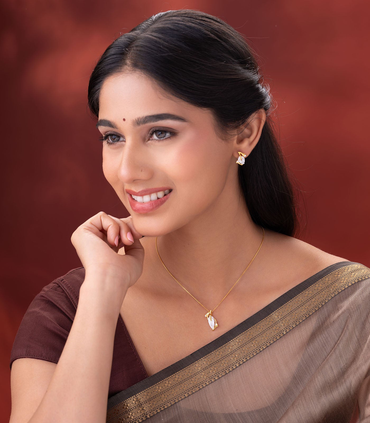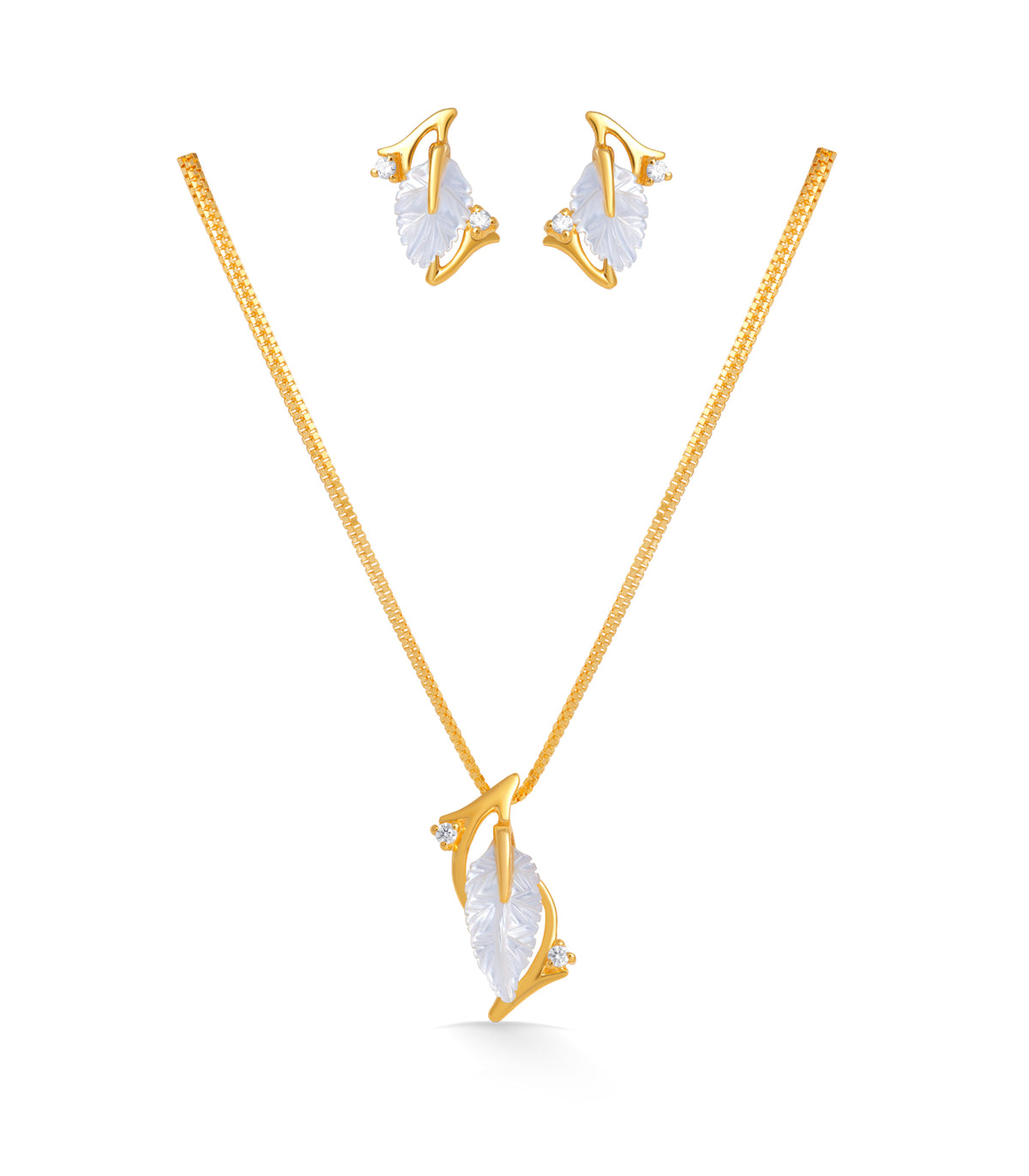 Design: Inspired by the tranquil beauty of nature, the pendant and earrings highlight a carved leaf delicately wrapped in golden curves, giving a modern and organic aesthetic. The minimal sparkle adds to its refined charm.