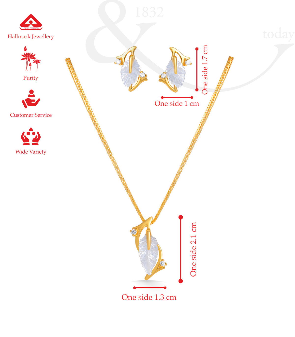 Material: Crafted in pure 22K hallmarked gold, the set features a beautifully sculpted white leaf centerpiece enhanced with subtle cubic zirconia stones and elegant gold framework.