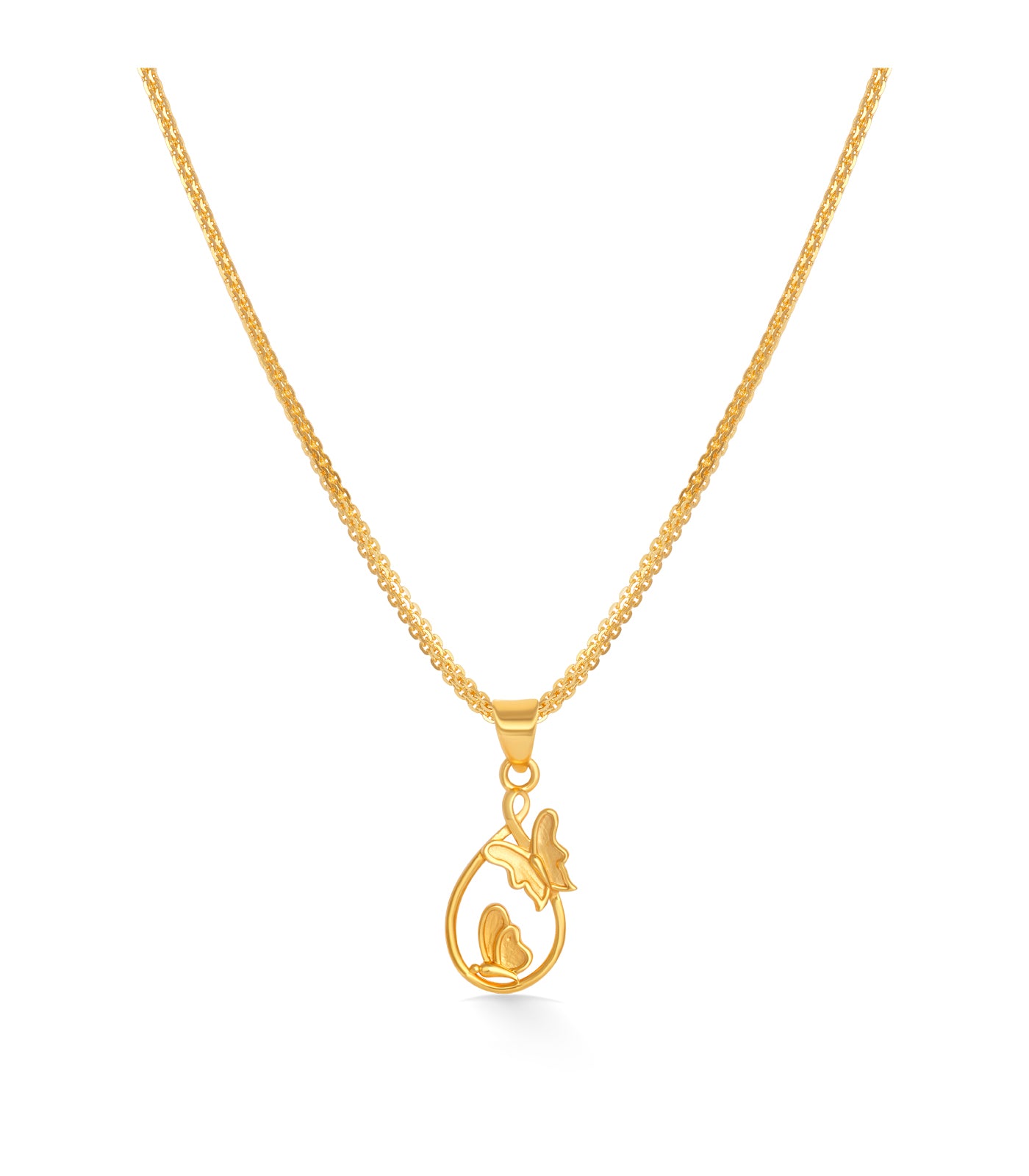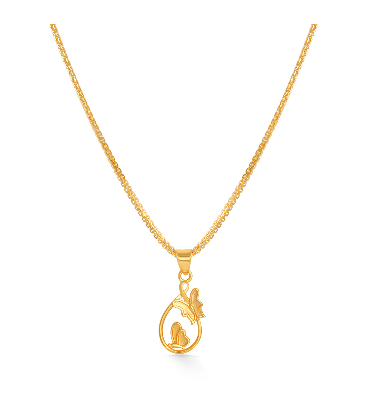 The Butterfly Charm Gold Pendant captures the beauty of nature in a delicate design. Crafted in 22KT gold, this pendant features two graceful butterflies resting on a teardrop-shaped frame, symbolizing freedom, transformation, and elegance.