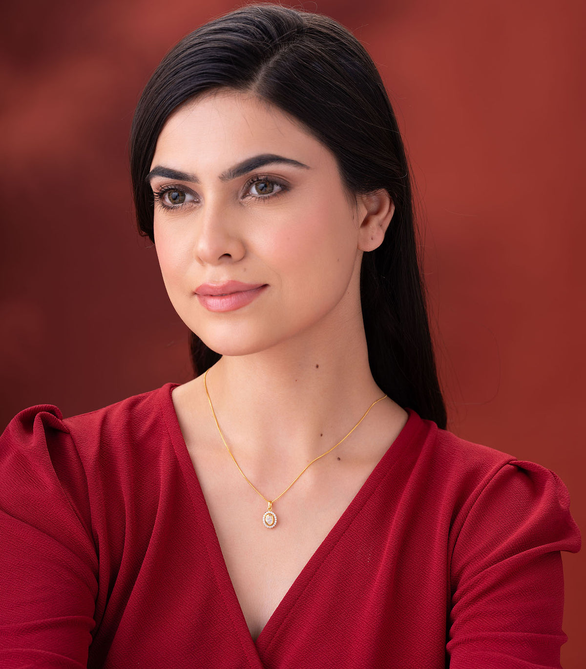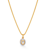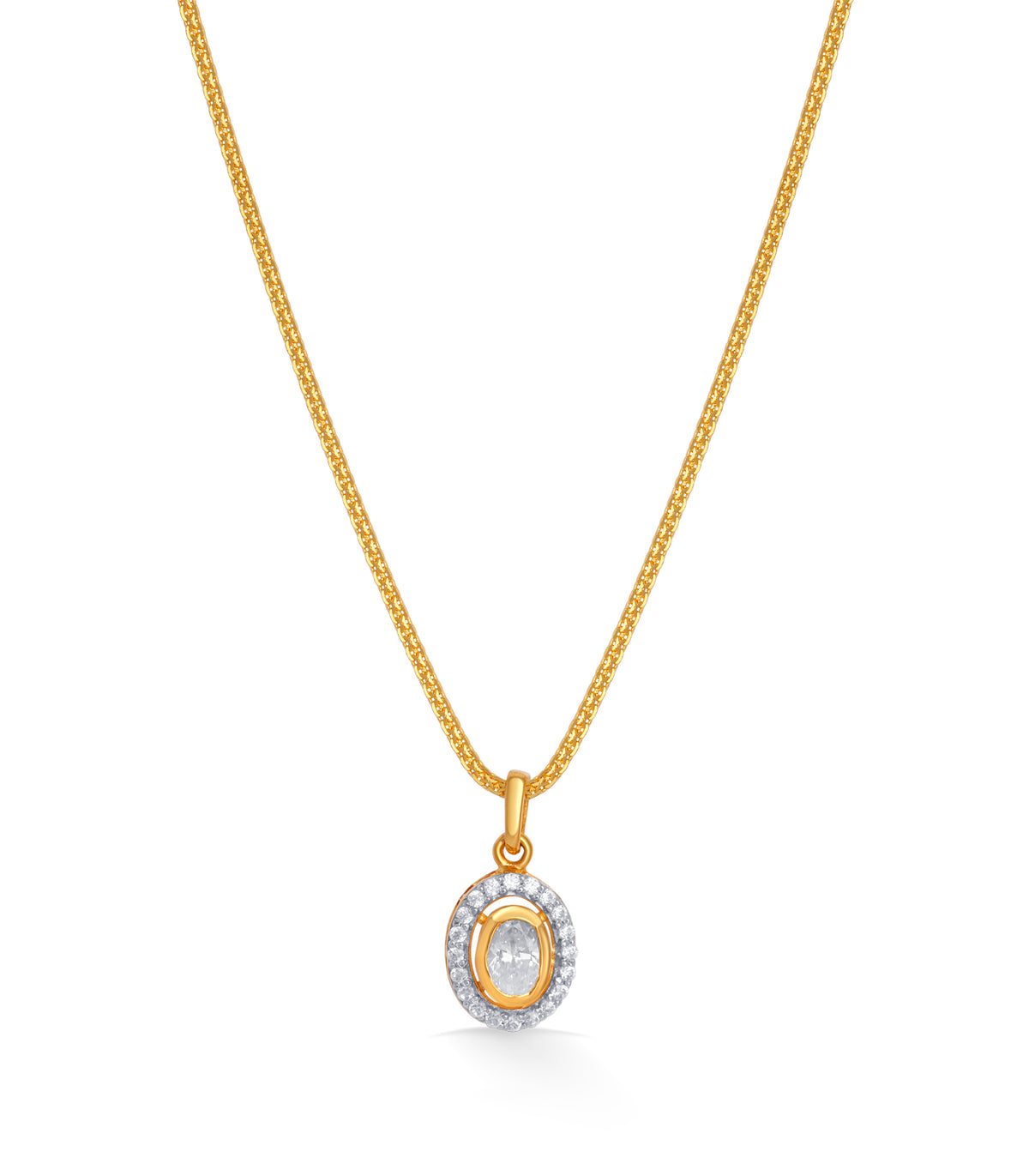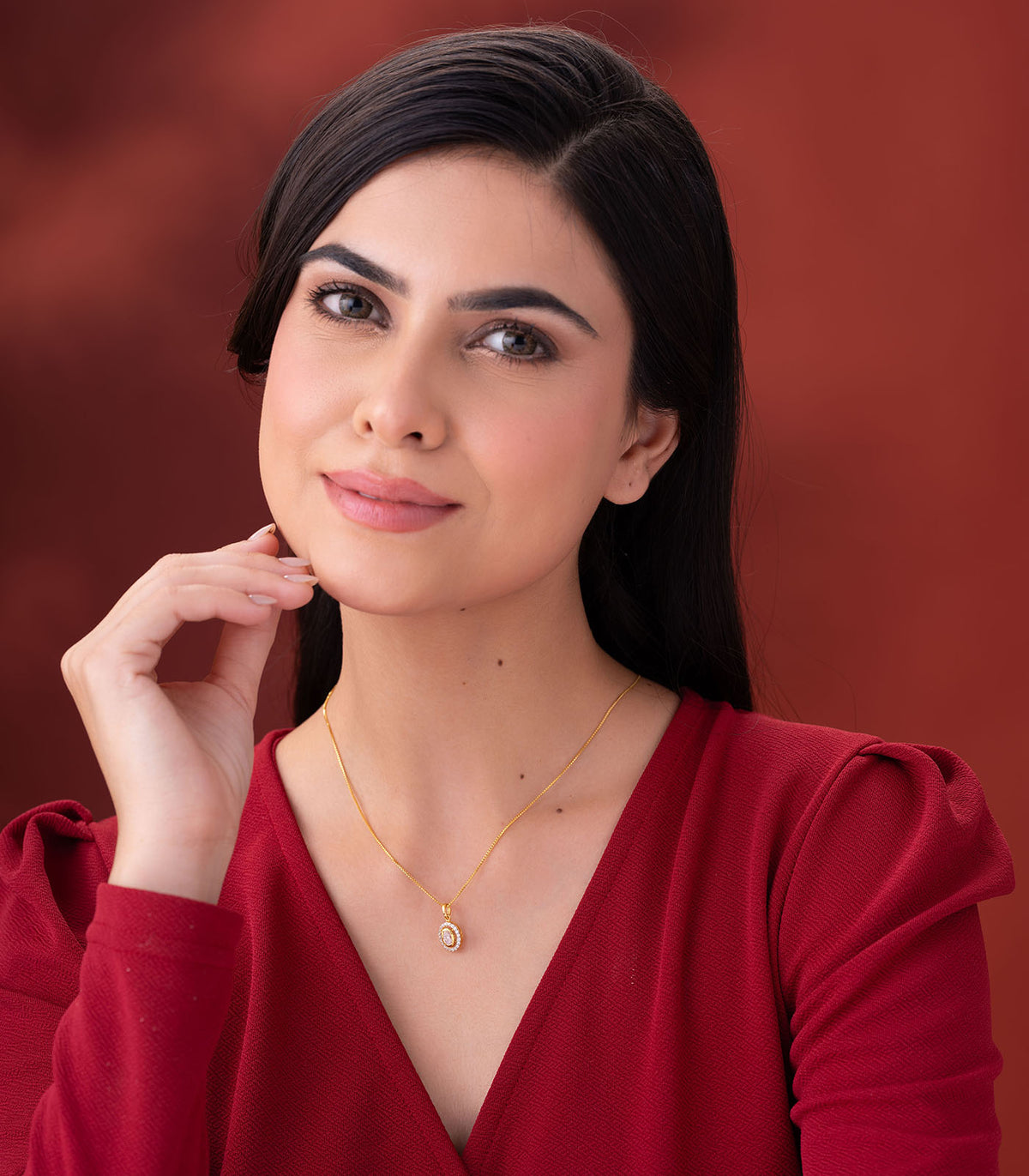 The Elara Oval Pendant radiates timeless beauty with its elegant oval design. At the center lies a luminous precious stone, encircled by a halo of sparkling accents that enhance its brilliance. Crafted in gold, this pendant strikes the perfect balance between classic sophistication and everyday versatility.