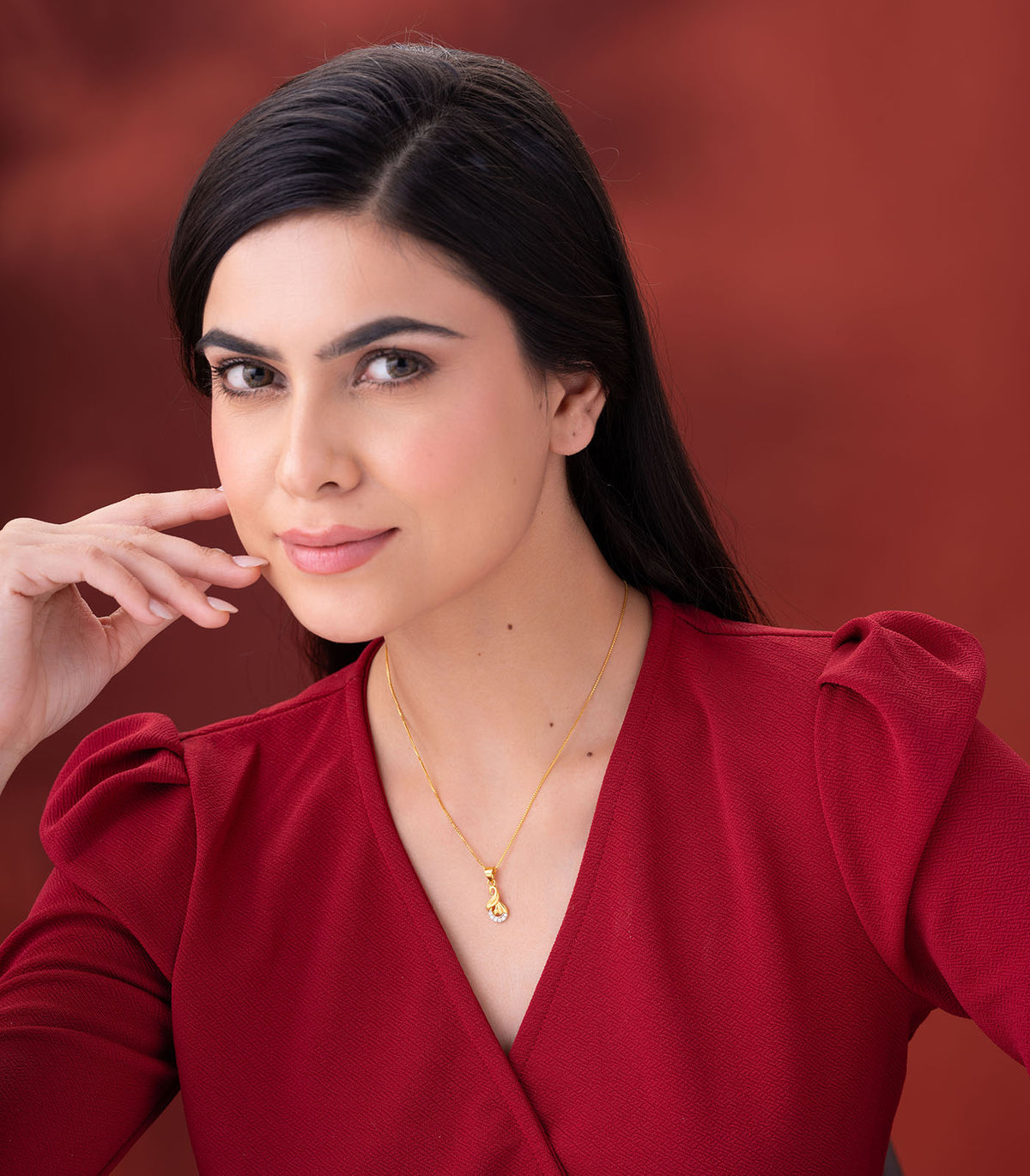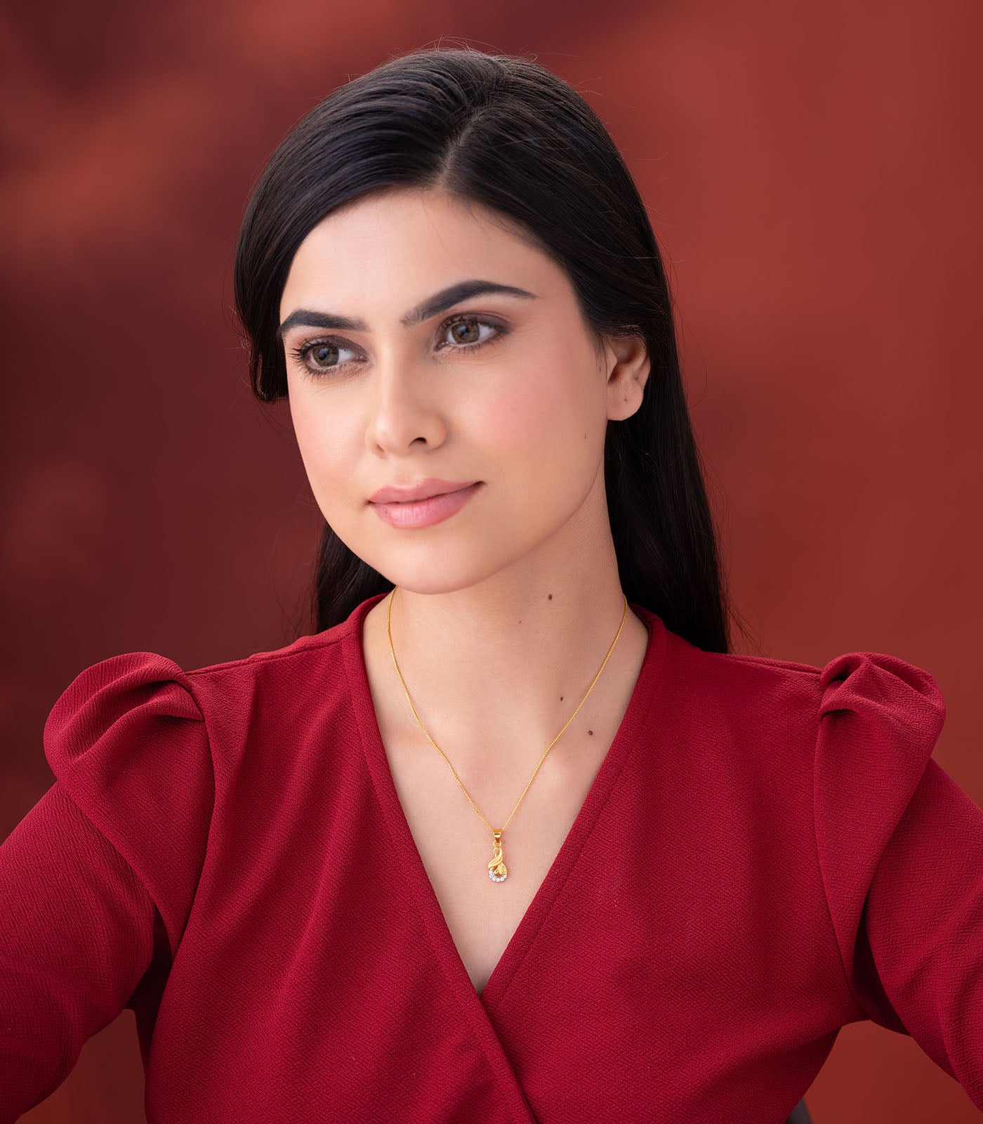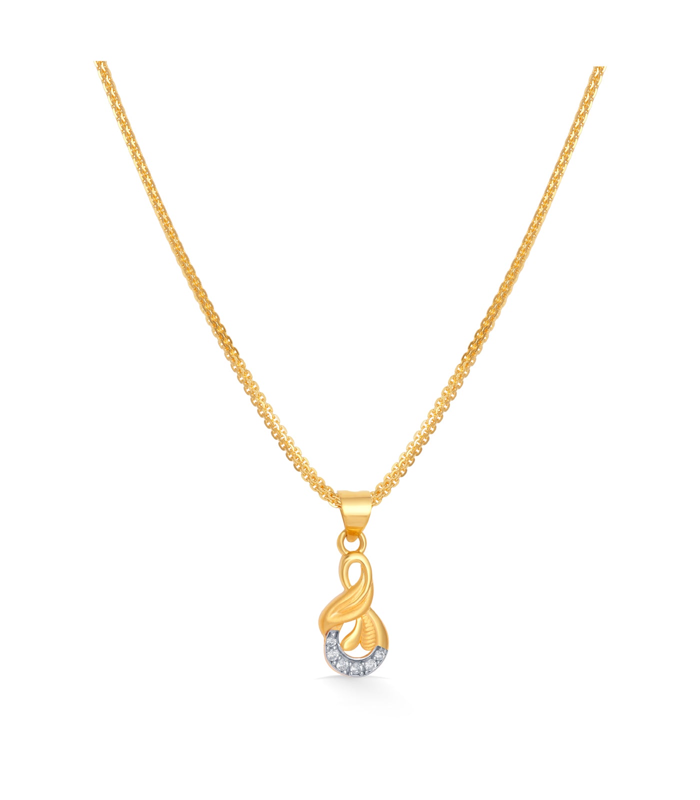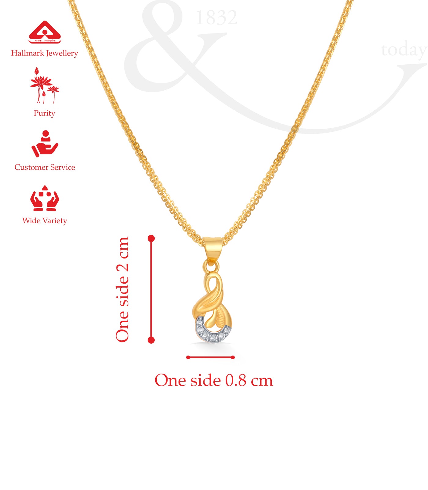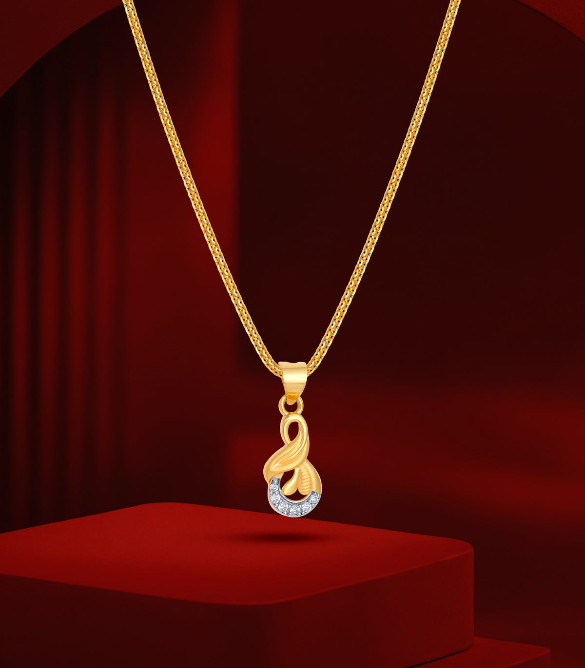 The Flora Loop Gold Pendant blends natural elegance with modern artistry. Crafted in 22KT gold, this pendant features a graceful loop design that intertwines with a delicate leaf motif, accented by shimmering studded stones at the base. Its fluid design symbolizes continuity and growth, making it a versatile piece for daily wear as well as festive styling.