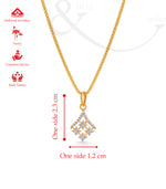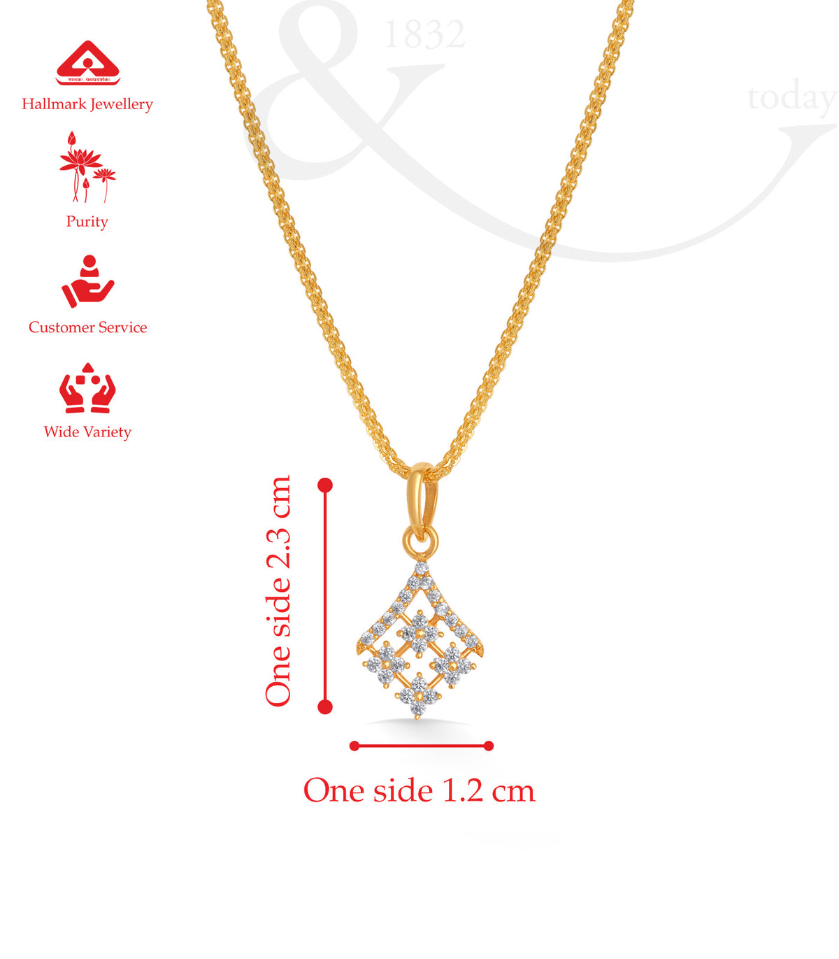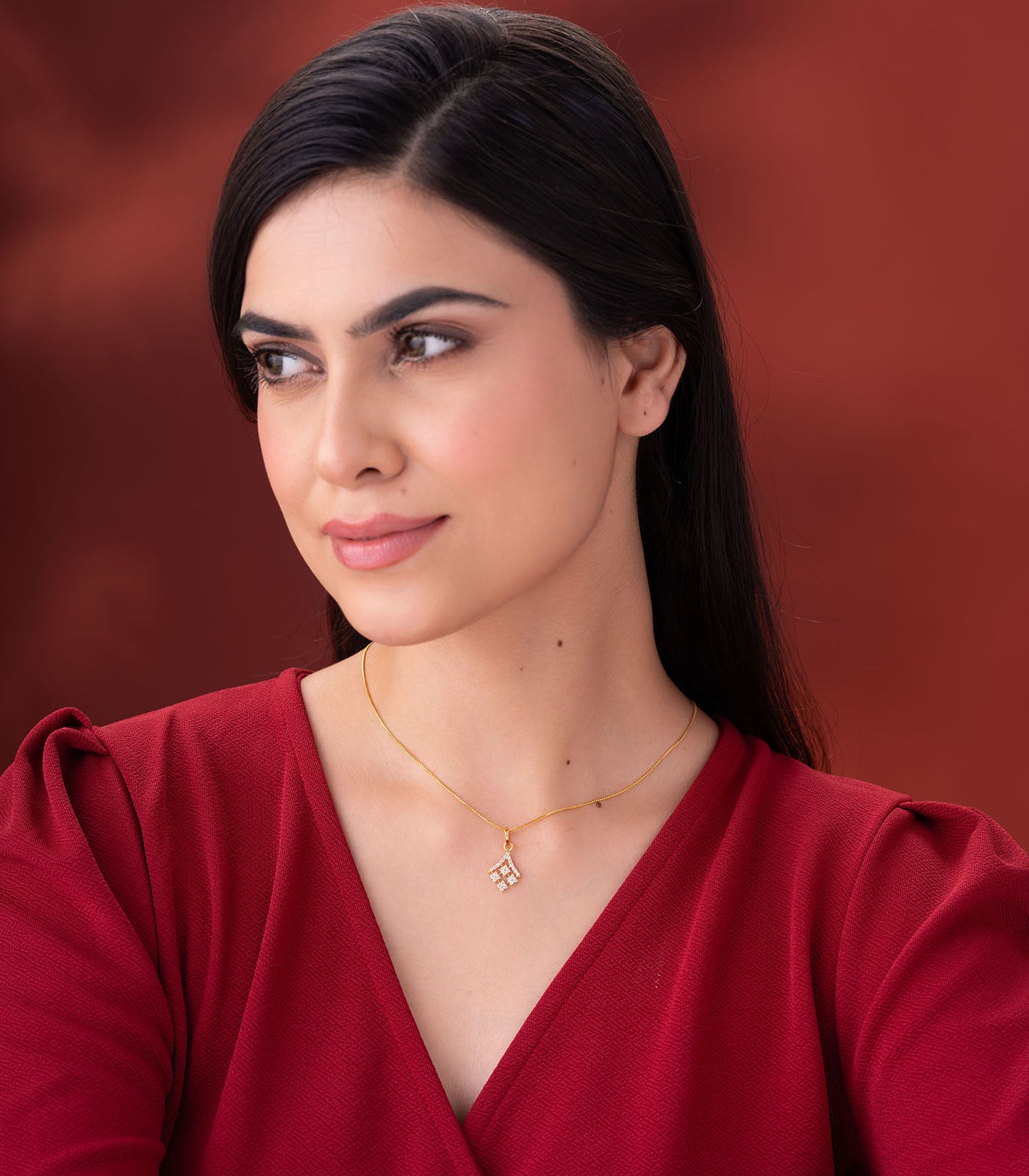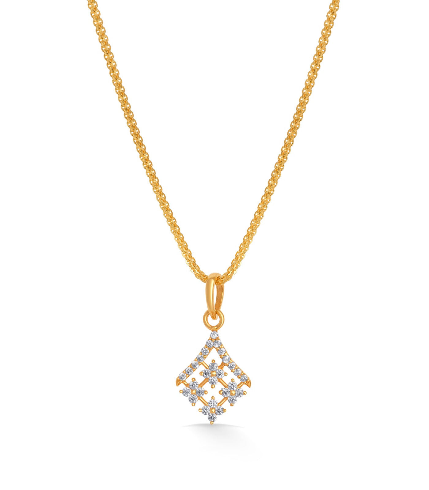 The Noor Lattice Gold Pendant by P.N. Gadgil & Sons is a graceful fusion of geometry and sparkle. Crafted in 22KT yellow gold, the pendant features a lattice-inspired precious stones motif adorned with delicate floral accents, each highlighted with sparkling details. Its refined design captures both symmetry and radiance, making it an elegant choice for modern yet traditional styling.