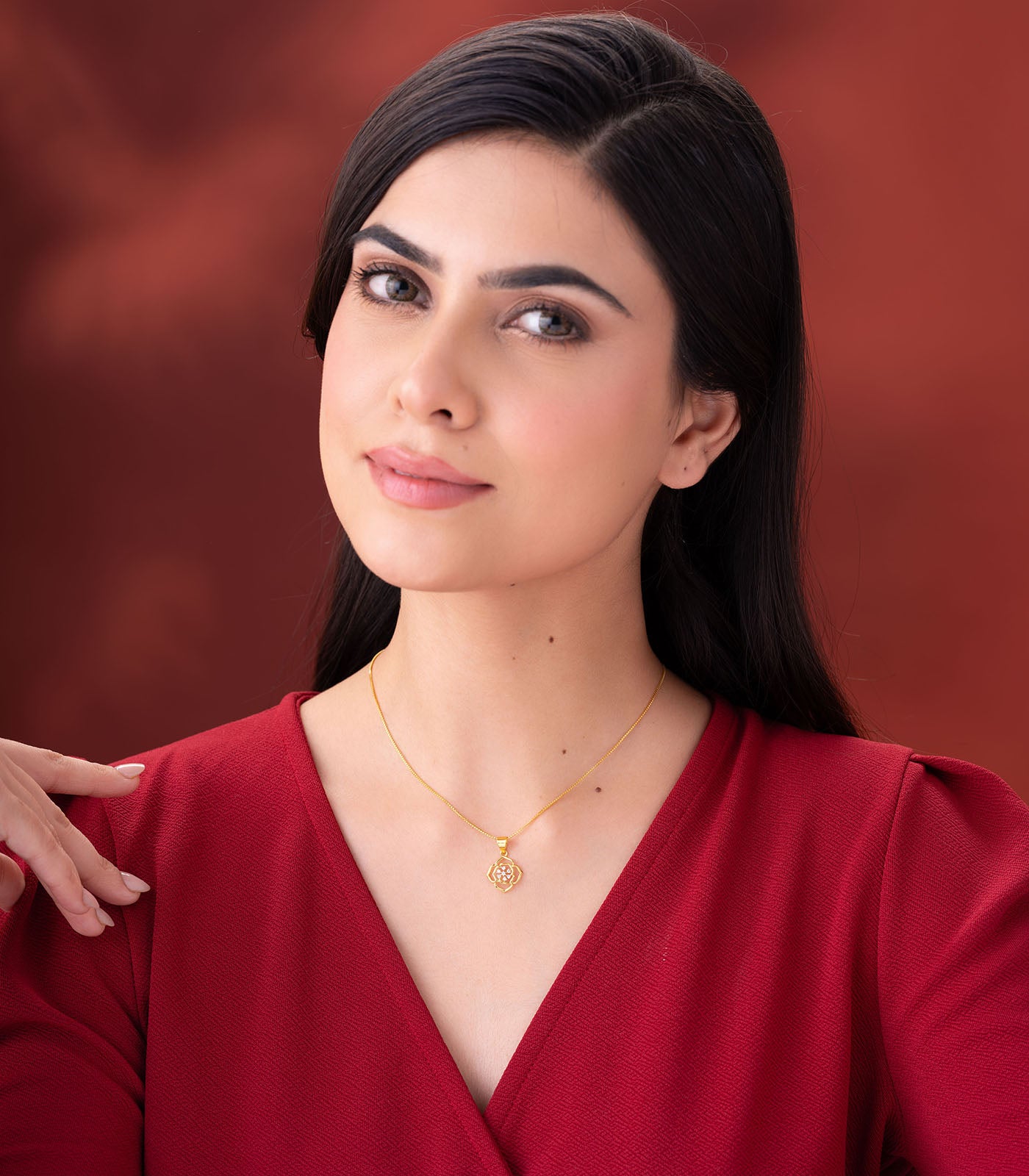 The Roselle Gold Pendant draws inspiration from the timeless beauty of blooming flowers. Its open-petal gold frame encases a sparkling cluster at the center, symbolizing purity, renewal, and elegance.