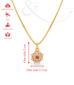 The Ruby Bloom Gold Pendant by P.N. Gadgil & Sons is a radiant symbol of elegance and tradition. Crafted in 22KT yellow gold, this pendant features a blossoming floral motif with a vivid ruby at the center, encircled by sparkling accents that enhance its brilliance. The vibrant red contrasts beautifully with the gold, creating a striking yet graceful design.