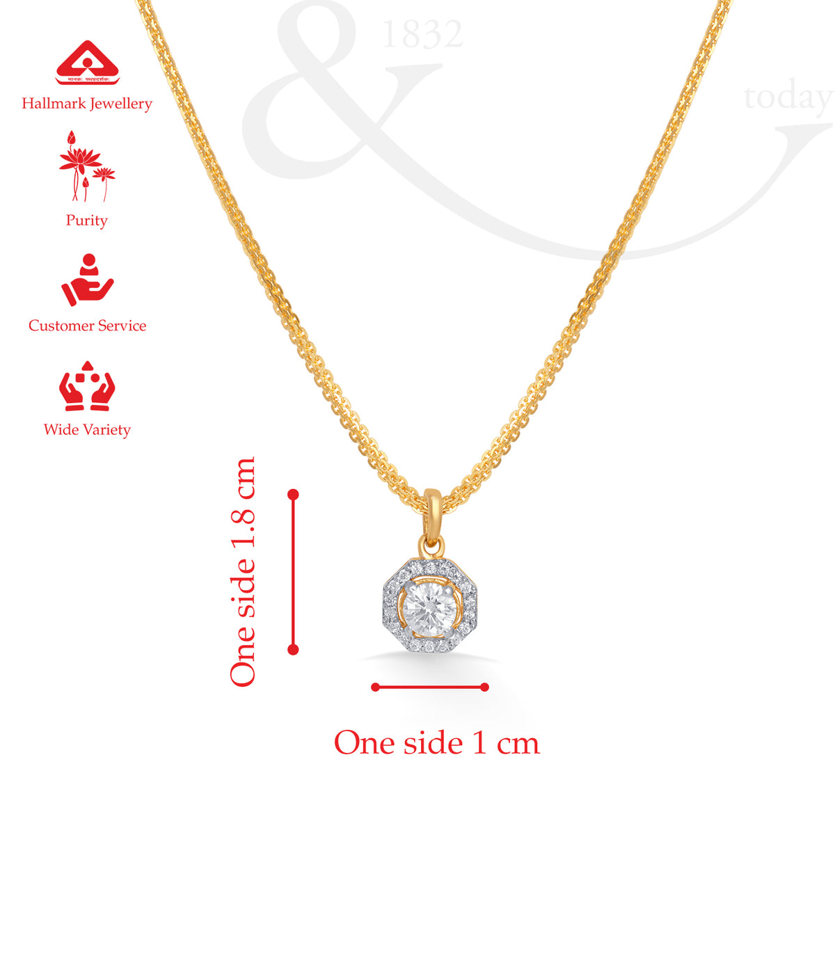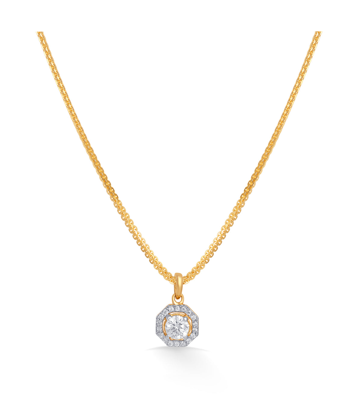 Elevate your everyday elegance with the Stone Studded Gold Pendant. Designed with a radiant round-cut centerpiece framed by a striking halo of finely set stones, this pendant captures light from every angle. Its octagonal silhouette adds a touch of modern geometry, while the warm gold finish ensures timeless appeal. Perfect for pairing with both festive attire and daily wear, it’s a versatile piece that balances sophistication with subtle sparkle.