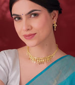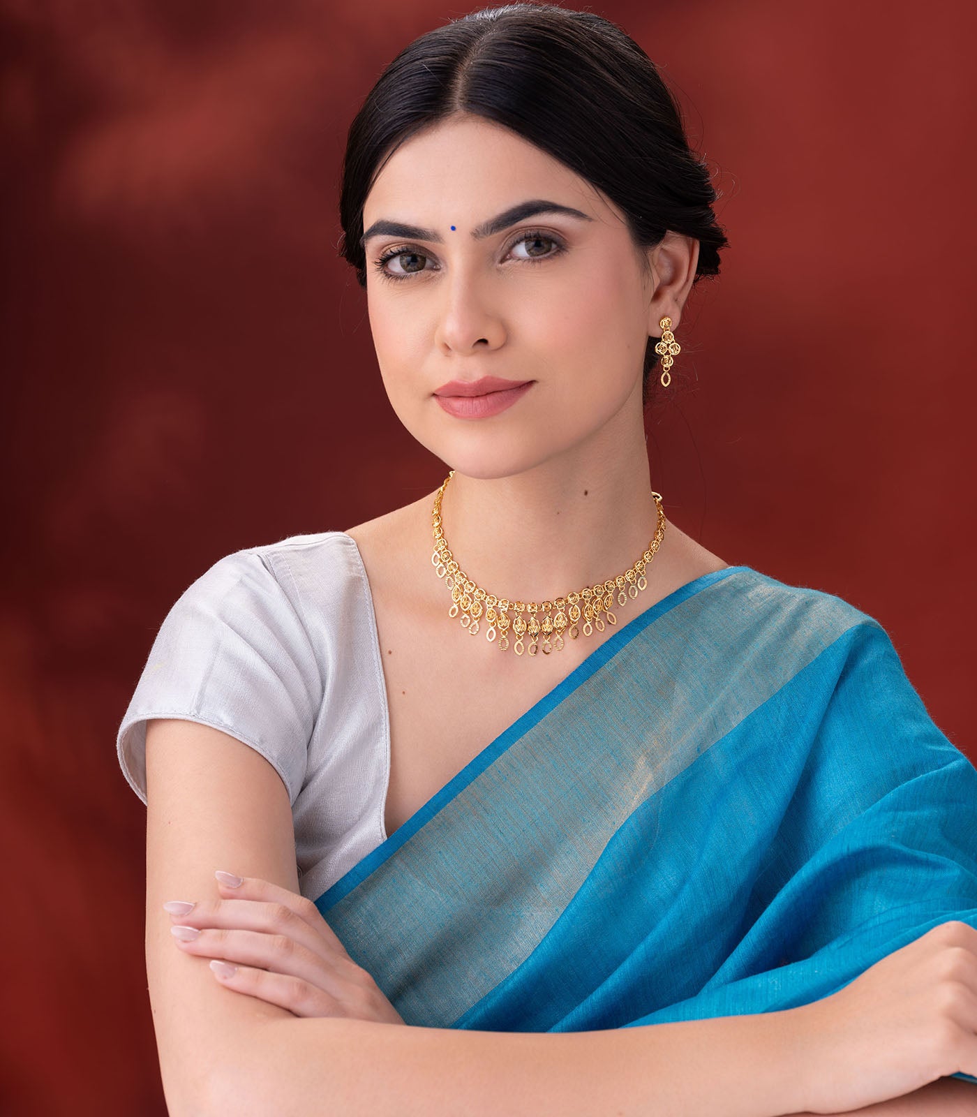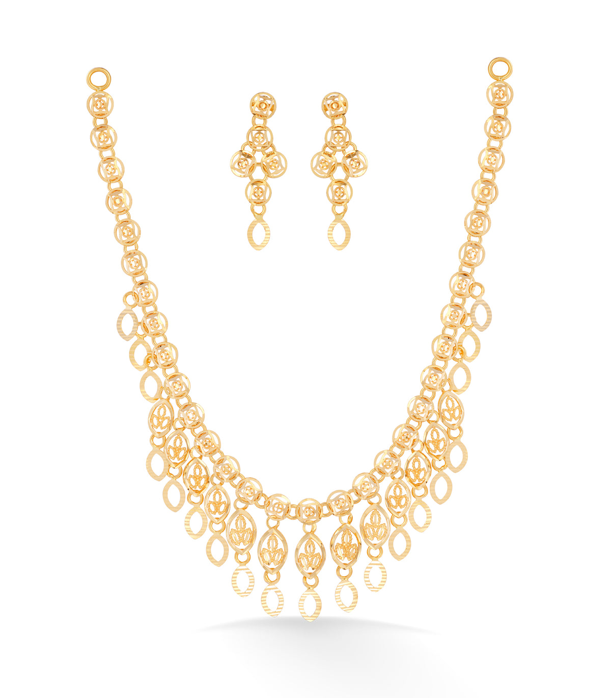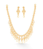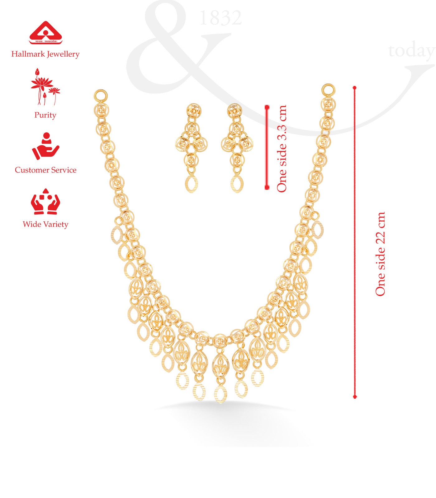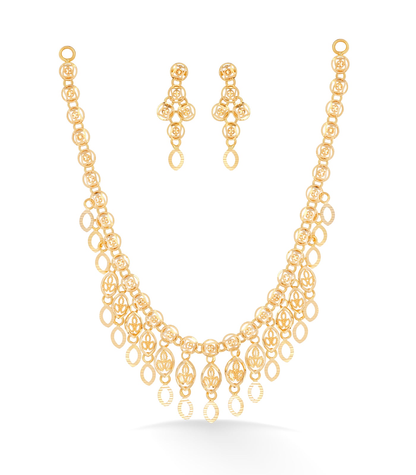 Celebrate timeless beauty with the Golden Bloom Drop Necklace Set. Handcrafted in 22KT gold, this elegant set features a cascade of floral-inspired motifs interlinked with intricate oval charms, creating a rhythmic play of light and form. The dangling drops add a graceful movement, making it the perfect blend of traditional artistry and modern sophistication. Paired with complementing floral drop earrings, this set is a versatile choice for weddings, festive occasions, or heirloom-worthy celebrations.