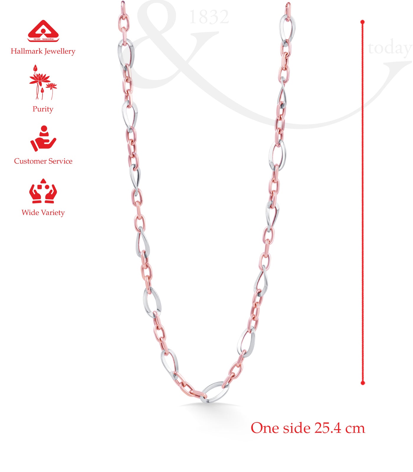 - Design: Alternating oval and elongated interlinks in dual tones