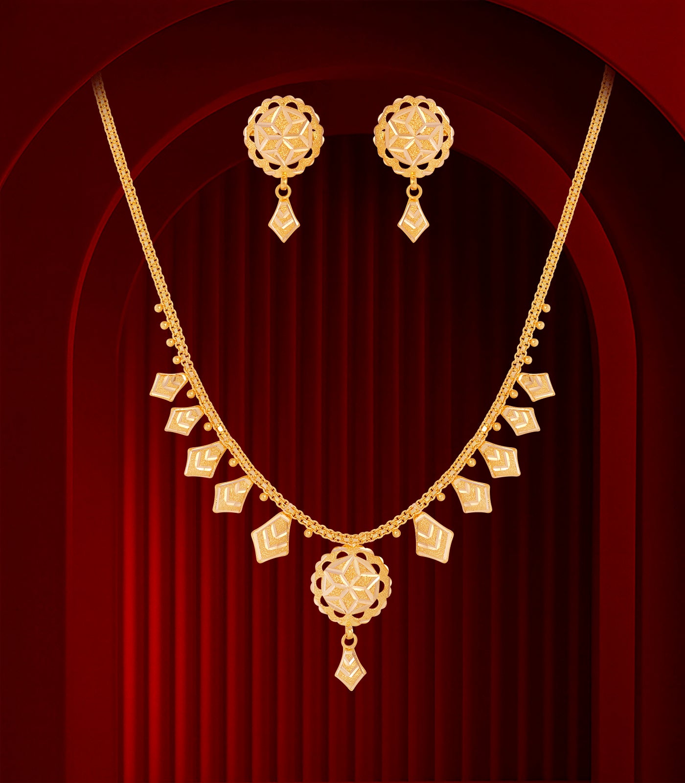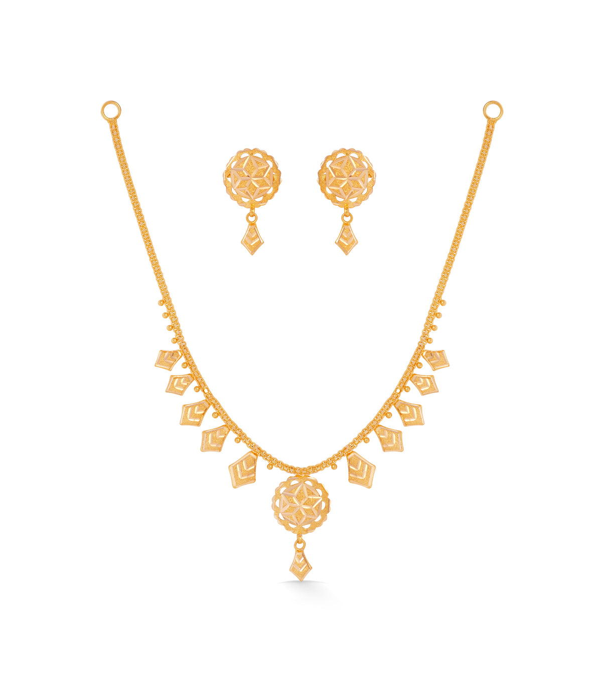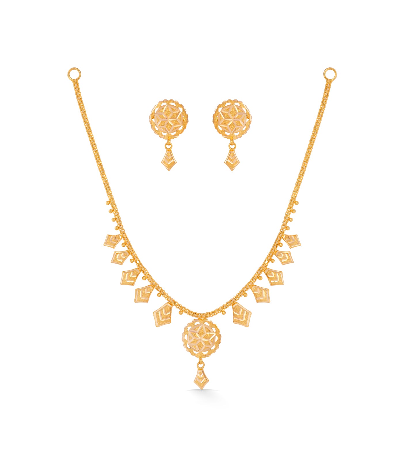 Celebrate timeless elegance with the Eternal Radiance Necklace Set by P.N. Gadgil & Sons. Crafted in 22KT gold, this stunning design features a mandala-inspired central pendant with geometric precious stones danglers that add a modern twist to traditional artistry. The necklace is beautifully paired with matching earrings, making it a versatile choice for weddings, festive celebrations, and cultural occasions. A perfect blend of heritage and sophistication, this set elevates any traditional look with its radiant charm.