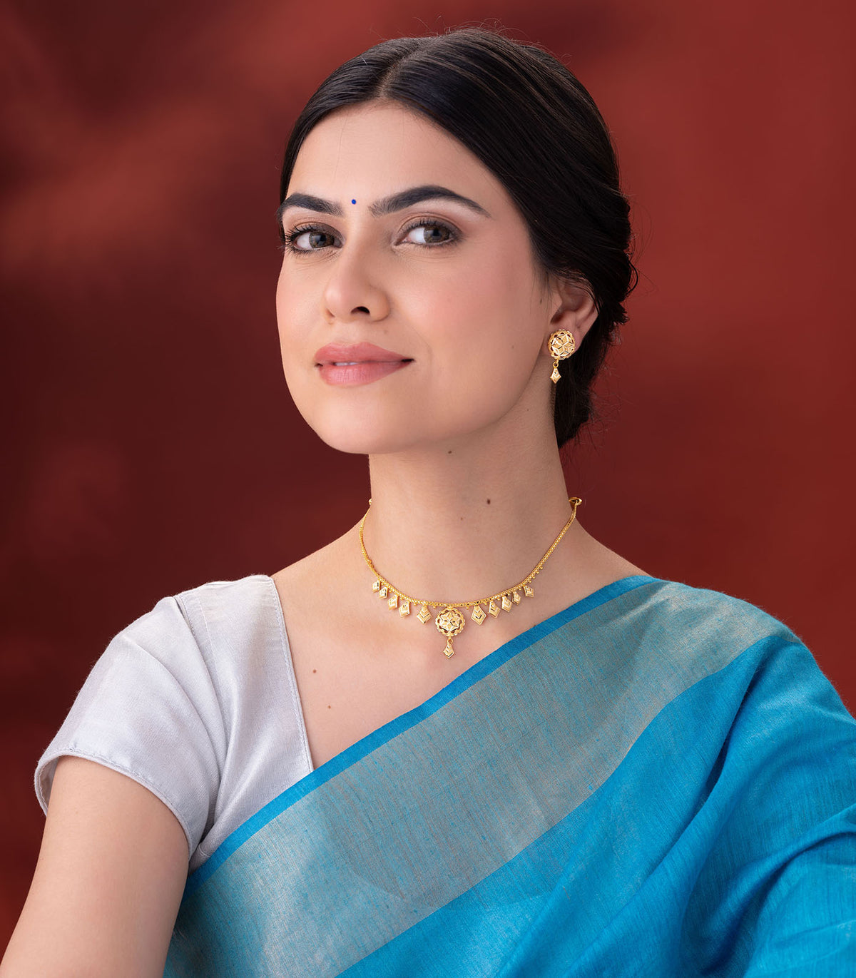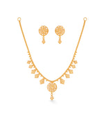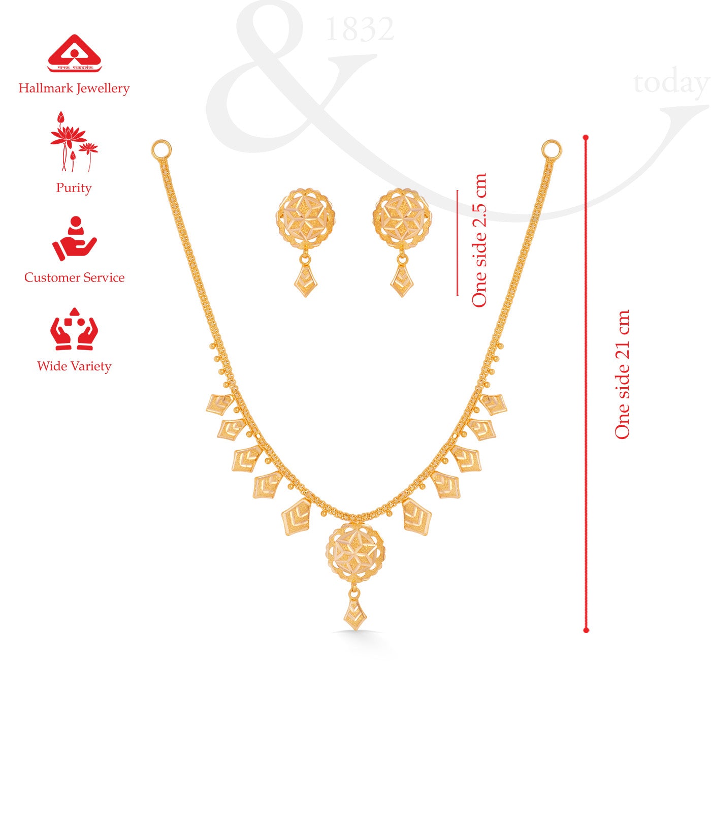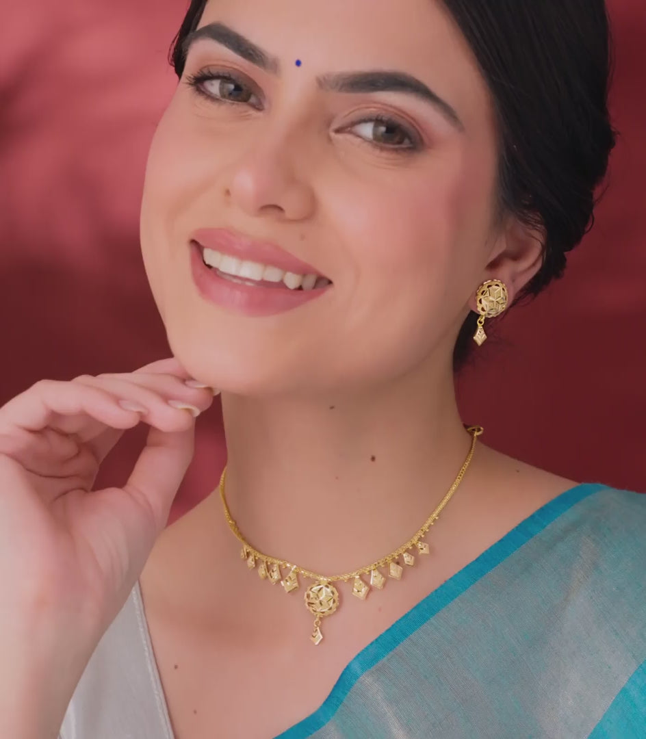 Celebrate timeless elegance with the Eternal Radiance Necklace Set by P.N. Gadgil & Sons. Crafted in 22KT gold, this stunning design features a mandala-inspired central pendant with geometric precious stones danglers that add a modern twist to traditional artistry. The necklace is beautifully paired with matching earrings, making it a versatile choice for weddings, festive celebrations, and cultural occasions. A perfect blend of heritage and sophistication, this set elevates any traditional look with its radiant charm.