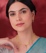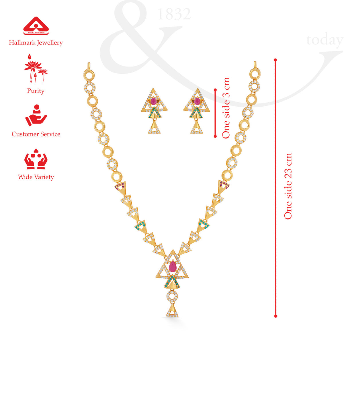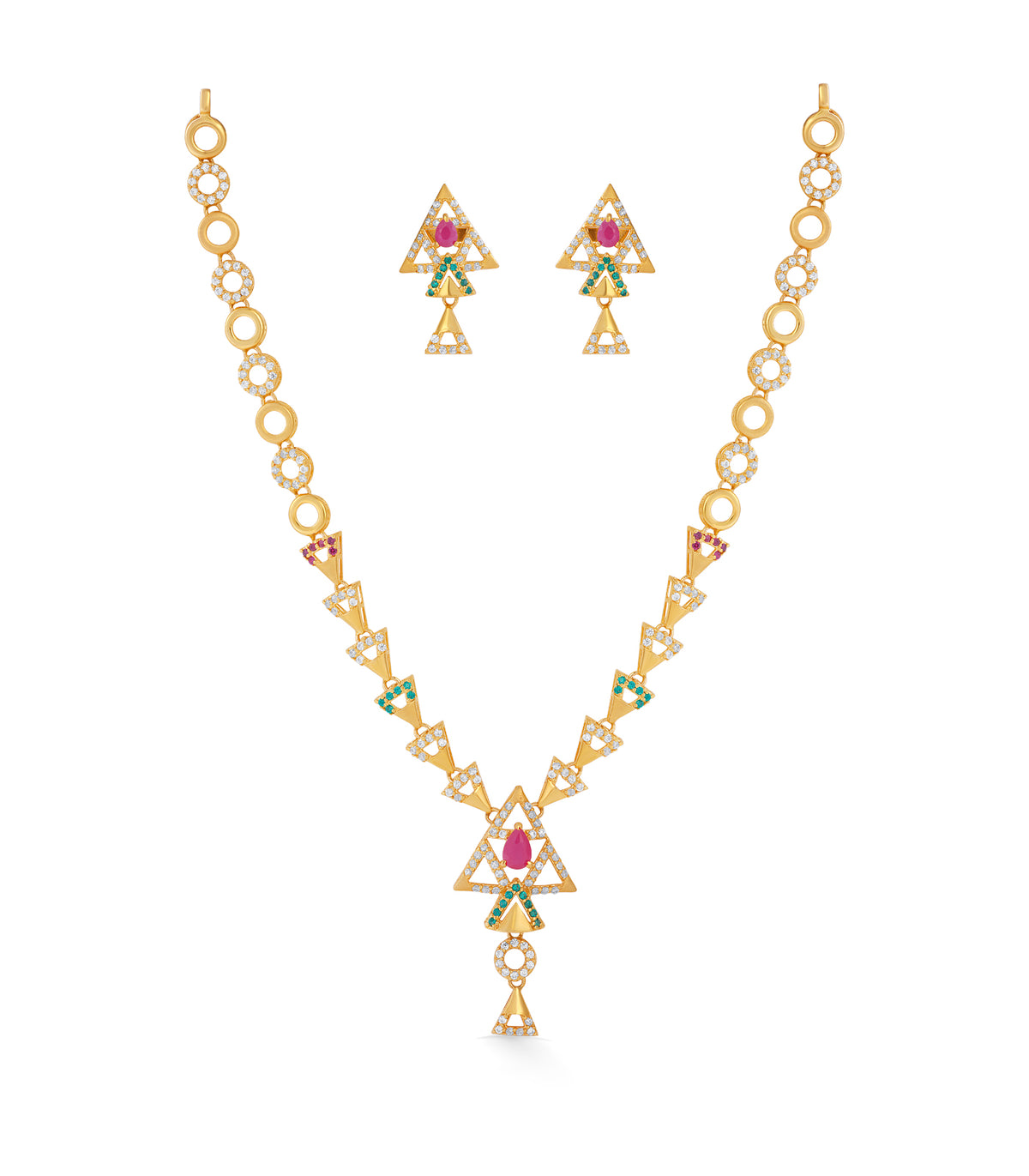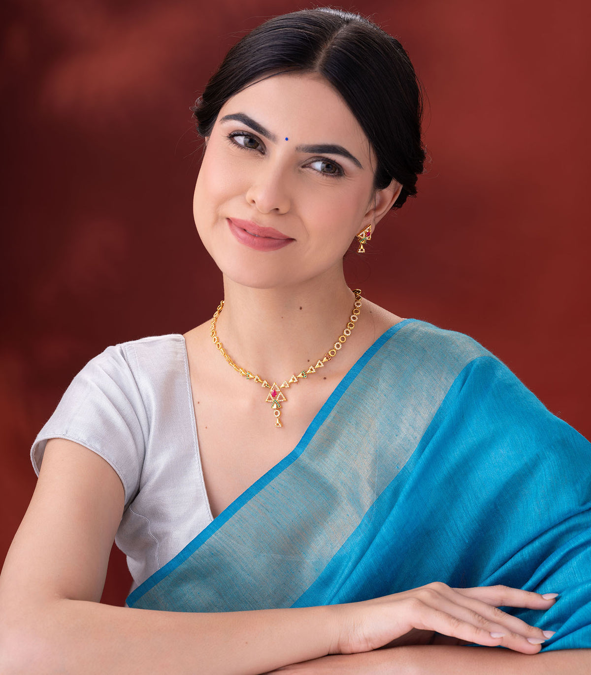 The Triya Gold Necklace Set by P.N. Gadgil & Sons is an ode to the power and elegance of feminine grace. Crafted in 22KT gold, its bold triangular motifs form a striking pattern that beautifully blends tradition with contemporary artistry.
