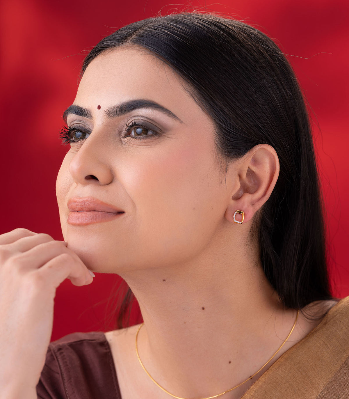 The Aurora Edge Gold Earrings are a modern take on minimal brilliance. Designed with sleek geometric curves and a subtle precious stone-lined edge, this pair captures the balance of boldness and refinement.