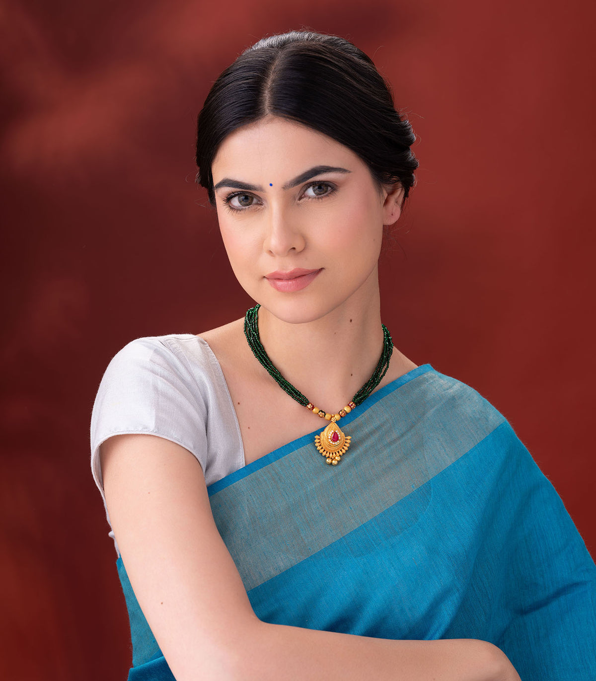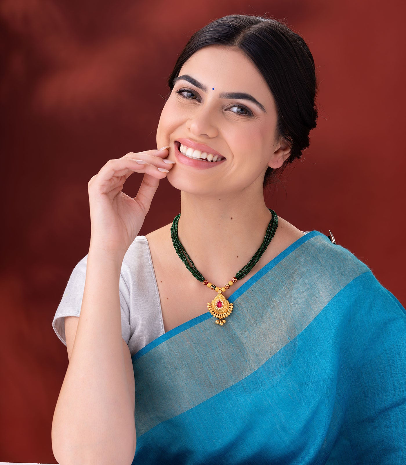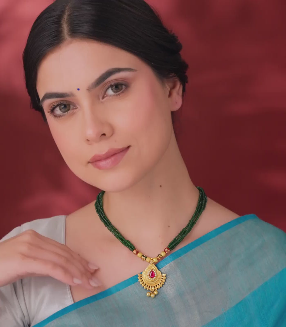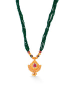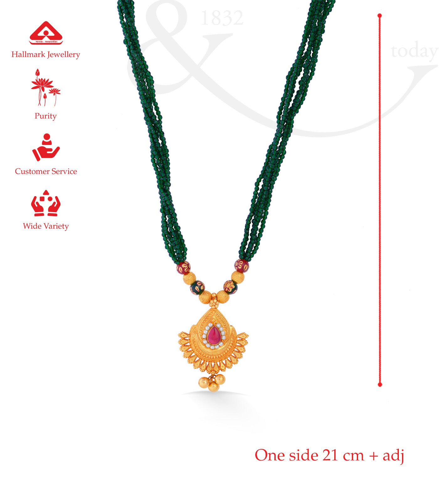 Elevate your traditional look with the Beaded Necklace with Multi-Strand Green Beads by P.N. Gadgil & Sons. Crafted in radiant 22K gold, this elegant piece features a beautifully designed gold centerpiece paired with multiple strands of black beads, symbolizing grace and cultural heritage. Perfect for daily wear, festive occasions, or gifting, this necklace effortlessly blends tradition with timeless style.