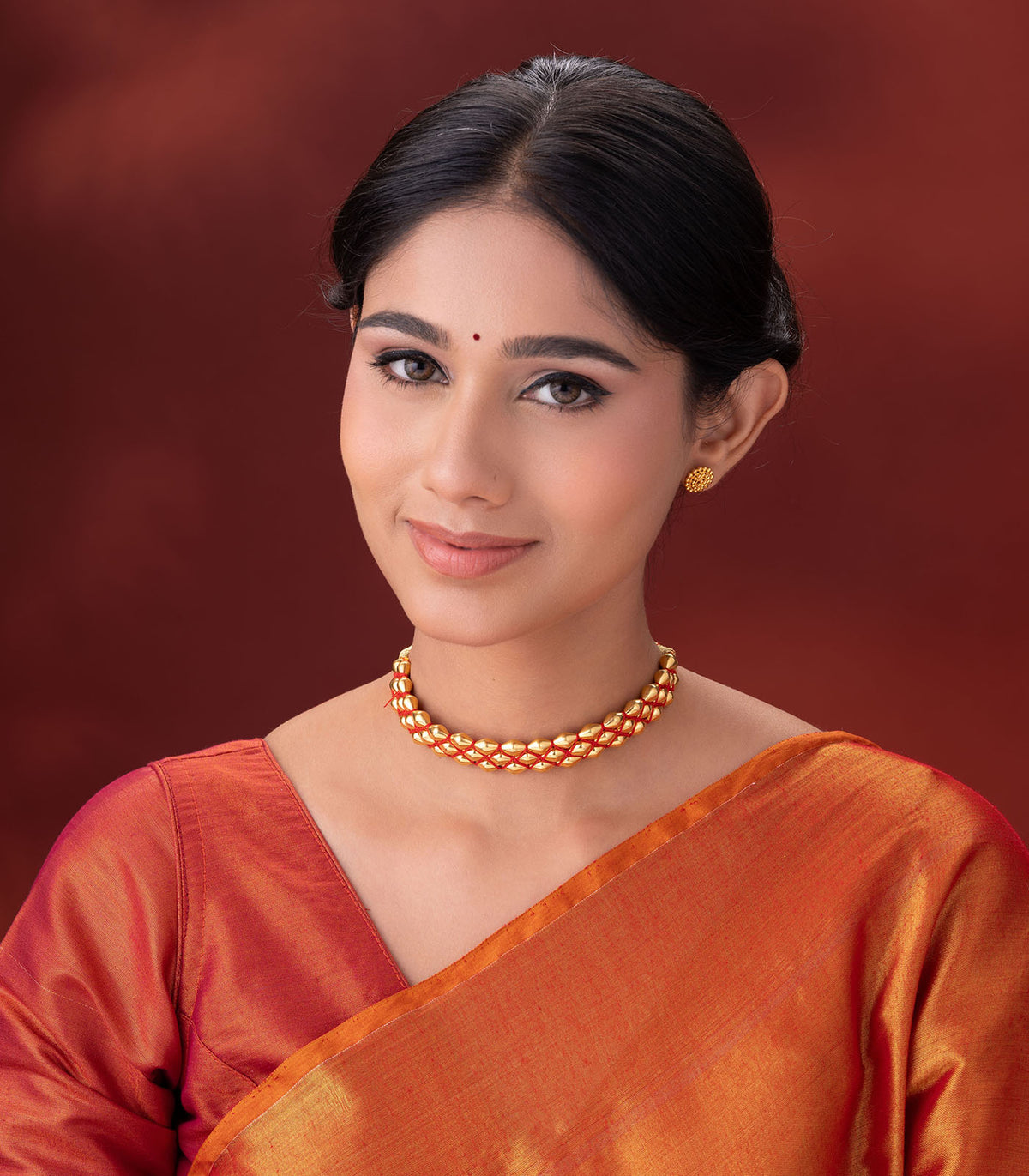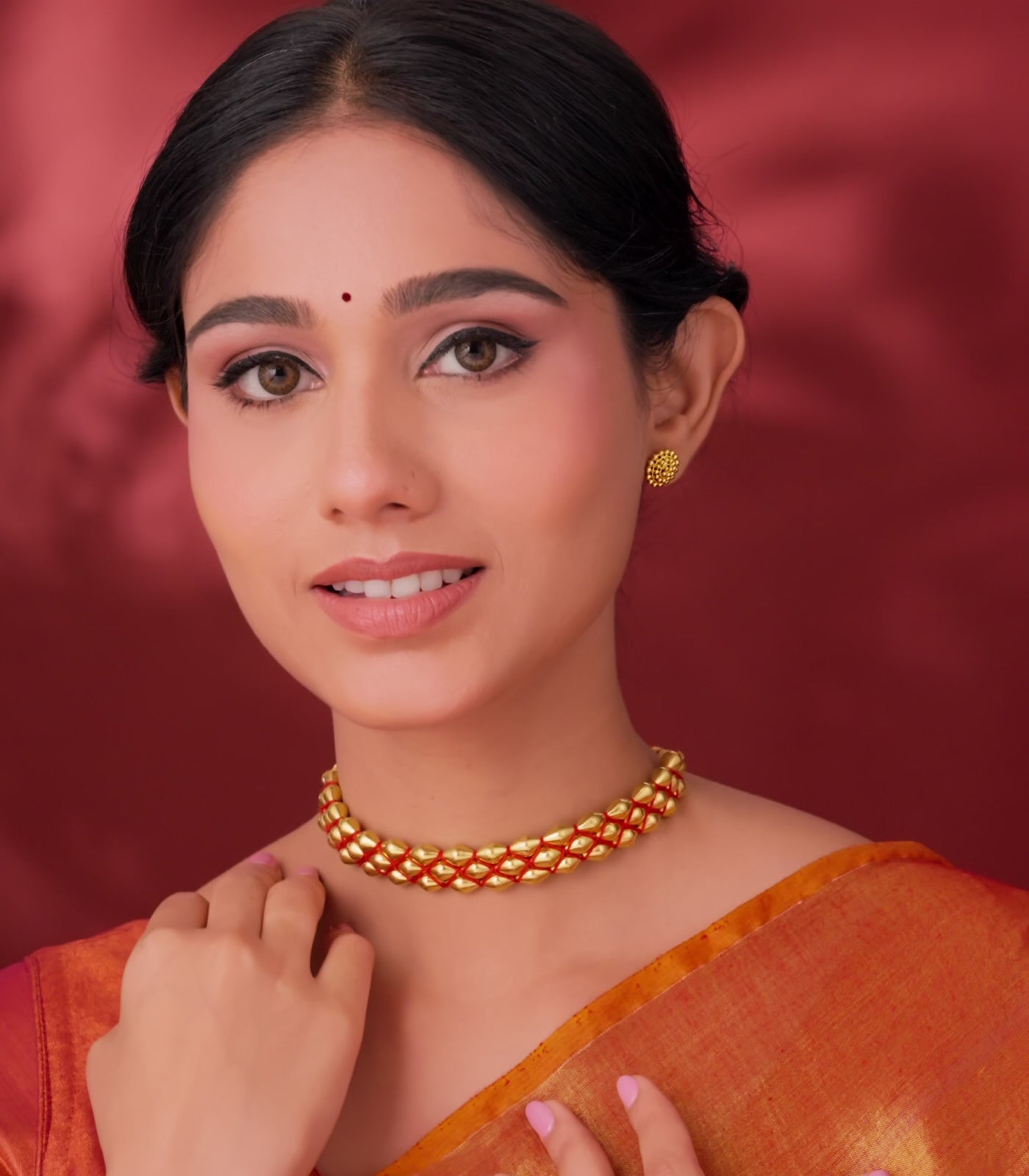 Design: A traditional choker-style necklace featuring intricately designed conical gold beads, symbolizing prosperity and grace.