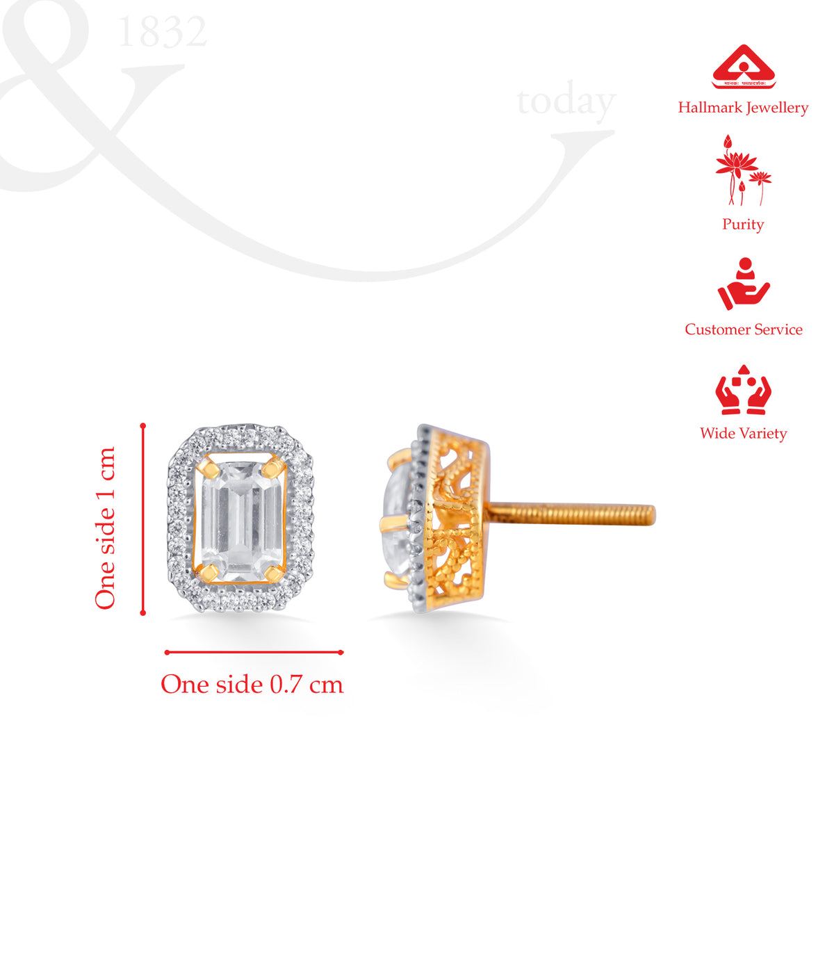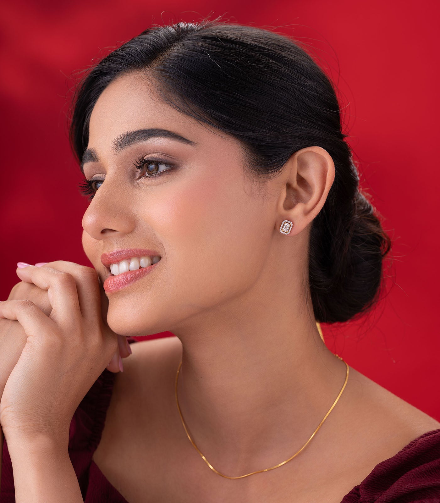 The Emerald Elegance Studs — classic, captivating, and crafted to perfection. Featuring a rectangular-cut stone framed with a delicate halo, these studs embody timeless sophistication.