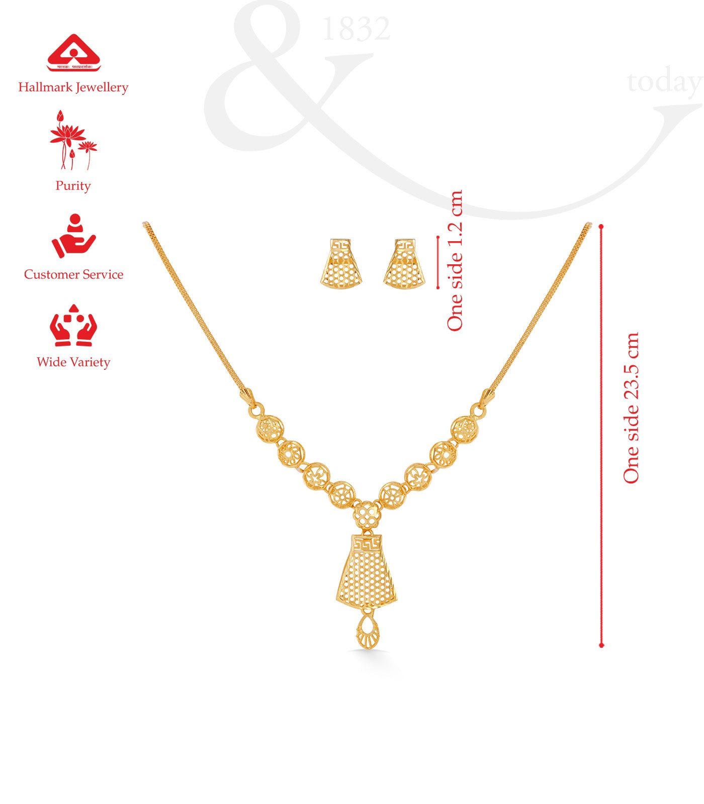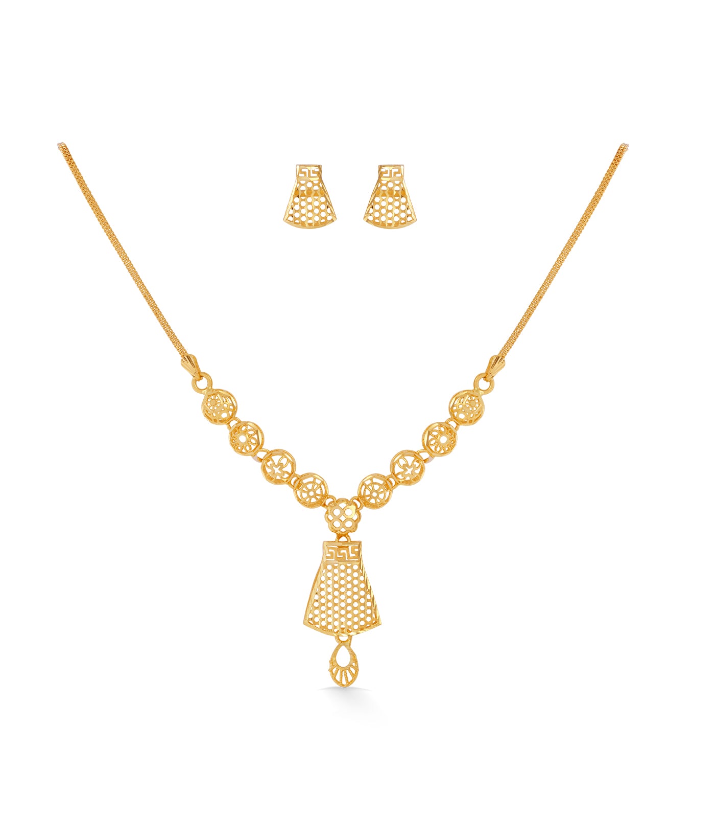 Elevate your traditional style with the Geometric Charm Gold Necklace Set by P.N. Gadgil & Sons. Crafted in 22K gold, this set features intricate circular motifs along the chain and a striking geometric pendant with matching earrings. A perfect balance of tradition and modern artistry, this necklace set adds timeless sophistication to weddings, festive occasions, and cultural celebrations. Designed to be lightweight yet statement-worthy, it makes an excellent addition to every woman’s jewellery collection.