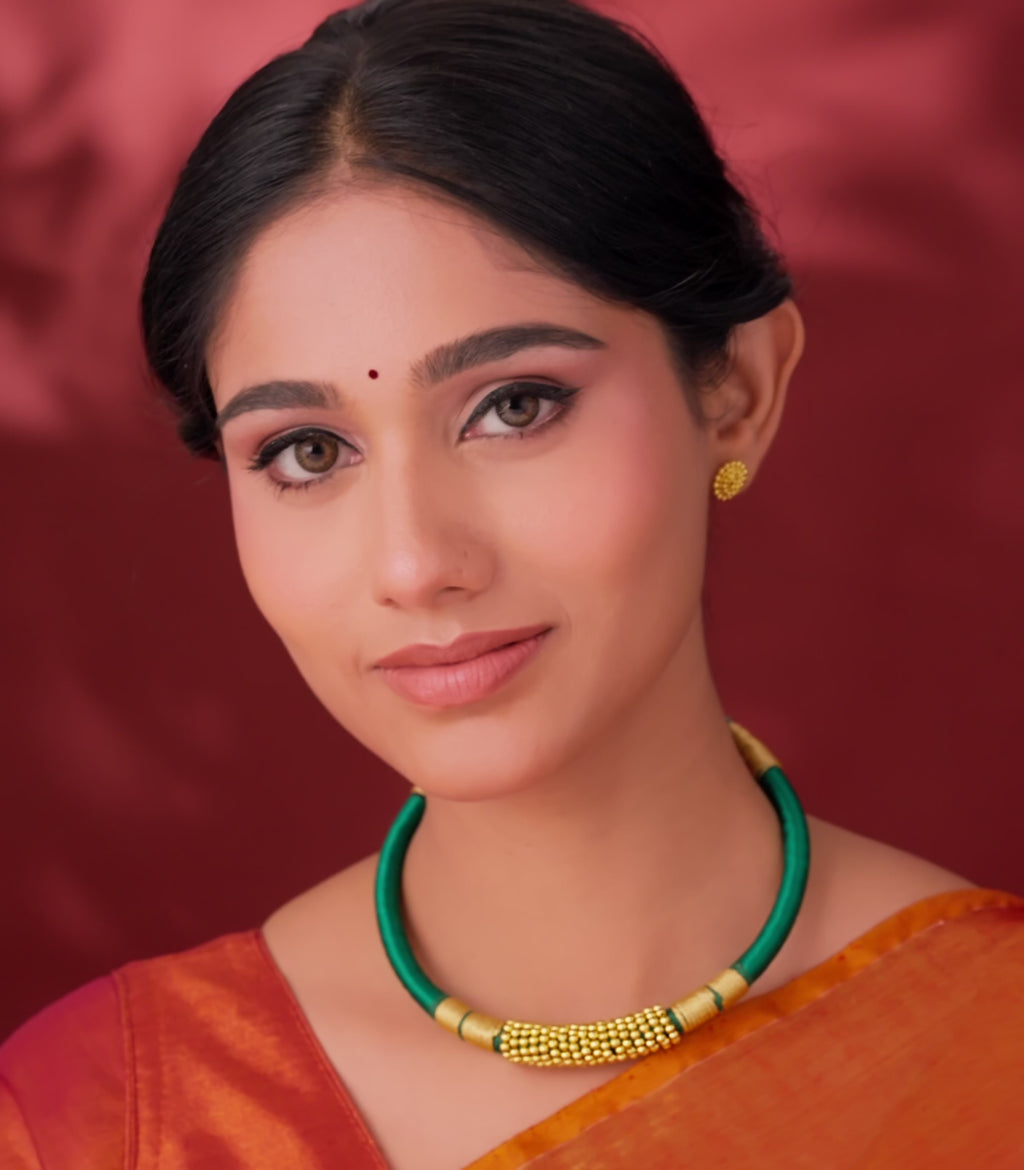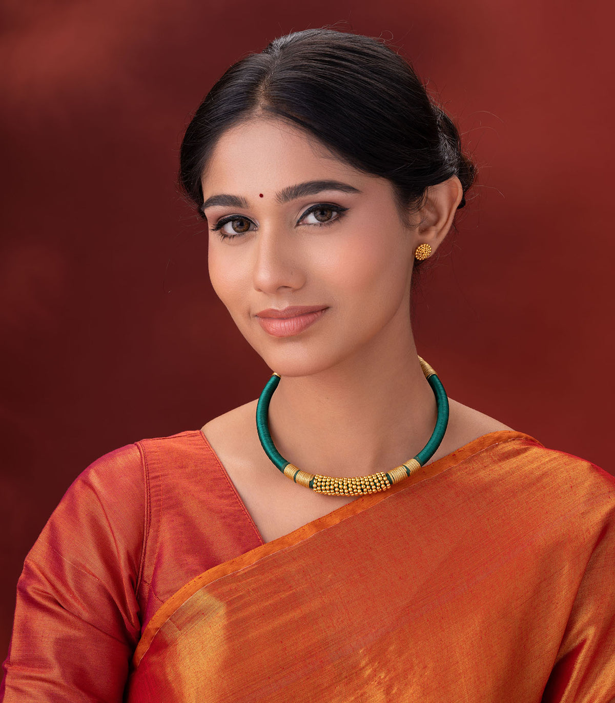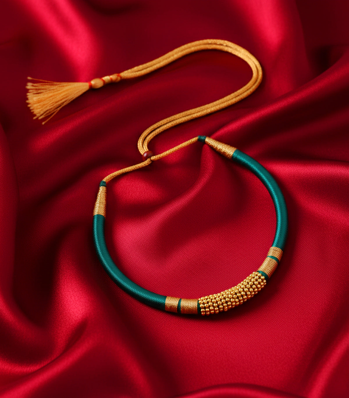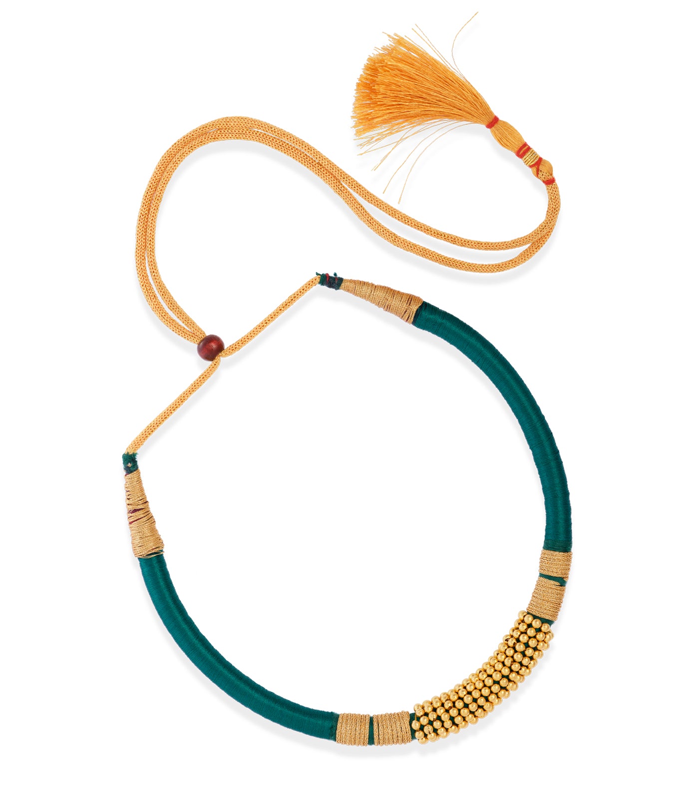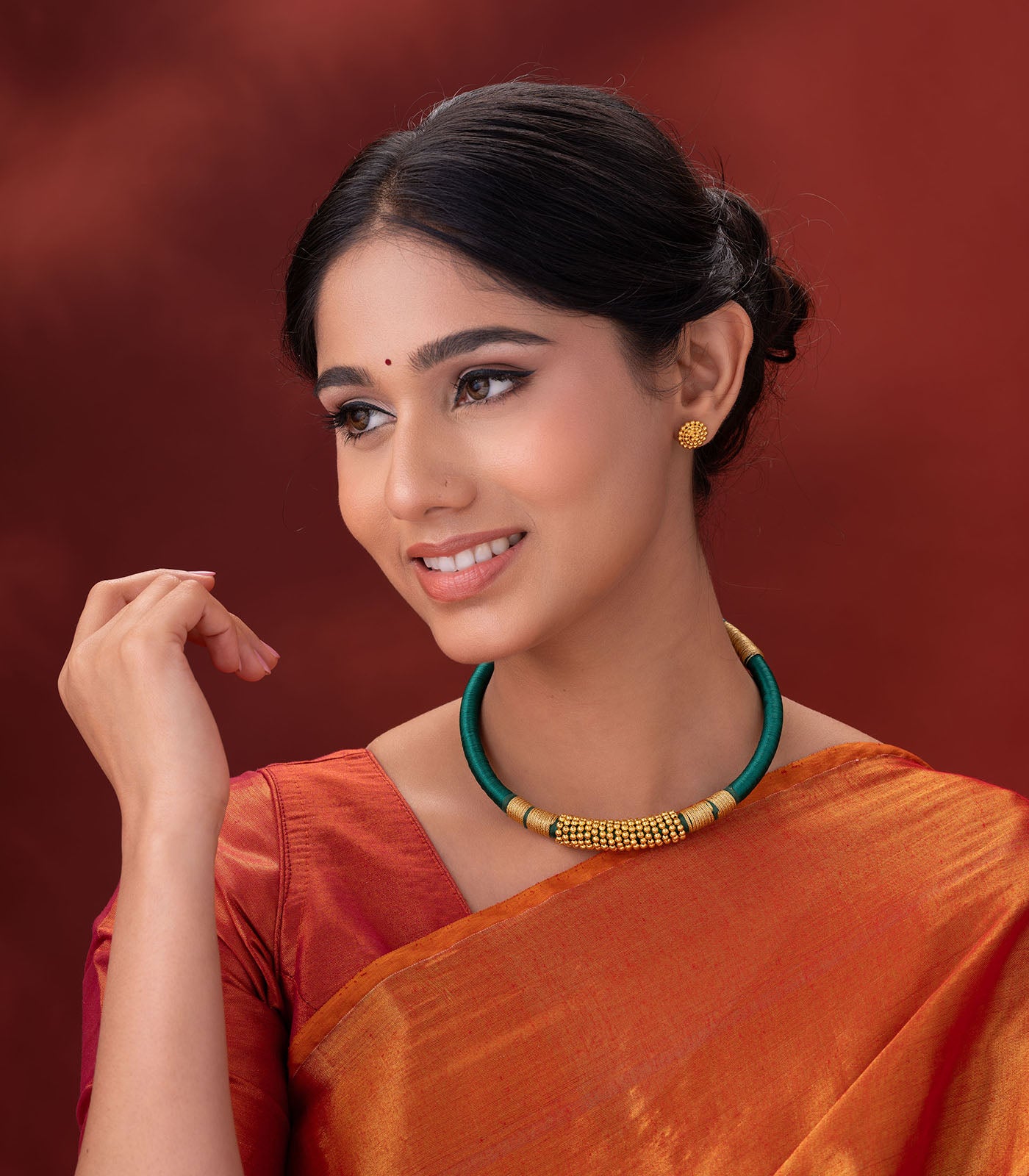 Material: Crafted in pure 22K hallmarked gold, featuring vibrant green thread meticulously intertwined with fine gold beads.
