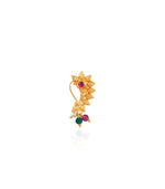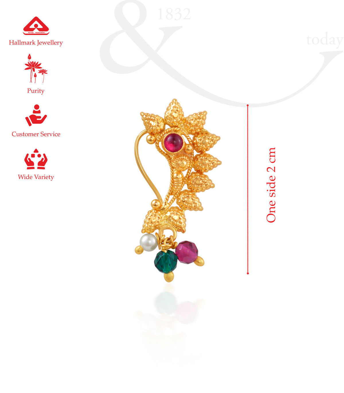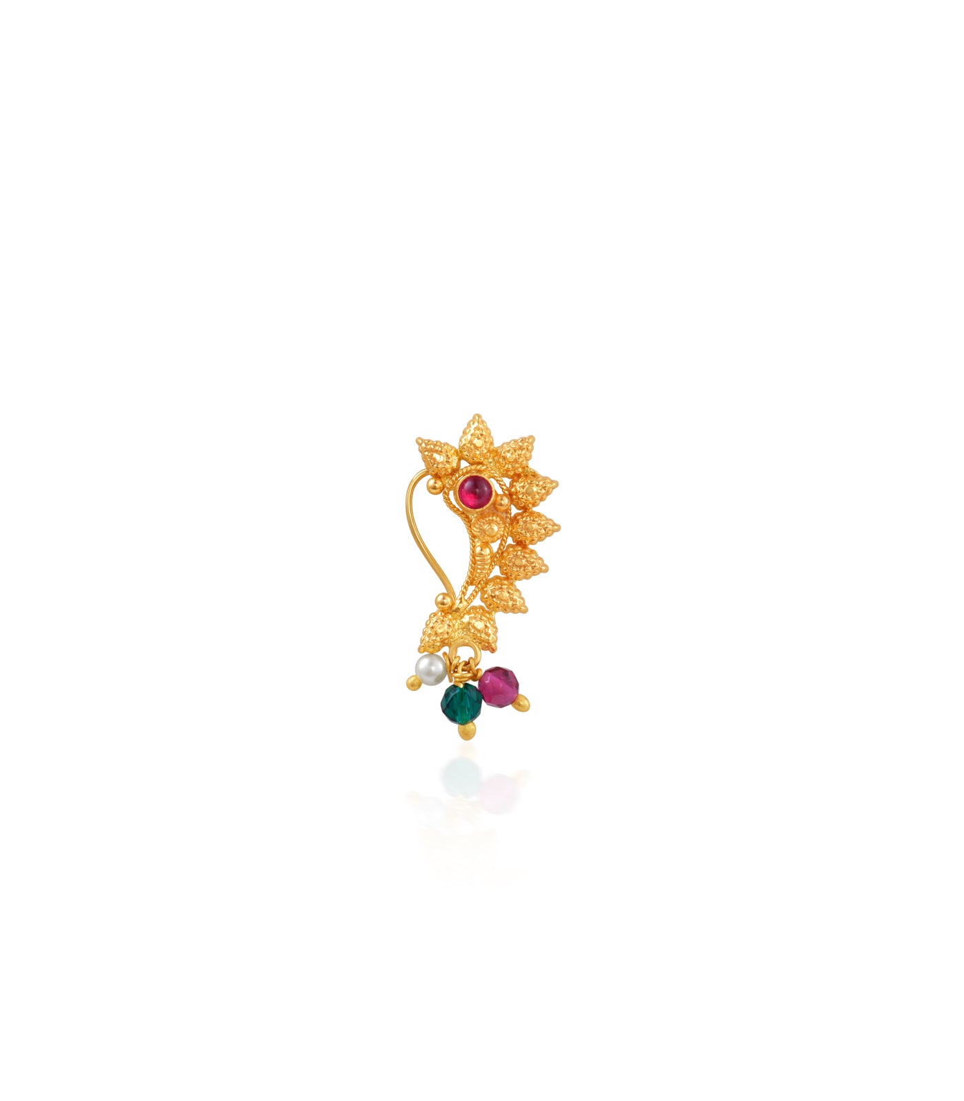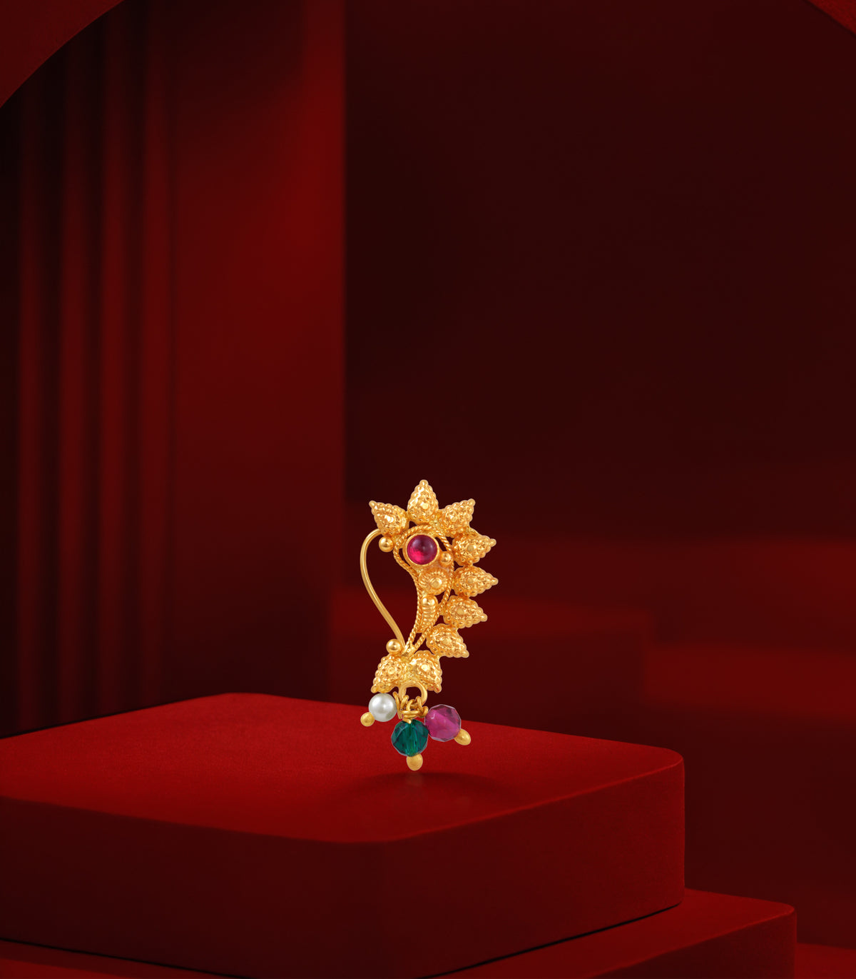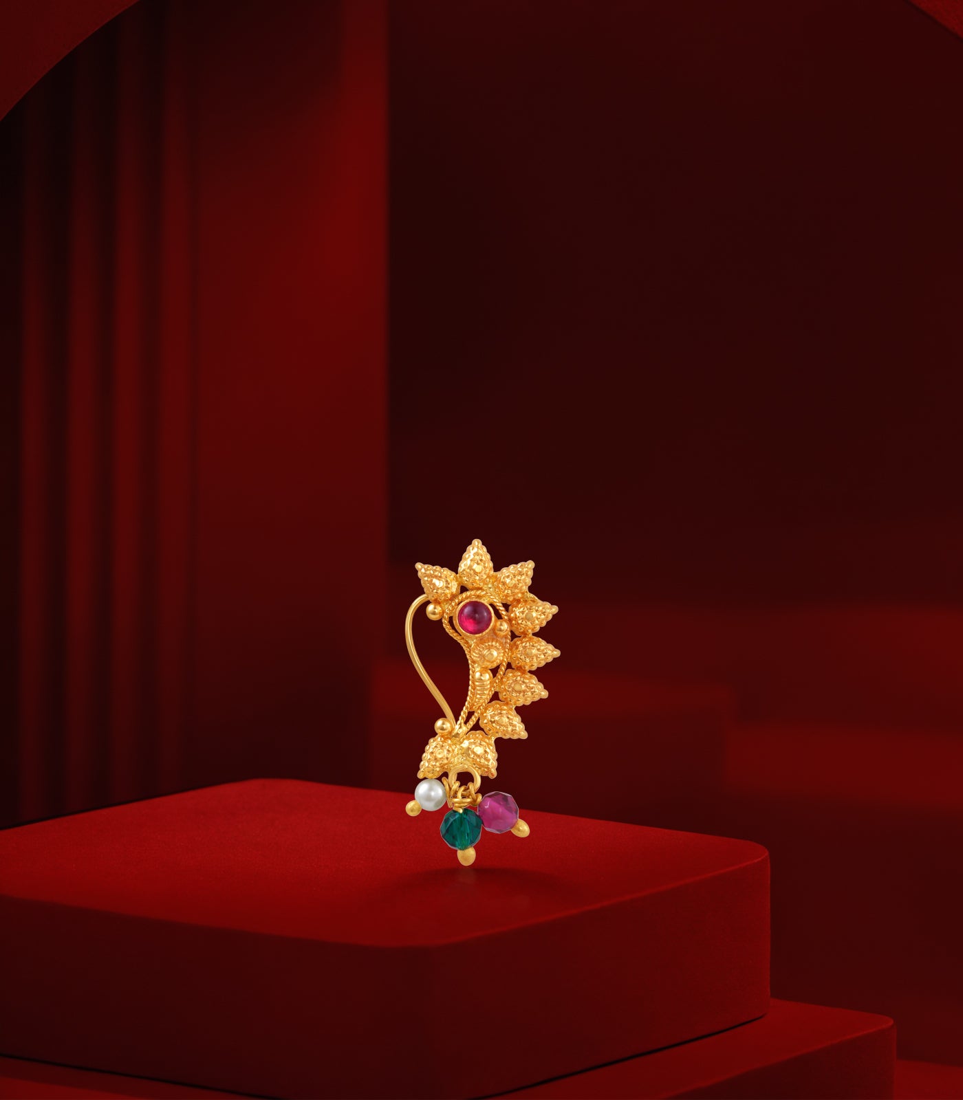 Celebrate tradition with the Swarna Phool Gold Nath by P.N. Gadgil & Sons — a masterpiece that reflects the beauty of blossoming flowers in fine gold. Designed with a floral-inspired motif and a striking ruby-toned centerpiece, this Nath is adorned with delicate pearls and colorful beads, symbolizing prosperity and joy.