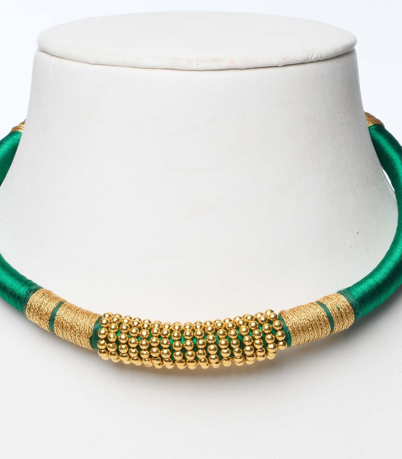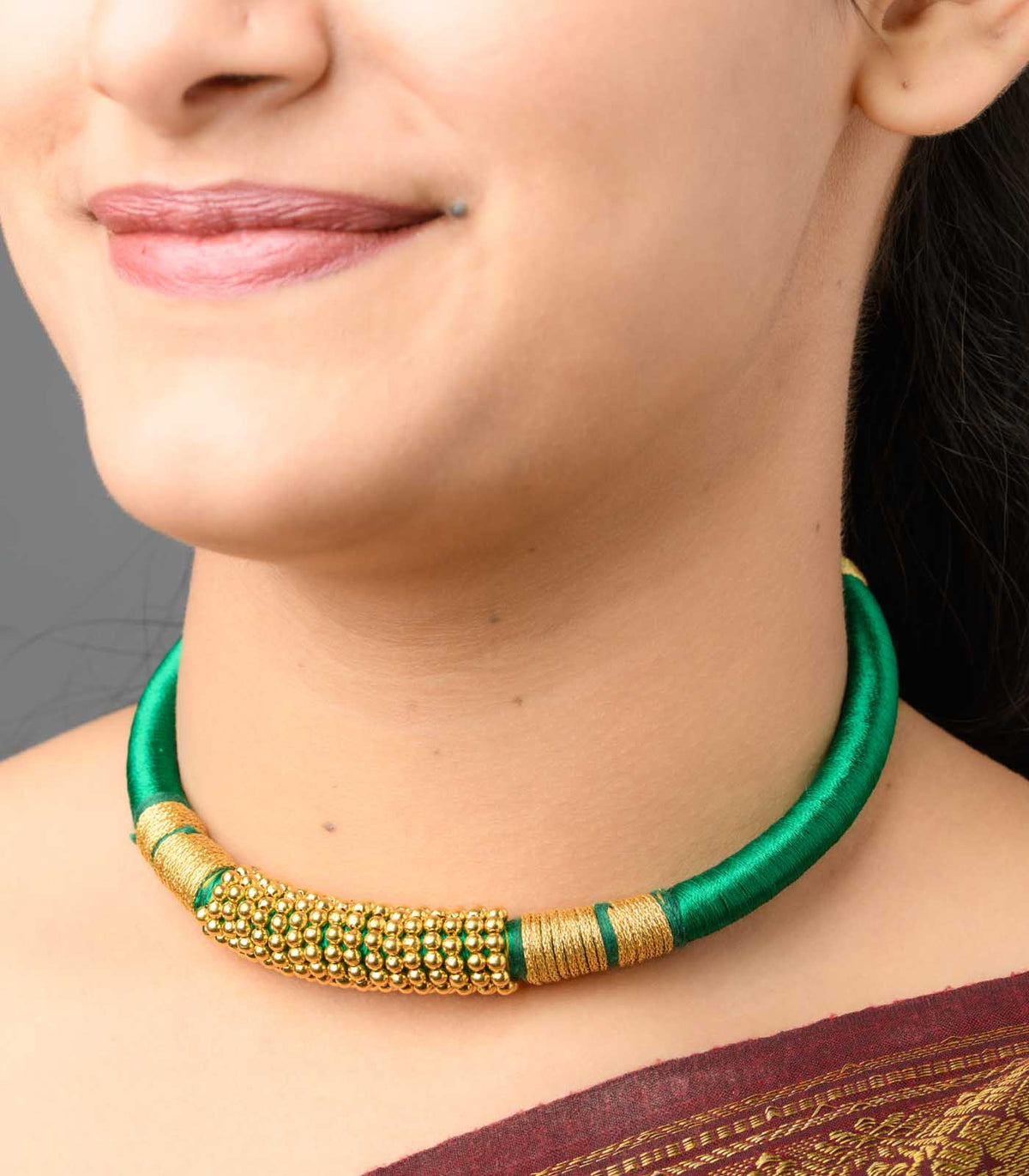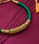 Design: This elegant Goph necklace combines refreshing green threadwork with delicate gold detailing, creating a lightweight, stylish accessory that complements traditional and contemporary ethnic outfits.