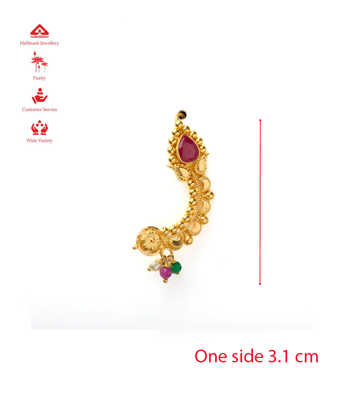 Design: The Nath features a traditional crescent shape embellished with delicate floral and beaded motifs, highlighted by a teardrop-shaped ruby centerpiece and accented with colorful stone danglers.