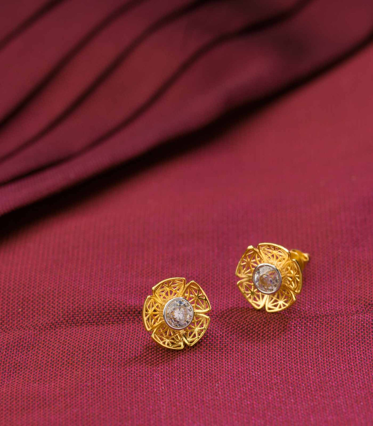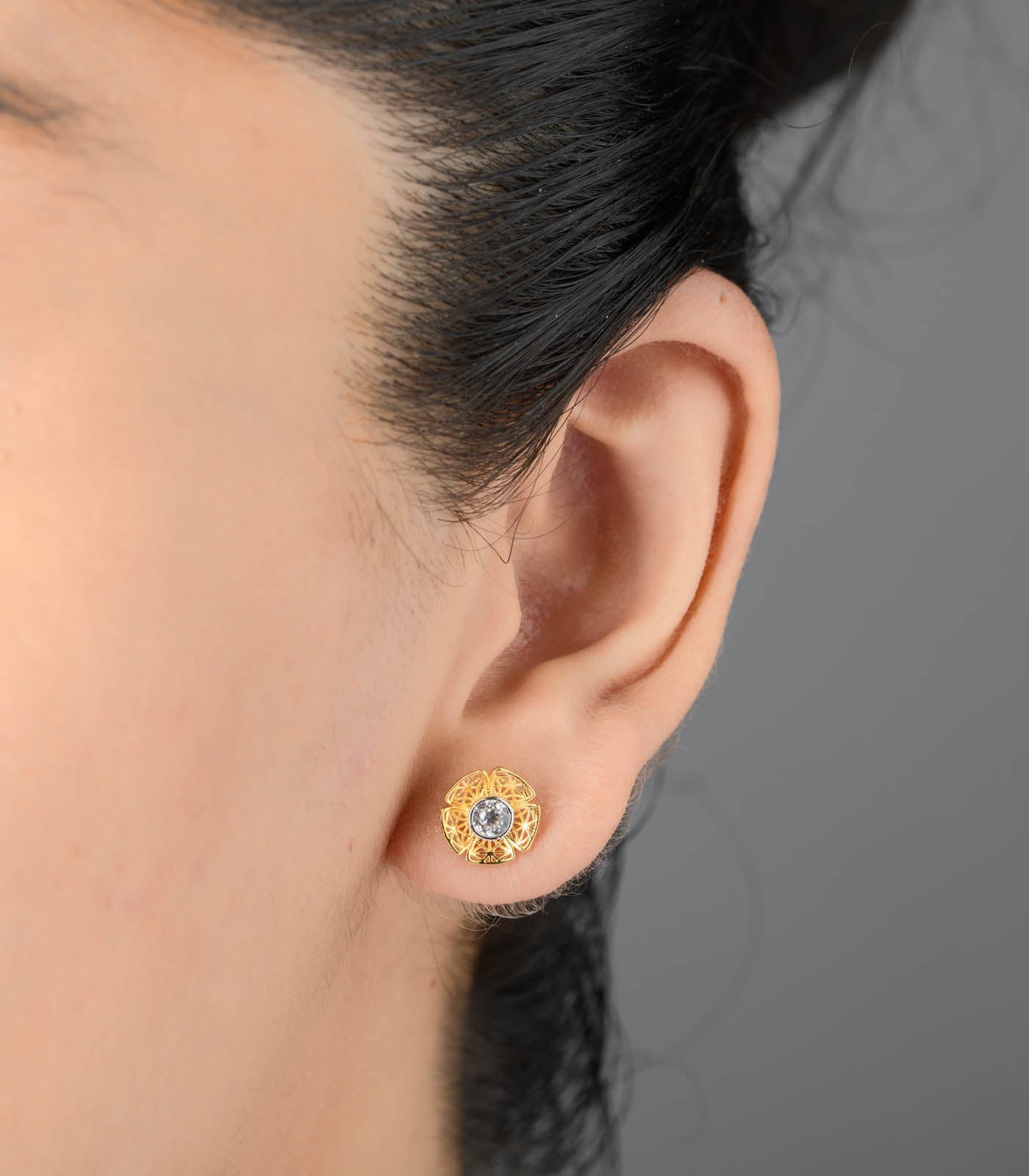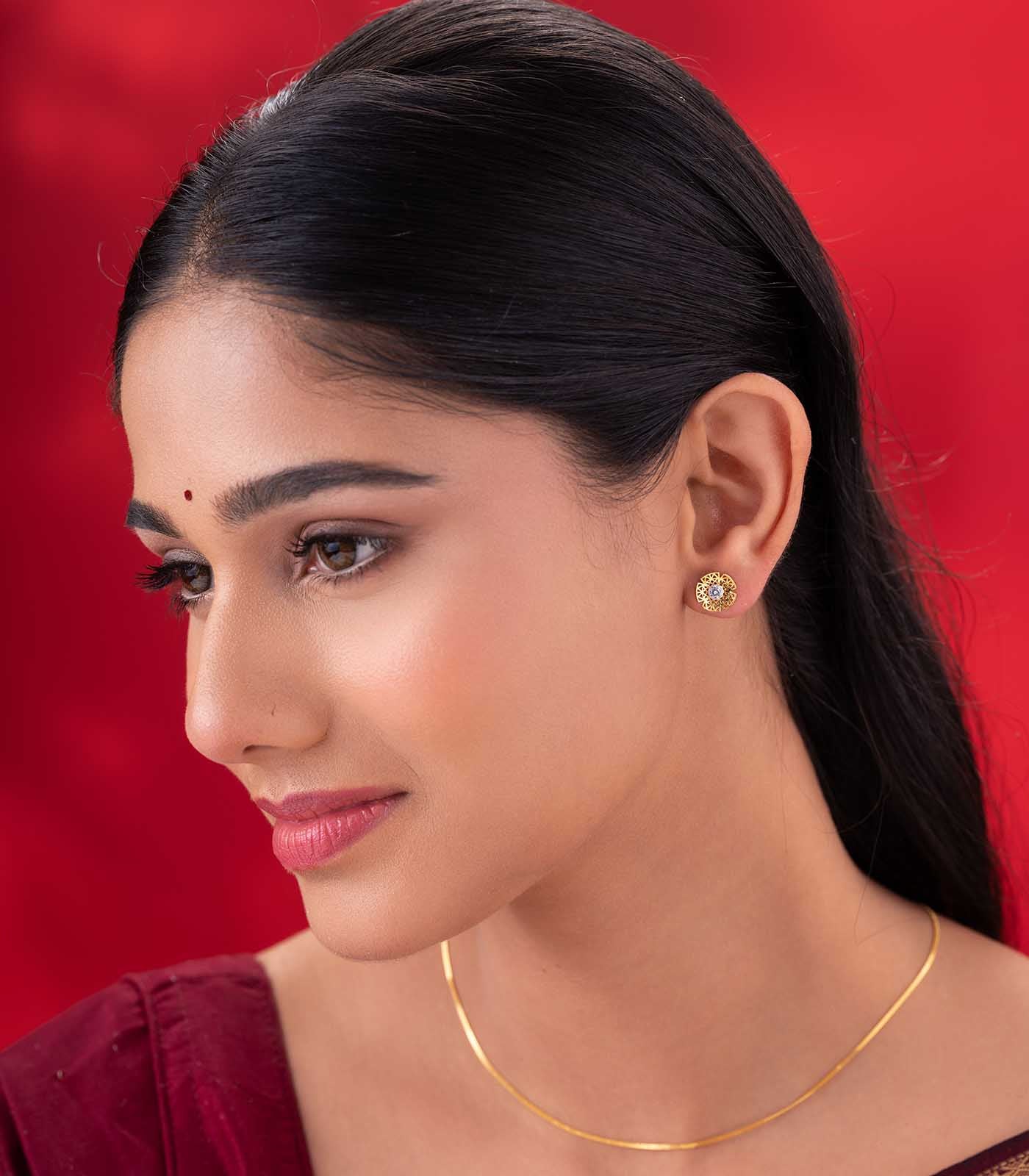 Round Single Stone Tops by P.N. Gadgil & Sons are crafted in 18K gold with a beautifully intricate cutwork design and a brilliant round stone at the center. Lightweight yet striking, these tops bring a perfect balance of minimalism and sparkle, making them ideal for daily wear as well as special occasions.