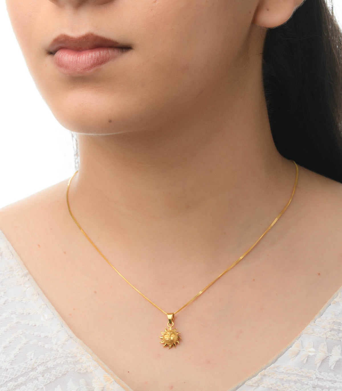 Material: Finely crafted in radiant 22K gold, this pendant captures traditional artistry with unmatched precision. Design: Shaped as Surya Dev (Sun God), the pendant features a stylized face with intricate expressions and sun rays radiating outward, symbolising strength, prosperity, and vitality. Occasion: A powerful choice for spiritual ceremonies, festive occasions, or everyday protection and positivity. Style Tip: Pair it with a simple gold chain to let the divine brilliance shine, whether you're wearing ethnic attire or everyday wear.